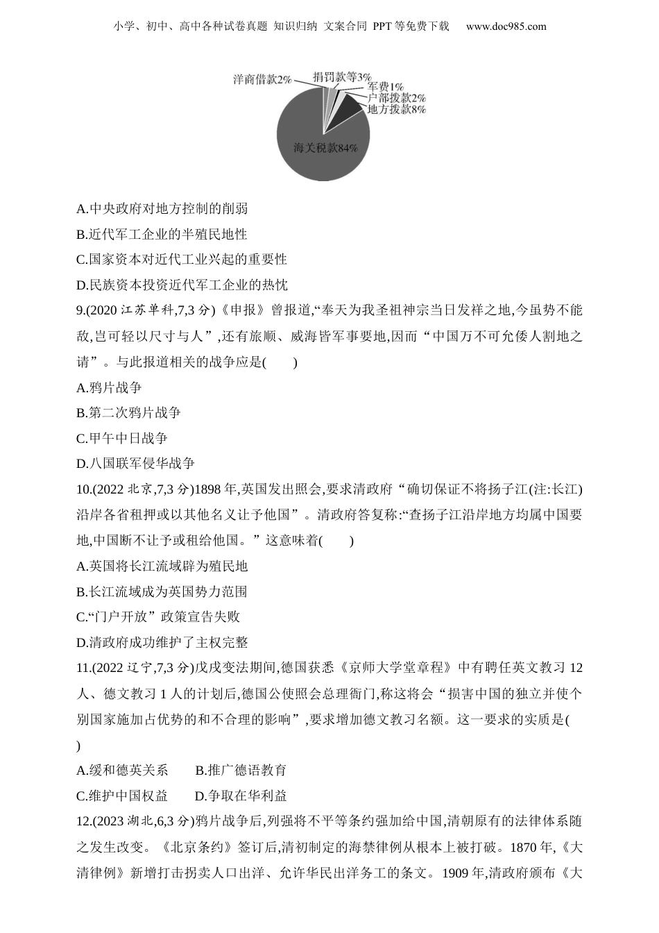 小学、初中、高中各种试卷真题知识归纳文案合同PPT等免费下载www.doc985.com2025新教材历史高考第一轮第五单元从晚清时期的内忧外患到中华民国的建立五年高考考点1两次鸦片战争与列强侵略的加剧1.(2022福建,6,3分)1820年刊刻的《海录》,是中国人编写的涉及世界地理知识的书籍。林则徐曾参考其中的“英吉利”条目,以了解英国国情。据此可知,鸦片战争前后国人的“开眼看世界”()A.延续了清朝传统的对外认识B.革新了士人群体的思想观念C.借助了已有知识体系的积累D.奠定了清朝对外政策的基础2.(2023北京,6,3分)关于鸦片战争,有人认为,“自由贸易者背后的经济能力极其强大,无法遏制或阻挡”“如果在鸦片之外还有其他好的选择,比如说糖蜜或者大米,这场冲突就可能被称为糖蜜战争或者大米战争”。对于上述观点,认识正确的是()①滥用了自由贸易原则②混淆了毒品与一般商品的区别③没有揭示英国发动战争的侵略本质④意在说明英国发动战争是偶然事件A.①②③B.①②④C.①③④D.②③④3.(2023辽宁,6,3分)1842年,清廷拟照英军兵船式样造新船,“并以船炮图说,饬江苏、福建、浙江三省督抚详勘”。浙江巡抚认为现有旧船“虽不能争胜于外洋,尚可牵制于内港”,“与其务高大之名”,不若造“适用之船”,其他督抚亦有相似意见。道光皇帝遂决定“暂缓办理”。这反映出()A.因循守旧思想阻碍革新B.中央与地方矛盾尖锐C.中体西用思想影响广泛D.清政府行政效率低下4.(2022全国甲,28,4分)1846年,上海的进口货值较前一年下降13%,1847年又减少5.4%,1848年更大幅度地下降20.1%。此后虽有回升,但极不稳定,一直到1854年还没有恢复到1845年的水平。这可用于说明,进口货值的下降()A.阻止了自然经济的解体小学、初中、高中各种试卷真题知识归纳文案合同PPT等免费下载www.doc985.comB.导致西方商品倾销重心转移C.促使传统手工业的恢复D.成为列强进一步侵华的借口5.(2022河北,6,3分)19世纪50年代后,各地商人争相到上海采购,逐渐形成若干帮别,其中比较大的有北京帮、东北帮、川帮等,还有来自西北、西南边远省份的规模较小的帮别。各地客帮采购贩运,推动了转批分销业务的发展。材料主要反映了()A.区域经济水平存在差别B.口岸辐射效应显著C.列强资本深入中国内地D.传统商路日趋衰落6.(2023福建,6,3分)19世纪90年代,中国各地的新设民族企业,常到上海、广州、厦门以较高的工资觅雇工人。这一现象可用于说明当时()A.产业工人的待遇丰厚B.资产阶级的救国实践C.通商口岸的产业优势D.晚清政府的政策扶持7.(2021北京,6,3分)读下图,下列表述正确的是()①东南地区通商口岸贸易网络最为密集②“五口通商”中的香港成为贸易中心③天津的口岸贸易在北方居于核心地位④最早开埠的汉口是南北口岸贸易枢纽A.①②B.③④C.①③D.②④8.(2021福建,6,3分)下图为甲午战争前晚清主要军工企业的资本来源构成图。这主要说明该时期()小学、初中、高中各种试卷真题知识归纳文案合同PPT等免费下载www.doc985.comA.中央政府对地方控制的削弱B.近代军工企业的半殖民地性C.国家资本对近代工业兴起的重要性D.民族资本投资近代军工企业的热忱9.(2020江苏单科,7,3分)《申报》曾报道,“奉天为我圣祖神宗当日发祥之地,今虽势不能敌,岂可轻以尺寸与人”,还有旅顺、威海皆军事要地,因而“中国万不可允倭人割地之请”。与此报道相关的战争应是()A.鸦片战争B.第二次鸦片战争C.甲午中日战争D.八国联军侵华战争10.(2022北京,7,3分)1898年,英国发出照会,要求清政府“确切保证不将扬子江(注:长江)沿岸各省租押或以其他名义让予他国”。清政府答复称:“查扬子江沿岸地方均属中国要地,中国断不让予或租给他国。”这意味着()A.英国将长江流域辟为殖民地B.长江流域成为英国势力范围C.“门户开放”政策宣告失败D.清政府成功维护了主权完整11.(2022辽宁,7,3分)戊戌变法期间,德国获悉《京师大学堂章程》中有聘任英文教习12人、德文教习1人的计划后,德国公使照会总理衙门,称这将会“损害中国的独立并使个别国家施加占优势的和不合理的影响”,要求增加德文教习名额。这一要求的实质是()A.缓和德英关系B.推广德语教育C.维护中国权益D.争取在华利益12.(2023湖北,6,3分)鸦片战争后,...