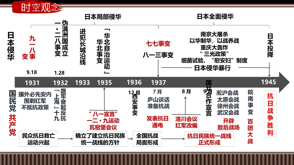 第八单元新民主主义革命时期(1919-1949):中国共产党与新民主主义革命的胜利第20课中民族的抗日华战争(1931-1945)福建省永安三中高中校陈莹要求课标1、了解日本军国主义的侵华罪行;通过了解正面战场和敌后战场的抗战,感悟中华民族英勇不屈的精神,认识中国共产党是全民族团结抗战的中流砥柱;认识中国战场是世界反法西斯战争的东方主战场,理解十四年抗战胜利在中华民族伟大复兴中的历史意义。2、了解中国共产党在抗日根据地的民主制度探索与民族区域自治制度。重点热词1、日本侵华的原因、表现。2、抗日民族统一战线形成的原因、过程。3、正面战场和敌后战场的抗战史实及其评价。4、世界反法西斯统一战线形成的背景、标志、表现。5、十四年抗战胜利的原因和意义。局部抗战、九一八事变、华北事变、一二·九运动、东北抗日联军、西安事变、八一宣言、瓦窑堡会议、洛川会议、南京大屠杀、淞沪会战、平型关大捷、武汉会战、百团大战、《论持久战》、长沙会战、皖南事变、“三三制”原则、《论联合政府》、中共七大、日本投降、十四年抗战空念时观九一八事变9.18西安事变12月伪满洲国成立一·二八事变1.28进犯长城沿线「华北自治运动」华北事变1931193519321937194519331936七七事变八一三事变日本侵华国民党共产党攘外必先安内围剿红军不抵抗政策南京大屠杀以华制华,以战养战重庆大轰炸“三光政策”细菌试验、“慰安妇”制度路军奋起反抗「上海」十九“八一宣言”一二·九运动瓦窑堡会议7月庐山谈话准备抗战发表抗日通电国共合作宣言9月民众抗日救亡运动兴起8月洛川会议红军改编确立了建立抗日民族统一战线的方针抗日民族统一战线正式形成日本局部侵华日本全面侵华日本投降日本侵华暴行全国抗战局面形成淞沪会战太原会战徐州会战武汉会战开辟敌后战场皖南事变百团大战抗日战争胜利知识点1局部抗到全面抗从战战【知识拓展】“十四年抗战”(1931-1945年)的深刻意义“十四年抗战”,就是将抗日战争的起点更改为1931年的九一八事变。这充分肯定了1931年九一八事变到1937年七七事变前,中国共产党领导的抗日战争,特别是东北人民革命军的英勇斗争和其他中国军队的奋起抵抗。“十四年抗战”的提法更能揭露日本侵略者的暴行,强调了中国战场在世界反法西斯战场中的地位,中国人民反抗法西斯,开始的最早,结束的最晚。①有利于完整还原抗日战争的历史全过程。②有利于客观反映中国共产党的中流砥柱作用。③有利于正确认识中国抗日战争在世界反法西斯战争中的重要地位和作用。④有利于全面弘扬伟大的抗战精神。1、日本侵华原因:①根本原因:侵略中国是日本帝国主义的既定方针。②直接原因:资本主义世界性经济危机影响日本。2、日本侵华事件:知识点1局部抗到全面抗从战战一、局部抗战侵华表现国内态度东北①九一八事变(1931.9.18)标志中国局部抗战的开始②1932年3月,日本建立伪满洲国①国民政府:推行“攘外必先安内”方针②民众抗日:_______________坚持抗战③中国共产党:东北抗日联军牵制大量日军上海一·二八事变(1932.1.28)________奋起抵抗,全国民众积极支援东北人民革命军十九路军知识点1局部抗到全面抗从战战一、局部抗战侵华表现国内态度东北华北事变:逼迫国民政府签署了一系列协定,策动“_____________”①民众:1935年一二·九运动。促进中华民族_______②中国共产党:1935年“八一宣言”号召“___________________”;瓦窑堡会议确定____________________的方针华北自治运动新觉醒2、日本侵华事件:停止内战,一致抗日建立抗日民族统一战线3、西安事变:1936年12月12日。西安事变的和平解决,成为扭转时局的枢纽;促进了中共中央联蒋抗日方针的实现;十年内战的局面基本结束,全国__________的局面初步形成。团结抗战知识点1局部抗到全面抗从战战【思维发散】日本侵华的既定方针1927年6月,日本首相田中义一主持召开了制定侵略中国总方针的东方会议,确立了“把满洲从中国本土分裂出来,自成一区,置日本势力之下”的侵略方针。思考据此明日本九一八事的目的是什?说发动变么次的召明了什?这会议开说么问题目的:侵占满洲,进而侵占全国问题:日本侵华蓄谋已...