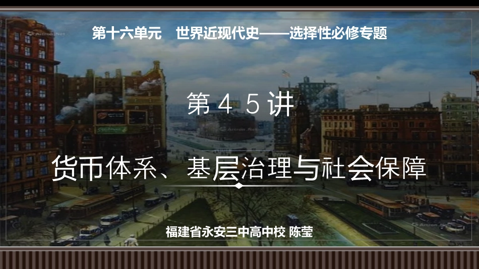 第十六单元世界近现代史——选择性必修专题第45讲体系、基治理社保障货币层与会福建省永安三中高中校陈莹空坐时标17C初1816英国颁布济贫法美国《社会保障法》《中华人民共和国劳动保险条例》英国实行金本位制德国社会保险制度英法美地方自治制度布雷顿森林体系社区自我管理布雷顿森林体系瓦解19C80s近代欧美19351944二战后195120C70s初西方基层治理、货币体系现代社会保障制度知识点1世界体系的形成货币一、国际金本位制(以英镑为中心的国际货币体系)1、背景:①国际:19世纪初,资本主义_____不断扩大,国际间货币结算日益频繁和复杂。②英国:是当时最强大的资本主义国家。2、形成:1816年,英国制定法案,实行_____,其他资本主义国家先后采用。3、特征:①以___为中心,以金币或黄金在国际间流通为主。②各国的金币具有法定的含金量,人们可以根据规定铸造金币,金币可以自由流通,而且不易贬值。4、作用:促进了资本主义生产和_____的发展。5、崩溃:1929年,经济大危机期间,美国政府宣布停止兑换黄金,全面禁止黄金出世界市场金本位制英镑世界经济知识点1世界体系的形成货币金本位制(1880~一战前)材料1:1717年,牛顿建议将黄金价格定为每盎司3英镑17先令10.5便士,将黄金与作为基本货币的英镑挂钩,英国由此成为事实上的金本位制国家。——裴毅菲《英国金融霸权问题研究1816-1914》材料2:战争的胜利(1815年威灵顿将军击败拿破仑)……英国不断为参战国提供枪支弹药等军需用品,以商品为载体,英镑被裹夹其中,慢慢向世界各国渗透。——宋鸿均高强《货币变局》①广阔的海外殖民地和海外贸易提供保障;②英国率先完成工业革命,成为世界工厂;③战争因素。以英镑为中心的原因特征:①以英镑为中心,以金币或黄金在国际间流通为主②各国的金币具有法定的含金量,金币可以自由流通,而且不易贬值黄金充当国际货币,决定各国货币汇率▲1929年被美国民众挤兑的银行门口知识点1世界体系的形成货币金本位制(1880~一战前)材料3:1931年9月底,英国宣布停止黄金支付,停止纸币兑换……1933年春……美国放弃金本位,美元贬值。其他国家也纷纷宣布放弃金本位制。金本位制崩溃后……汇率剧烈波动,使货币金融领域日益陷于动荡和混乱之中。——央视《经济半小时》栏目组《货币战争:真相与未来》后果:世界货币体系失去统一的标准和基础;英国、法国和美国分别构建了以英镑、法郎和美元为中心的货币集团。材料4:即使我们卖掉了我们的全部黄金和国外资产,也不能付清订货的一半贷款。——英国首相丘吉尔知识点1世界体系的形成货币二、布雷顿森林体系(以美元为中心的国际货币体系)1、背景:①国际:金本位制崩溃后,不同货币集团各自为政,不利于世界经济发展。②美国:二战后,美国成为资本主义世界的霸主。2、形成:___年,布雷顿森林会议确立了以___为中心的国际货币体系,即布雷顿森林体系。3、特征:美元与黄金挂钩,各国货币与美元挂钩。4、作用:一定程度上促进了_____,稳定了国际金融;为美国推行_____提供了有利条件。5、瓦解:20世纪70年代初,美国政府宣布停止美元兑换黄金,布雷顿森林体系走向瓦解。后来,固定汇率制被______取代。1944美元国际贸易世界霸权浮动汇率制知识点1世界体系的形成货币布雷顿森林体系(1944~1971)背景:①第二次世界大战严重削弱了英国等欧洲国家;②美国成为资本主义世界的霸主。▲二战后英国的废墟▲美国曼哈顿金库材料5:战后初期,美国的经济、军事实力在全世界处于绝对优势。从经济方面说,它虽然只占有全世界6%的人口和土地面积,却占有资本主义世界工业生产量的2/3,外贸出口额的1/3,黄金储备的3/4,战后成为最大的债权国。——刘绪贻等《战后美国史》知识点1世界体系的形成货币布雷顿森林体系(1944~1971)内容:▲黄金▲美元▲各国货币美元与黄金直接挂钩1盎司黄金=35美元其他会员国货币与美元挂钩同美元保持固定汇率关系稳定国际汇兑提供国家贷款削减关税壁垒影响:①一定程度上促进了国际贸易,稳定了国际金融;②为美国推行世界霸权提供了有利条件。知识点1世...