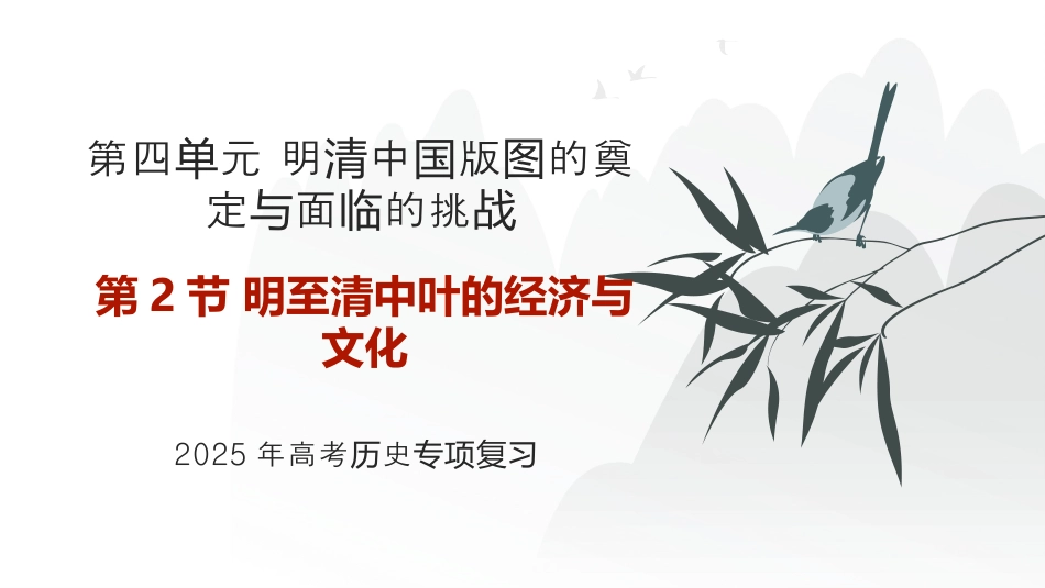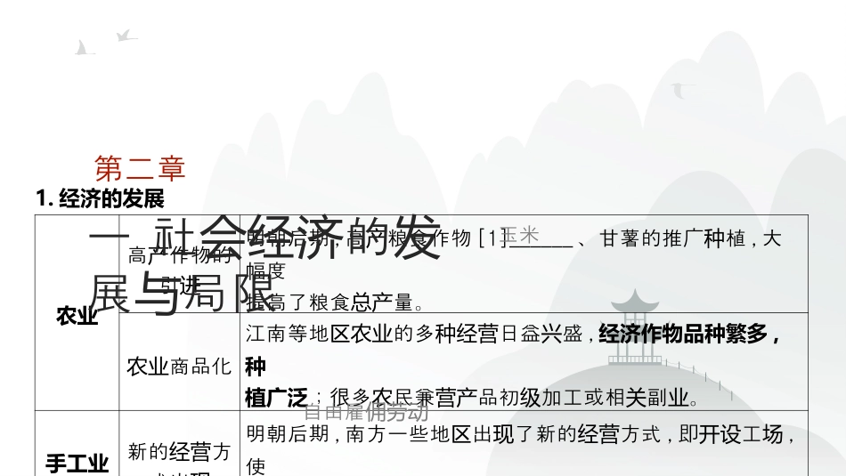 第四元明中版的奠单清国图定面的挑与临战2025年高考史历专项复习第2节明至清中叶的经济与文化教材知识萃取1.经济的发展农业高作物的产引进明朝后期,高粮食作物产[1]______、甘薯的推广植种,大幅度提高了粮食量。总产商品化农业江南等地的多日益盛区农业种经营兴,经济作物品种繁多,种植广泛;很多民兼品初加工或相副。农营产级关业手工业新的方经营式出现明朝后期,南方一些地出了新的方式区现经营,即工开设场,使玉米自由雇佣劳动一社的会经济发展局限与第二章商业白流入银美洲等地的白通海外易大量流入银过贸,促了途和大进长额贸易的展发,也有利于商本的集聚。业资商出帮现一些地方形成力雄厚的商人群体实,如安徽的徽商和山西的晋商。工商市业镇起兴以[3]______功能主的工商市起为业镇兴,商活业跃,人口密集,成地易的核心。为区贸网络表续经济第三章(1)促了白化,足了的需求。进银货币满国内对货币(2)促了商展、市大和、手工的化生,促了本主进业发场扩农业业专业产进资义萌芽的生。产(3)推了制度的改革。动赋税2.局限(1):男耕女、自自足的经济织给传统[4]__________占据倒。还压优势(2)政治:制治制和阻碍着社的步和型。专统压会进转小农经济白银流入对中国的影响1.思想领域的变化(1)明中期——王心形成陆学兴起①程朱理得官方尊崇后学获,逐失去活力。渐②明朝中期,王守仁在南宋九思想的基上陆渊础,提出一套以“[5]________”核心的理为论,形成王心。陆学内容“良知”就是藏在每人心中的“天理”隐个,往往被私欲遮蔽,需要重新发、现充和行扩践,就可以到境界。这样达圣贤评价①强调主观能动性,激人立志。励们奋发②以自己的心准内为则,又含一定的隐[6]______和叛逆色彩。致良知平等二明至清中叶的文化(2)明后期——李的思想贽(3)明末初——思想界的活清跃(1)背景:城市商品经济繁荣,社活丰富,文化知一步普及。会娱乐动识进(2)小说时间作者作品评价元末明初施耐庵《水》浒传我最早的部篇白小国两长话说,了开创[9]________的作体裁。写中罗贯《三志通俗演》国义明朝中期承恩吴《西游》记神小的杰作。话说朝中期清敬梓吴《儒林外史》刺小的杰作。讽说曹雪芹《》红楼梦是我古典国[10]__________文的高学峰。章回体主现实义2.小说与戏曲(1)物和社基:封建展,商品活;市民大,自由念质会础经济发经济跃阶层壮观增强,精神生活的需求增加。对(2)史基:悠久的史文化,大的社背景,丰富的趣事。历础历庞会闻轶(3)科技文:印刷技的步,坊的展,小体例的步。艺术进书发说进(4)作家人:丰富的生活,博的知水平,深邃的精神世界。个阅历渊识明清小说的发展趋势和新内容(1)展:平民化、大化、通俗化。发趋势众(2)新容:注重商人的描;反封建、反,追求性自由解放。内对绘礼教个明清时期小说创作繁盛的原因(3)曲戏传奇作向篇化创趋长,情更加曲折。节复杂代表作家有明朝汤显祖、清朝孔尚任等。昆曲源于江昆山一期流行。发苏带并长京剧道光年间,以徽班基为础,融合徽、二汉调,吸取昆曲和其他地方的戏艺术成分,形成了京剧,逐成全最流行的。渐为国剧种3.科技传统科技①明朝后期,李珍的《本草目》、徐光的《时纲启[11]__________》和宋星的《天工物》,分系了中古代、、工应开别统记载国医药学农学艺的相知,在各自域科技行了。学关识领对传统学术进总结②徐弘祖的《徐霞客游》是一部地理和地名著。记质学西学东渐明朝后期以意大利人[12]________代表的士前中为传教来国传教,在一定范播了西方科技知。围内传识朝前期清士用洲技传教运欧测绘术,助廷制了精确的全帮清绘较为国地政全农书利玛窦明清科技的特点(1)段看从阶:入全面期。进总结时(2)影看从响:科技仍于世界先地位。传统处领(3)容看从内:吸收了西方的部分科技成果。教材素材变式1.[接中外史要(上)链历纲P82-83]下表是代乾隆年河北地的志中有玉米植的。据此可知,清间区县关种记载当河北地时区()述记出处玉蜀秫,土人不多种,惟圃有之园间乾隆《志》献县玉米,家有之园间乾隆《安志》肃县土人呼包米……圃中多之称为园种光《亭志》绪乐县DA.土地源得到充分资开发B.高作物始大量引产开进C.生注重精耕作...