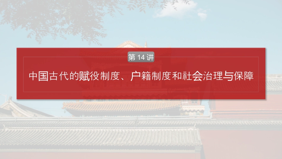 第六单元中古代史性必修通国选择贯中古代的役制度、籍制度和社治理保障国赋户会与第14讲课程标准1.了解中古代役制度的演和以役征首要目的的籍制度,国赋变赋发为户以及有代表性的基管理。层组织2.知道中古代王朝在社救和方面采取的重要措施。国会济优抚内容导航一梳理必备知识二突破关键能力三课时精练梳理必知备识落基性实础知识点一相辅相成——中国古代赋役制度与户籍制度1.中古代役制度的演国赋变朝代制度特点秦田、人、徭役赋头税役繁重赋汉制度编户舍地而人税魏晋租制调均田制配合与唐朝初期租庸制调庸代役纳期晚法两税主;化名目,大收象财产税为简扩税对宋募役法官府募人代役明一鞭法条化名目;用收简银两税清丁入摊亩除人废头税2.中古代籍的演国户变战国(1)家大模排民,制定籍国规编户户(2)公元前375年,秦公以五家献为“伍”的法排口办编户秦朝行分登制度,除一般百姓的籍外,有宗室籍、宦籍、实类记户还市籍等朝汉(1)丞相主管全籍工作,各地方政府均有人主管籍国户级专门员户(2)是政府征派役的位,百姓入籍后,成了封建家的户赋单编户国“民编户齐”,政府定期行人口进调查(3)末年,籍散东汉户乱隋唐(1)隋命州官县“大索貌阅”,重新核定籍户(2)唐承隋制,籍三年一造户宋籍分主客。主指有土地、的,客指户户与户户拥缴纳赋税税户户有土地的佃没户元朝(1)口型比,按分,户类较复杂职业划统称为“色诸户计”(2)一旦定籍,世代相,不得袭变动明朝(1)承了元朝以定籍的做法,籍分民籍、籍、匠籍继职业户户军等(2)明朝籍户册称“黄册”,以里甲制基,每里一,列各为础册详人口、田土、房屋户朝清(1)普通籍基本沿明制,籍管理相松弛户袭户对(2)前期,役行固定丁、丁入后,籍的作用大清赋实银摊亩户为削弱(3)乾隆年,籍永停,政府只是按照一定的制度登间户编审组织人口量记数针对训练1.(2023·福建部分校学10月考试)下所示里耶秦中的一有图为简记录则洞庭郡陵陵十七居民徙至都关迁县启乡户迁乡(同陵属迁县)后籍户产生的案例。一可用争议这记录于明秦朝说A.基自治特征著层组织显B.民具一定徙自由众备迁C.籍登信息翔户记较为实D.皇未延伸至以下权县级廿六年五月辛巳朔庚子,陵启乡□敢言之;都守嘉言渚里乡□□劾等十七徙都,皆不移户乡年籍。令曰移言,今之,劾等徙问□告都,书乡曰陵未有某启乡(牒)毋以智(知)劾等初至产今年,数□□□□令,都其劾等年。敢谒乡问数言之。□陵守垂敦孤告都主,以律令事。迁乡从注:中的图“□”表示文字因模糊、缺而残难以。识读√据材料信息可知,里耶秦了人口移后生的籍,简记录迁产户争议问题容包括移、文牒等容,明籍登信息翔,故内迁时间内说户记较为实选C;项材料体政府籍制度有格的管理,无现对户严并“基自治层组织”的信息,排除A;项材料强人口移后的籍,民具一定的移自由不能完调迁户争议众备迁并整括意,排除概题B;项同陵的移形成了籍,明皇以下有影,排属迁县迁户争议说权对县级响除D。项2.有者指出,中的,合几千年的史之,以最大多的学国赋税历观数农民所担的田、、力役基本,代化而成形式;负税军赋为随时变为种种自此以外的,最初无有,后逐生,逐。下中税来渐发渐扩张边结构图①②③正确的是处填写A.①“民税资”②募役法③“科差”B.①租制调②“科差”③“金花银”C.①租庸制调②更卒、戍卒③地丁银D.①租制调②“金花银”③丁入摊亩√北魏的制度租制,故赋税为调①入租制;填调元朝在粮外又有前朝有的税没过“科差”,按之上下征收和,户丝银两故②入填“科差”;明朝正年,江南部分粮折征收送赴北京,统间税银称“金花银”,故③入填“金花银”;选择B符合意。项题知识点二管理智慧——中国古代的社会治理与保障1.基层组织秦汉(1)下和里县设乡(2)三老,掌化;夫,掌、;游徼,掌捕乡设教设啬狱讼赋税设。里里正盗设(3)、里之外有亭,亭,政令和治安乡设长负责传递维护唐朝以百里,五里,城坊,郊外村,里正、坊正、户为为乡内设设设村正明朝行里甲制,十一甲,一百一十一里,甲首、里实户为户为设长2.社治理会(1)特点:注重建立基民的自我管理相互督机制。层众与监(2)演变秦汉行什伍,以五家伍,十家什,百家里,互相督...