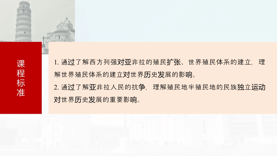 第十六单元工革命期业时:工革命、克思主的生和世界业马义诞殖民体系的形成本主世界殖民体系形成非拉民族立资义与亚独运动第52讲课程标准1.通了解西方列强非拉的殖民、世界殖民体系的建立,理过对亚扩张解世界殖民体系的建立世界史展的影。对历发响2.通了解非拉人民的抗,理解殖民地半殖民地的民族立过亚争独运动世界史展的重要影。对历发响考情分析1.率型:部分是高考中考点,和非均有涉及频题该频选择题选择题2.情境:以文字料、表、漫、地等多体命情设计资图画图种载创设题境,如(2023·山卷,东12)世界殖民体系;(2023·北京卷,14)拉丁美洲立;独运动(2023·宁卷,辽14)洲醒;亚觉(2022·海南卷,12)世界殖民体系3.核心考向:本主世界殖民体系的形成、特点和影;非拉民资义响亚族立的特点意独运动与义整体感知内容导航一梳理必备知识二突破关键能力三链接高考热点四课时精练梳理必知备识落基性实础1.拉丁美洲的殖民地化(1)概况知识点一资本主义世界殖民体系的形成西班牙①1496年,在海地建立了第一永久性殖民地多明各个圣②16世中叶,除巴西之外的大部分南美洲、整中美洲纪将个和部分北美洲成了自己的殖民地变葡萄牙建立了巴西殖民地完成18世期,拉丁美洲已完全于洲列强的殖民治之下纪晚处欧统(2)治统政治行制治,推行奴制实专统农经济①展植,掠了巨富;发种园经济夺额财②弥力不足,为补劳动殖民者展黑奴易;发贸③宗主禁止或限制殖民地同任何其国他家行易,限制殖民地的展国进贸经济发其他殖民者奴役和屠印第安人,造成后者大量死亡杀(3)影响(必选3·第7课)族群印第安人量的,洲人和非洲黑人量的激增,迅速数锐减欧数改了美洲的人口,出了新的族群变结构现文化展洲文化主、融合多文化因素的新的美洲文化,如发欧导种墨西哥城三文化广场2.洲殖民地半殖民地亚沦为(1)第一段阶(15、16世纪)葡萄牙建立商站,控制商路。到16世中叶,葡萄牙已在洲纪经亚建立了包括中澳在的几十商站国门内个西班牙入侵菲律,其成了殖民地宾将变(2)第二段阶(17世至纪19世末纪20世初纪)地域家国概况南亚英国①通印度公司,采取直接掠、侵占土地、强过东抢征土地、植走私片等手段,掠了大量税种并鸦夺财富和巨利;额润②挑印度人打印度人,坐收利;动渔或者直接行武力侵略;进③到19世中后期,几乎纪控制了印度全境地域家国概况南东亚荷兰17世初,侵入印度尼西,建立了巴纪亚达维殖民地,后,占了整印度尼西亚来领个亚英国到19世末,甸和半的大部分纪将缅马来岛变成殖民地法国侵占了越南、柬寨和老埔挝美国西班牙手里得菲律从夺宾地域家国概况西亚英、法、俄等国18世末纪19世初,在斯曼帝大纪奥国扩力范,分割土势围领俄、英不但控制了伊朗的和政,分在经济内还别伊朗北部和南部分力范划势围东亚美列强欧迫使政府了一系列不平等,使清签订条约中逐步半殖民地半封建社国沦为会日本1910年,了朝半吞并鲜岛3.西方列强瓜分非洲4.洲殖民者的文化侵略欧(必选3·第12课)(1)含:殖民家向被殖民地出民主、自由、人等价及基督义国区输权值观。教(2)目的:改造甚至消被殖民地的文化,淡化其民族意,到殖民灭区识达目的。(3)果:被侵略的民族不同程度地接受了外文化,但也努力保自己结来护的文化,使自身文化呈出新的多性。传统现样5.世界殖民体系的形成(1)原因:在向本主的渡中,本主各越越要求占更垄断资义过资义国来独大的商品市、原料地和投所。场产资场(2)形成:19世末纪20世初,本主世界殖民体系最形成。纪资义终(3)影响系国际关帝主家之的加,孕育着新的更大国义国间扩张与争夺剧的冲突世界系联世界上几乎所有家和地都被卷入本主世界市国区资义场中,世界越越密地一体当来紧连为世界格局形成了人史上由少本主家奴役和控制世界类历数资义国上大部分土地和人口的不合理的绝极状态斗高争涨殖民治和掠殖民地半殖民地人民了深重的灾统夺给带来,被迫人民的反抗斗不高难压争断涨1.阐释·核心概念总督制度总督一般由西班牙国王信任的大贵族担任,是国王在殖民地的全权代表,根据国王训令,掌握殖民地的行政、军事、财政和宗教等事宜,有权任命管区内的官吏和教会负责人,参与审理重大司法案件。2.挖掘·教材信息阅...