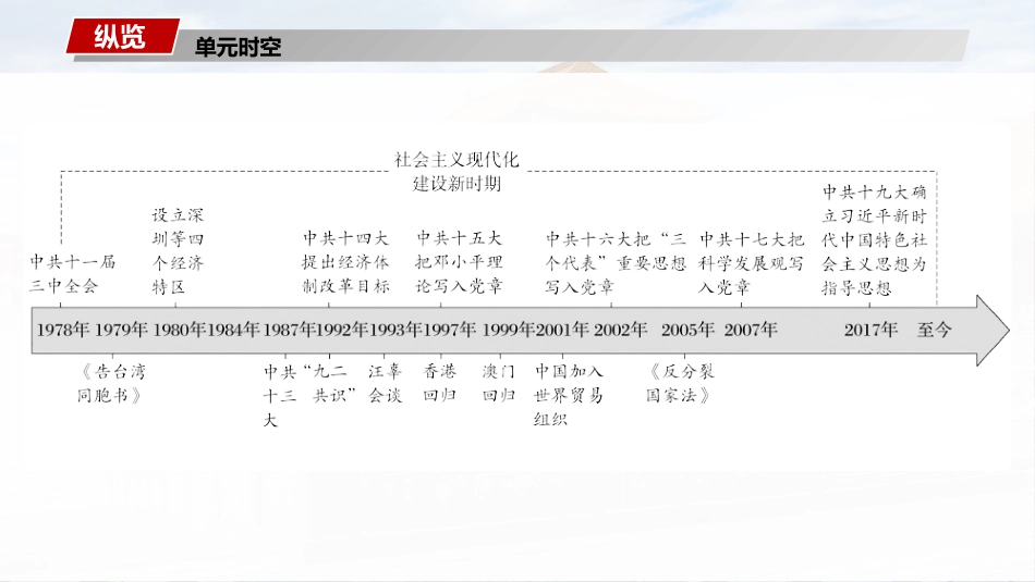 第十二单元社主代化建新期中特色社主新代会义现设时与国会义时单元时空纵览阶段特征横联1978年改革放至今,是中社主道路的社主代化建新期开国会义会义现设时政治与外交政治:社主民主法制会义建得到恢和展,“一设复发制”促了祖一大国两进国统的展业发外交:全方位外交布局彰中特色大外交显国国经济改革放新期,逐形成了社开时渐会主市体制和全方位的外义场经济对放格局,民保持着快速增开国经济,基建走在世界前列长础设思想科教文化以小平理、“三代表”重要邓论个思想、科展和近平新学发观习时代中特色社主思想代表国会义为的中特色社主理体系成国会义论我改革放的思想指南;科为国开技、育、文等全面繁,生教艺荣活、思想放成新期人时尚开为时精神面貌的主要特色们改革放和社主代化建新期开会义现设时第37讲课程标准1.理准的和中共十一三中全的史意。认识真标问题讨论届会历义2.小平理建中特色社主的重要指意;认识邓论对设国会义导义认识“三代个表”重要思想是加强和改党的建、推我社主自我完善和展的强进设进国会义发大理武器;科展是克思主于展的世界和方法的集论认识学发观马义关发观论中体;近平新代中特色社主思想是全党全人民中现认识习时国会义国为实现民族大而斗的行指南。华伟复兴奋动3.中特色社主入新代的重大意,我展新的史方认识国会义进时义认清国发历位。4.增强中特色社主道路自信、理自信、制度自信、文化自信。国会义论1.率型:部分是高考高考点,考主要集中在改革放,非一般以频题该频选择题查开选择题放性和主探究式主开试题题试题为2.情境:注重依托多型的史料设计种类(包括文原文、据、案等献数档)和多呈形式种现(如表、片、表格等统计图图)情境,考生情境所提供和暗示的信息行取、创设查学对进读、分、、提、解的能力,或要求生在取信息的基上史料行去筛选类归纳炼释学获础对进伪存、去粗取精的理,形成新的合理判、推理和客价。如真处断观评(2023·全乙卷,国31)考新的分配方式激工性;查发职积极(2023·宁卷,辽10)考思想念的解放;查观(2022·山卷,东9)第一占生的比重化;产业国内产总值变(2022·全乙卷,国31)男主化;户职业变(2023·1月浙江考,选24)中共十一三中全;届会(2022·1月浙江考,选28)中共十四大3.核心考向:中共十一三中全;体制改革外放;中特色社主理体届会经济与对开国会义论系考情分析整体感知内容导航一梳理必备知识二突破关键能力三链接高考热点四课时精练梳理必知备识落基性实础1.大的史折伟历转(1)背景①“文化大革命”束,结“凡是两个”束人思想。缚们②理准的,成反正和改革放的思想先,史真标问题讨论为拨乱开导为历性折作了重要的思想理准。转论备知识点一中国特色社会主义的开创与发展(2)容内指思想导《解放思想,事求是,一致向前看》实团结工作着重点作出把全党工作着重点移到社主代化建上、转会义现设来行改革放的史性策实开历决党的路线重新确立党的思想路、政治路和路,恢了线线组织线复党的民主集中制的良优传统反正拨乱解了史上留的一批重大和一些重要审查决历遗问题领导人的功是非过问题(3)意:了新中成立以党的史上具有深意的大折,义实现国来历远义伟转了改革放和社主代化建新期。开启开会义现设时(4)其他平反冤假案错党和家按照事求是、有必的原加快平反冤国实错纠则假案的步伐错《于建以关国来党的若干史历问的》题决议1981年中共十一六中全和通,科了届会审议过学总结新中成立以社主革命和建的史,国来会义设历经验为展改革放新的大革命,打下了重要的思想基开开伟础1982年法宪1982年底,五全人大五次通新修改的《中届国会议过人民共和法》,增加了适改革放和社主华国宪应开会代化建的新定,志着社主民主政治建义现设规标会义入新段设进阶2.改革放的程开进段阶改革放开理突破论探索段阶(1978年至1992年)①在村,推广农家庭承包联产责任制②在城市,大扩企自主主业权为要容行点,内进试企推行承国营业包任制经营责①1980年,在深、圳珠海、汕、厦头门立特设经济区②相放沿海港继开口城市、沿海经济放,建立海南开区特、上海浦经济区新东区①1982年中共十二大:小邓平提出建有中特色的社设国主重大命会义...