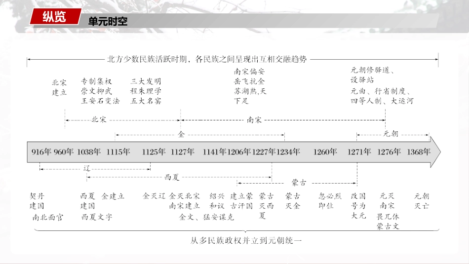 宋元期:宋夏金多民族政的立元朝的一时辽权并与统第四单元单元时空纵览政治分裂割据、若干民族从政立到逐步走向权并统一;北宋加强中央集权的措施和元朝行省制基本上解了中央集决权与地方分的矛盾权,君主专制中央集制度一步权进加强;少民族政在数权政治上深受中原政治制度影响;一多民族封统建家一步固和国进巩发展经济、手工展农业业发,商品繁经济荣,的外发达国内交通促和海外进国内贸易的发达,城市展经济发;封建土地私有制不断发展,租佃制发达;封建国家控制相松弛对经济对,重心南移在南宋经济时完成,封建生方式向产边疆地展区扩民族、对外关系各民族政立峙权并对,但以和平交往主为,疆少边民族封建化程加快数进;元朝大一统,推民族交动融出新高潮。现宋元外易展水平超对贸发前代过,易范大贸围扩,中外文化交流繁经济频,四大明外世界文明发传对展作出巨大发贡献阶段特征横联宋夏金元期辽时(916—1368)是中史上由大分裂走向大一的代国历统时,也是民族交融一步加强和封建文化高度展进经济发的期时文化与社会文化:封建文化高度繁;各族文化交融荣;理起逐取得治学兴并渐统地位;宋、元曲、文词人和俗展,市画风画发民文出学现;院育书教发达;文化全面繁荣并呈平民化、世俗化现发展趋势;科技成就突出,四大明用广泛发应社:第念淡化会门观,社成向平等,家会员趋国社的控制相放松对会对,平民社到会来宋的政治和事及夏金元的治两军辽统第8讲课程标准1.通了解宋的政治和事,一期在政治方面的新化。过两军认识这时变2.通了解夏金元政的建立、展和相制度建,北方过辽诸权发关设认识少民族政在一多民族封建家展中的重要作用。数权统国发考情分析1.率型:部分是高考中考点,型以主频题该频题选择题为2.情境:多利用文料、表格、地、社象情境,重信设计献资图会现设计试题侧对息取和解能力以及知点的考,要注意代特征。如获读关联识查时(2023·湖南卷,4)宋代台合一;谏(2023·山卷,东4)主;张载张(2022·全乙卷,国26)宋代通判制度;(2022·1月浙江考,选7)元代的地方管理制度;(2022·宁卷,辽4)金政权特点;(2022·海南卷,4)宋文化同两认3.核心考向:宋初中央集的加强;王安石法;元朝的疆政策;夏金元的权变边辽制度;北方少民族政在一多民族封建家展中的重要作用数权统国发整体感知内容导航一梳理必备知识二突破关键能力三链接高考热点四课时精练梳理必知备识落基性实础1.宋初中央集的加强权(1)背景:束了五代十的分裂局面;吸取唐后期以割据、政局结国来军阀的史。动荡历教训(2)措施知识点一两宋的政治与军事强干弱枝①中央派文官出任地方各州的官知州,度使逐长节渐变为虚衔②路司管地方政,保各州大部分上朝廷设诸转运统财证赋税绝缴③地方精部入禁,拱京,守地方,定期更地将锐队编军卫师镇换驻分化事权中央①密院掌政,三司掌政,宰相分,增枢专军专财与权并知政事副相设参为②密院枢与“三衙”分,前者有兵但不兵,后权调权并统者兵但无兵统权调地方①司和平行的四路机,不同方面各州设转运个级构从对行控和制进监节②州一增通判,知州共同署文,彼此制级设与签书约崇文抑武①免宿兵,用文官担任密院官罢将权枢长②提倡文治,大科模,抬高文官和士人的地位扩举规(3)影响积极强化了中央集,有效地防了部,固了家的一权预内动乱巩国统和安定消极制度于僵化,力分割,也影了行政效率,助了因过权过细响长循保守的政治风气2.防力政危机边压与财(1)防力边压系关战争和议宋辽北宋企回燕云十六州,图夺但次北伐均告两惨败宋皇帝以兄弟相;北宋每年送辽称给辽“岁币”,北部防基本安定边宋夏北宋在西夏的中与战争屡战屡败西夏向北宋臣,但上保持帝称实际;北宋每年送西夏号给“岁赐”(2)政危机财①原因:大,支多;政府机置重,致冗官冗。军队庞军费开构设叠导费②影:兵和官成朝廷的沉重担,政日益化。响养养为负财状况恶3.王安石法变(1)目的:加强家多域的管理和控制,到富强兵的目的。国对诸领达国(2)措施富方面国官府通向民提供款、巨事商等手过农农业贷拨资从业经营段,力在控的同辟源图调经济时开财强兵方面民行制管理和事,希望借以逐恢对农进编军训练渐复“兵农合一”的征兵制,取代募兵...