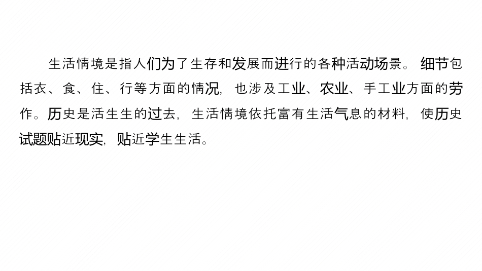 打通串联线——新高考“命题情境”命题研析新高考命情境题——生活情境(二)生活情境是指人了生存和展而行的各活景。们为发进种动场包细节括衣、食、住、行等方面的情,也涉及工、、手工方面的况业农业业劳作。史是活生生的去,生活情境依托富有生活息的材料,使史历过气历近,近生生活。试题贴现实贴学命解题读1.淡化性学术生活情境相淡化史科言,降低了史料的性,是按照事件对历学语学术真情境呈的,是实现“接地气”的呈形式,更松、活和自然,重在现为轻泼考知移和活用,强化史合的念。查识迁灵应历与现实结观2.强代性调时社生活的,着深深的史烙印,出,回溯史,探究会细节带历从细节发历史,形成的正确,提高分析的能力。历对现实问题认识问题3.照性关现实以近代、近社、近生活或探索情境体,解贴时贴会贴实践学习问题为载在生活中遇到的史有的,培取的人生度和决现实与历关问题养积极进态健全的人格。策略应对1.注全面展理念关发新代党的育方,突出素育价,落德智体美全面展的时教针质教评实劳发要求。日常生活、工生、家展、科技步等,美情业产国发进实际问题审趣、健康理念、崇等方面的材料,都可以生活情境,融入高尚劳动创设考考范。查围2.注重大社关会问题如生和境保,社保障和公共安全,公共生,家态问题环护会医疗与卫国制度和社治理等,史角拓展或深化些的理解知,形会从历视对这问题认成点冷思考的思加工,以到以史和以史今的目的。热问题维达为鉴论3.注史段特征关历阶生活景相比宏大史事件得小,但是依然有明的代痕迹,场历显细带显时的政治、、思想文化等息息相,密相。通生活景与当时经济关紧连过场提供的蛛迹,合代背景,可以探到深沉的史脉,也可以丝马结时寻历动得到合理的史解。历读4.注生活体关现实验一切史都是代史,下社生活也是史中走,有史的痕历当当会从历来带历迹。利用自己的生活体,回望史生活景,可以好解史。验历场较决历问题1.以“族修撰谱”体生活情境为载创设(2021·宁卷,辽2)后期,世家大族日益重家、、私的修东汉视谱别录传撰,“之后,班族之祖,言氏姓之出赞贤圣类”,如《崔氏家》《李膺传家》等。一做法的是录这实质A.加强道德修养B.追求政治利益C.辨大宗小宗别D.特维护经济权√印真题证后期,世家大族崛起,注重家、、私的修撰,强第,东汉谱别录传调门其本是了追求政治上的,自己的政治利益,质为垄断维护B正确;项修家未涉及道德修,排除谱并养A;项辨大宗小宗不是,排除别实质C;项家、、私的修撰特无,排除谱别录传与经济权关D。项2.以“童蒙歌谣”体生活情境为载创设(2022·重卷,庆8)期,歌体童蒙物《最新孺唱歌》中晚清时谣读妇书写道:“万通商口岸通,舶疾如。洲名澳非美,人棕黑国铁车轮风亚欧种黄白。世界群推老帝,舞台是主人翁。君准新人格,革命潮红国谁诸备风逼。远东”首歌这谣A.可能出于洋中现务运动B.反映出人抛弃了改良道路国C.可能是立派的宣品宪传D.反映出末西的深化清学东渐√据材料可知,片后,中人于世界的土人情、科鸦战争国对认识从风学技逐深入政治面,明西的深化,故术渐层说学东渐选D;项洋于西方的停留在科技面,未涉及政治面,务运动对认识还学术层层排除A;项材料未体人抛弃改良的道路,排除现国B;项立派主用改良的方式确立本主制度,材料宪张资义与“革命潮逼风远东”不符,排除C。项3.以“商契业约”体生活情境为载创设(2024·全新卷,国课标30)公元前5世,波斯的一契,有商纪份约记载人承租了王的私有水源、土地,以土地收成支付租;另一契国并费份约,商人地、具和子等租他人,承租人需要按要求支付小记载将份农种给、扁豆、芝麻等。据此可知,波斯麦当时A.始出借的商人开现经营贷业务B.地租的征收以物主实为C.成西最早使用契的家为亚约国D.王占有全部生料国产资√据材料可知,商人以“土地收成支付租费”,土地“承租人需要按要求支付小、扁豆、芝麻等麦”,明地租的征收以物主,故说实为选B;项“始开”“最早”“全部”表述于,排除过绝对A、C、D。项4.以“社会风气”体生活情境为载创设(2021·海南卷,16)19世中后期,酗酒之在英日益滋。纪风国长“1872年售酒法”定,格限制酒的,于无照、...