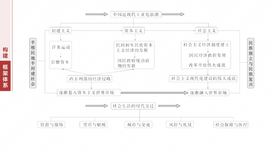 中国近现代经济与社会生活中国近现代史专题七构建框架体系梳理主干线索线索一近代中国经济结构的变化在西方资本主义经济的侵略下,自然经济开始瓦解,洋务运动是中国早期现代化的尝试。随后民族资本主义诞生,在封建主义、官僚资本主义和帝国主义的夹缝中艰难曲折发展线索二中国特色社会主义道路的探索和建设中华人民共和国成立后,在中国共产党的领导下,中国逐渐走出了一条中国特色社会主义道路,并取得了辉煌的成就,为实现中华民族伟大复兴打下了坚实的基础线索三中国近现代社会生活的变迁近代西方列强通过一系列不平等的条约,攫取了近代中国的关税自主权。中华人民共和国成立后,从帝国主义手里收回关税自主权,为中国社会主义经济建设提供坚实的保障。随着中国经济的发展和思想意识的变化,中国的社会生活也发生了巨大变化。封建的陈规陋习逐渐被抛弃,社会风气发生变化,城市化进程不断发展,新习俗、新风尚、新观念层出不穷目标导航课程高考要求考情速递中外历史纲要上1.认识列强侵华对中国社会在经济和社会生活方面的影响3年29考2.认识地主阶级洋务派为挽救危局所作的努力及存在的局限性3年17考3.了解北洋军阀的统治及特点(民国初年经济、社会生活的新气象)3年9考4.了解南京国民政府的成立3年5考5.了解新中国巩固人民政权的主要举措3年17考6.认识新中国为向社会主义过渡所做出的努力3年14考7.了解20世纪50-70年代中国探索社会主义建设道路的曲折发展和伟大成就3年18考8.认识“文化大革命”的错误及教训3年0考9.理解经济领域所取得的成就在新中国历史上所具有的开创性、奠基性意义3年18考10.认识改革开放和社会主义现代化建设新时期我国在经济领域取得的成就、综合国力及国际影响力的不断提高3年45考选择性必修1.了解关税、个人所得税制度在中国的产生和实行3年5考2.了解农业现代化的过程,人类在食物生产、储备等方面的进步,认识消除饥饿和食品安全对于人类社会发展的重大意义3年1考3.认识大机器生产、工厂制度、人工智能技术等对人类劳作方式及生活方式的影响3年8考4.认识世界市场的形成对商业贸易的意义3年11考5.认识20世纪以来贸易、金融的变化及其对人类生活的影响3年6考6.了解近代以来城市化进程中人们居住条件和生活环境的改善及问题3年7考7.认识工业革命对促进交通进步的作用3年4考8.认识20世纪交通运输的新变化对民众生活及社会变迁的重要意义3年1考9.了解中医药的主要成就和西医在中国的传播、发展过程3年5考10.了解现代医疗卫生体系的建立、发展及其对社会生活的影响3年3考命题分析1.命题规律:(1)选择题和材料题都有大量出现,史料形式以文献资料、报刊、画报、年画、数据表格为主;(2)近代经济结构的变动、中华人民共和国成立后经济体制的变革、社会生活习俗的变迁等是高考命题的核心区域。2.备考策略:从唯物史观和家国情怀等角度认识近现代中国经济社会的发展历程和影响,认识交通、城市化、医疗等方面发展与经济发展和国家政策之间的关系系统整合强化必备知识考向定位练透选择题情境创设突破主观题内容索引系整合统强化必备知识知点一识1.近代中的演国经济结构变(1)自然:片后,在外的侵略和本本主等新经济鸦战争国经济国资义经济成分的冲下逐步解体,瓦解于三大改造。击(2)洋:务经济19世纪60年代到90年代,洋派引西方的先技务进进术和机器,近代事工和民用企,成中近代化的端。设备创办军业业为国开(3)官僚本主:民政府建立后,官僚本凭借家力,利用四大资义国资国权行聚巨富;人民解放期,民党的反政策和官僚本银敛额财战争间国动资的巧取豪,使工人、民、城市小遭到酷的削和迫。夺农资产阶级残剥压中近代社生活国经济结构变动与会(4)新民主主:土地革命期,中共党展土地革命;抗日义经济时国产开战期,根据地行租息政策,展大生,固和大抗日争时实减减开产运动巩扩民族一;人民解放期,制定了除封建性及半封建性削统战线战争时废剥制度的《中土地法大》,成立中人民行。国纲国银(5)近代民族本主曲折展资义发19世六七十年代纪民族本主工在南沿海地始生资义业东区开产19世末纪20世初纪民族本主初步展,民族力量大,资义发资产阶级壮登上政治舞台并一...