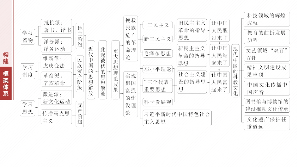 中国近现代思想演变与文化传承中国近现代史专题八构建框架体系梳理主干线索线索一中国近代思想解放与文化交流近代以来,中国人民为挽救民族危亡,从“师夷之长技以制夷”到“中体西用”,从君主立宪到民主共和,从民主与科学到马克思主义,推动了中国近代化的步伐。同时,中华文化也向世界传播,有力地推动了世界文化的繁荣线索二近现代中国重大理论成果孙中山提出新三民主义,第一次国共合作正式形成;马克思主义广泛传播并诞生了毛泽东思想、邓小平理论、“三个代表”重要思想、科学发展观和习近平新时代中国特色社会主义思想,并引领中国革命和社会主义建设不断走向胜利线索三近现代中国的教育科技文化近代教育改革促进了中国新式教育的发展。中华人民共和国成立以来,中国的科技取得了重大突破,在某些领域达到了国际先进水平。文学艺术在“双百”方针的指导下,呈现出繁荣发展的局面。新中国成立以来,形成了完整的国民教育体系,新时期,“科教兴国”战略成为共识目标导航课程高考要求考情速递中外历史纲要上1.认识社会各阶级为挽救危局在思想文化方面所作的努力及存在的局限性3年17考2.了解孙中山三民主义的基本内容3年4考3.了解新文化运动的主要内容,理解其对近代中国思想解放的影响3年9考4.认识五四爱国运动的历史意义,认识马克思主义在中国的传播3年15考5.理解国防等领域所取得的成就在新中国历史上所具有的开创性、奠基性意义3年5考6.了解和感悟这一时期中国人民艰苦奋斗、奋发图强的精神风貌3年6考7.了解毛泽东对中国革命和社会主义建设的贡献,认识毛泽东思想对近现代中国的深远影响3年4考8.认识邓小平理论对建设中国特色社会主义的重要指导意义3年3考9.认识科学发展观是马克思主义关于发展的世界观和方法论的集中体现3年1考10.认识习近平新时代中国特色社会主义思想是全党全国人民为实现中华民族伟大复兴而奋斗的行动指南3年1考选择性必修1.了解历史上世界各地区不同规模和类型的人口迁徙,认识人口迁徙对人类文化变迁的影响,以及人口迁徙和移民社会中出现的文化认同问题3年0考2.了解近代以来不同类型的商路,深入理解贸易活动在文化交流中所扮演的重要角色3年0考3.了解历史上学校教育、留学、书刊出版、翻译事业以及图书馆、博物馆在文化传承与传播中的作用3年7考4.认识文化遗产保护对保持文化的传承、维护文化多样性和创造性具有的重要意义3年0考命题分析1.命题规律:(1)以选择题为主,非选择题也偶有涉及。史料形式有文字材料、表格、图片等;(2)西学东渐的背景、历程、特点及影响是高考命题的核心区域,马克思主义中国化的成果和近现代文化的传承与遗产保护等考查较少。2.备考策略:重点关注晚清至民国时期思想变革的背景、进程和影响,注意提升自己的家国情怀意识;掌握马克思主义中国化的伟大理论成果,彰显时代精神,增强道路自信、理论自信、制度自信和文化自信系统整合强化必备知识考向定位练透选择题情境创设突破主观题内容索引系整合统强化必备知识知点一识1.近代中的思想解放潮流国(1)片至甲午中日前鸦战争战争(1840-1894)中近代思想解放文化交流国与眼看开世界林徐,成《四洲志》;魏源撰的《海志》,则开办译馆汇译编国图述了阐“夷之技以制夷师长”的思想;徐继畬的《瀛寰志略》是中近代第一部世界地理著作;他初步提出了向西方以求自国们学习强的主张中体西用①容:以李章、曾藩首的地主洋派主用西方先内鸿国为阶级务张科技封建治;进学术维护统②价:洋是中早期代化的;有到保障家评务运动国现尝试没达国安全、抵抗外侵略、封建治的目的敌维护统(2)甲午中日后至辛亥革命战争(1895-1911)资产阶级新派维掀起近代中第一次思想解放,中政治民主化由此国运动国始,推新思想的播,起到思想解放的作用开动传资产阶级革命派①主:中山提出三民主,主暴力推翻政府,建张孙义张清立民主共和,平均地;国权②价:成辛亥革命的思想武器,使民主共和的念逐评为观深入人心渐(3)北洋治前期:新文化军阀统运动背景“民主共和”和“救实业国”成大思潮,袁世推行为两凯“尊孔复古”的逆流,大多民仍被制和愚昧束数国专缚容内前期提倡民主科,提倡文革命,倡女解...