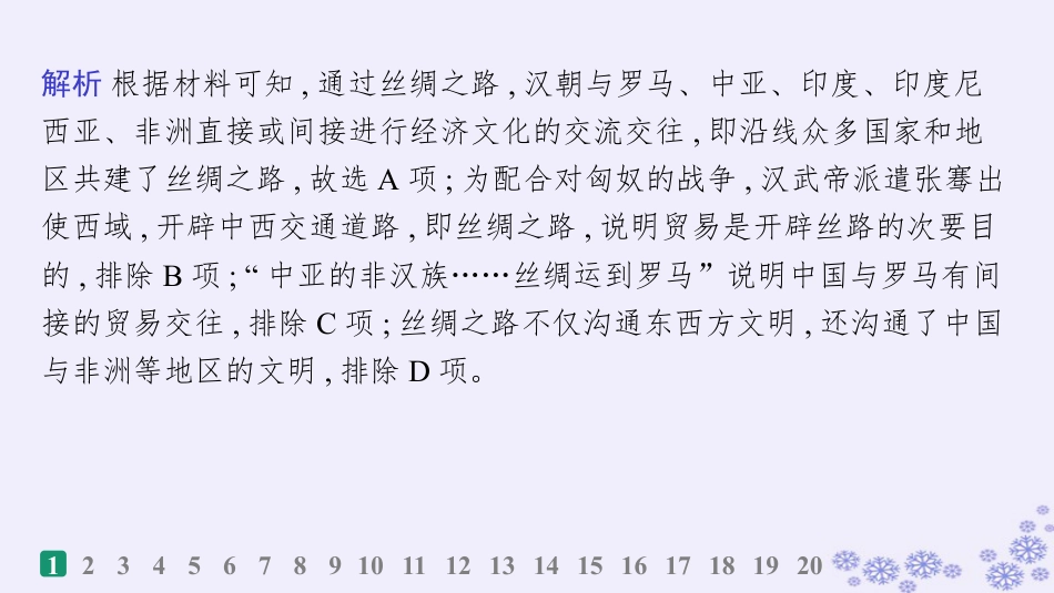 选择性必修3阶段检测1234567891011121314151617181920一、选择题1.(2023广东韶关一模)丝绸的出口是汉朝贸易体系的一部分,除中国外还有五方参加,它们是罗马、中亚、印度、印度尼西亚和非洲,中亚的非汉族赶牲畜人充当了中国货物的运输人或向导,中国从中亚取得马匹和璞玉,最后,丝绸运到罗马。材料主要说明()A.沿线众多国家和地区共建了丝绸之路B.贸易是开辟丝绸之路的主要目的C.中国与罗马有直接的贸易交往D.丝绸之路沟通了东西方文明A1234567891011121314151617181920解析根据材料可知,通过丝绸之路,汉朝与罗马、中亚、印度、印度尼西亚、非洲直接或间接进行经济文化的交流交往,即沿线众多国家和地区共建了丝绸之路,故选A项;为配合对匈奴的战争,汉武帝派遣张骞出使西域,开辟中西交通道路,即丝绸之路,说明贸易是开辟丝路的次要目的,排除B项;“中亚的非汉族……丝绸运到罗马”说明中国与罗马有间接的贸易交往,排除C项;丝绸之路不仅沟通东西方文明,还沟通了中国与非洲等地区的文明,排除D项。12345678910111213141516171819202.(2023山西吕梁开学检测)宋真宗时期,官府“于京畿近郊佛寺买地,以瘗(埋葬)死之无主者”,后宋徽宗在全国推广此制,曰“漏泽园”。这可用于说明宋代政府()A.社会保障体系健全B.践行传统的民本思想C.强化理学独尊地位D.人口老龄化问题严重B1234567891011121314151617181920解析材料提及宋代政府买地“以瘗(埋葬)死之无主者”并予以推广,体现了政府“安民”“恤民”的民本思想,故选B项;“体系健全”不符合逻辑,与材料仅提及善待“死之无主者”相悖,排除A项;“强化理学独尊地位”不符合题意、时空,南宋后期起,理学受到官方尊崇,排除C项;材料未涉及“人口老龄化问题”,排除D项。12345678910111213141516171819203.(2023山西吕梁开学检测)明末清初,以利玛窦为代表的西方传教士在华期间“习华语,易华服,读儒书,从儒教”,并提出对华实行“学术传教”的思想,将欧洲的基督教文化、科学技术以及文化艺术传到了中国。西方传教士的这些做法()A.推动了中国向近代社会转型B.推动中国科技发展新高潮的到来C.冲击了中国传统的“夷夏观”D.客观上促进了东西方文明的交流D1234567891011121314151617181920解析材料提及利玛窦等西方传教士在“习华语,易华服,读儒书,从儒教”的同时,也“将欧洲的基督教文化、科学技术以及文化艺术传到了中国”,可知传教士推动了中西方文明的交流,故选D项;“中国向近代社会转型”不符合史实,明末清初中国固守封建制度,排除A项;“科技发展新高潮”不符合史实,排除B项;对中国传统的“夷夏观”产生冲击在鸦片战争后,排除C项。12345678910111213141516171819204.(2023浙江A9协作体高三联考)法国学者谢和耐认为明末“是一个文化沸腾、创新、高度好奇和思想自由的时代”,下列选项符合这一现象的是()A.汤若望、南怀仁等主持钦天监工作B.徐光启与利玛窦合作翻译《几何原本》C.佛教的传入丰富了中国文化的内涵D.瑞典中国宫建筑风格深受中国文化影响B1234567891011121314151617181920解析根据材料“文化沸腾、创新、高度好奇和思想自由的时代”可知,明末,意大利人利玛窦等带来天文、地理、数学等方面的新知识,徐光启等主张以开放的胸怀会通中西文化,徐光启与利玛窦合作翻译的《几何原本》在一定范围内传播了西方科技知识,故选B项。12345678910111213141516171819205.(2023贵州入学考试)嘉庆皇帝在批复《查办吉林、长春两厅流民折》中提道:“流民出口,节经降旨查禁,各该管官总未实力奉行,以致每查办一次,辄增出新来流民数千户之多,总以该流民等业已聚族相安,骤难驱逐为词,仍予入册安插。”据此推测,当时这两地()A.已经成为流民的主要迁入地B.政府对移民持宽容态度C.摆脱中央对地方行政的干预D.居民生活环境日益恶化B1234567891011121314151617181920解析根据材料可知,虽然中央禁止流民涌向东北,但“该管官总未实力奉行”,东北地方官员反而较为宽容地“仍予入册安插”,故选B项;“流民的主要迁入地”不合题意,材料未将吉林、长春两地与其他地区相比,排除A项;“摆脱”不符合逻辑、史实,清朝中央集权制度强化,地方受控于中央,排除C项;材料未体现“生活环境日益恶化”,排...