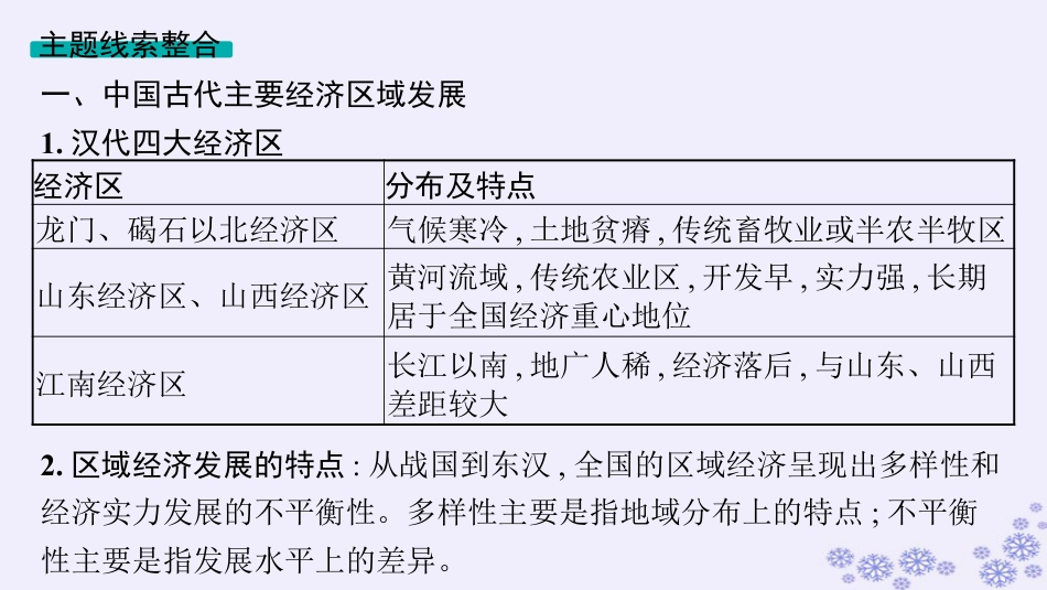 单元培优主题课3区域经济的开发与经济重心的南移高考价值引领我国古代区域经济发展不平衡,经济重心经历了由北向南、由内地向沿海的逐渐转移。经济区域开发和经济重心南移对我国古代乃至现代经济的发展、经济结构的变化、经济格局的确立具有重要影响,对我国现代发展区域经济构想,如西部大开发、重振东北经济等具有重要的借鉴意义。主题线索整合一、中国古代主要经济区域发展1.汉代四大经济区经济区分布及特点龙门、碣石以北经济区气候寒冷,土地贫瘠,传统畜牧业或半农半牧区山东经济区、山西经济区黄河流域,传统农业区,开发早,实力强,长期居于全国经济重心地位江南经济区长江以南,地广人稀,经济落后,与山东、山西差距较大2.区域经济发展的特点:从战国到东汉,全国的区域经济呈现出多样性和经济实力发展的不平衡性。多样性主要是指地域分布上的特点;不平衡性主要是指发展水平上的差异。二、中国古代经济重心的南移大题方法突破突破3“流程图逻辑阐释”类解法与技巧【题型特点】历史流程图是运用图形表达历史逻辑的一种形式。随着计算机技术的普及和应用,历史流程图越来越多,成为历史研究和历史学习的重要工具。近几年高考试题中也出现了很多历史流程图作为新情境的试题,对考生的识图能力提出了较高要求。【典例】(2022辽宁卷,20)阅读材料,完成下列要求。材料自古以来,我国各民族之间保持着密切联系;民族交往交流交融是主流。下面是学者绘制的民族交往交流交融分级图。——摘编自李静、于晋海《民族交往交流交融及其心理机制研究》结合中国古代史的相关知识,紧扣上图中所示的一个或多个逻辑线索,拟定一个论题,并予以阐释。(要求:论题明确,史论结合,逻辑严谨,表述解题指导第一步:审清设问,明确答题指向求答项“拟定一个论题,并予以阐释”限定语“结合中国古代史”信息来源紧扣图中逻辑线索第二步:审准材料,提取信息必备知识本题主要考查《中外历史纲要》(上)关于民族交融方面的史实,也涉及选择性必修1关于民族关系方面的知识、选择性必修3关于文化交融方面的知识信息提取①民族接触民族接触是民族交往、交融和形成民族共同体的基础所在。民族接触包括战争、贸易、移民等形式②民族意识民族意识是民族交融、文化交流的结晶,在中国古代最终形成中华民族意识共同体第三步:精确提炼,确定答案答案论题:中国各民族交往交流交融是形成中华民族意识共同体的主要途径。阐释:民族交往是从民族接触开始的,是民族交流交融的基础。比如,魏晋南北朝时期、宋元时期大批少数民族迁入中原,加速了民族交往交融。随着民族交往的增多,各民族间必然要进行文化选择,由此形成包括资源、信息和语言交流在内的物质层面和精神层面的民族交流。比如,北魏孝文帝改革实行说汉话、穿汉服等措施;宋元时期,契丹、党项、女真、蒙古等民族的封建化。民族交融重在文化交融、文化共享,通过血缘交融、习俗交融、信仰交融等,达到心理交融,心理交融是民族交往交流交融的最高层面。比如,魏晋南北朝时期、辽宋夏金元时期,各民族之间交错杂居,互相通婚,少数民族政权还积极推进儒学教育,从而推动各民族形成对儒家文化信仰和中华民族的心理认同。总之,正是各民族间的交往、交流和交融,最终奠定了古代中国大一统基础,形成中华文明多元一体的文化格局,铸造了中华民族共同体意识。解策略题(1)明确流程图的主旨:这既是解答试题的起点,也是观察分析流程图的落脚点。流程图的主旨对历史知识起到统领作用,是划分流程图层次和阶段的依据所在。在确定流程图的主旨中注意题头的介绍信息和材料标注的内容,这些都可能提示流程图的主旨。(2)注意与所学知识链接:在解答试题的过程中需要首先建立与所学知识的链接,回忆教材相关知识的储备,注意借鉴教材的知识框架和语言语境,将流程图的相关信息与所学知识一一对应,这是正确解答试题的基础所在。(3)重视箭头的含义:流程图中的箭头一般表达因果联系或者前后相继的时空顺序,是表达历史逻辑关系的关键标示,所以,分析流程图需要高度重视这些箭头的含义。通过箭头的方向和层级可以有效地判断答案的结构和层次。(4)重视对流程图结构的分析:流程图的结构与答案的结构密切相关。流程图的上下结构一般表示答案的...