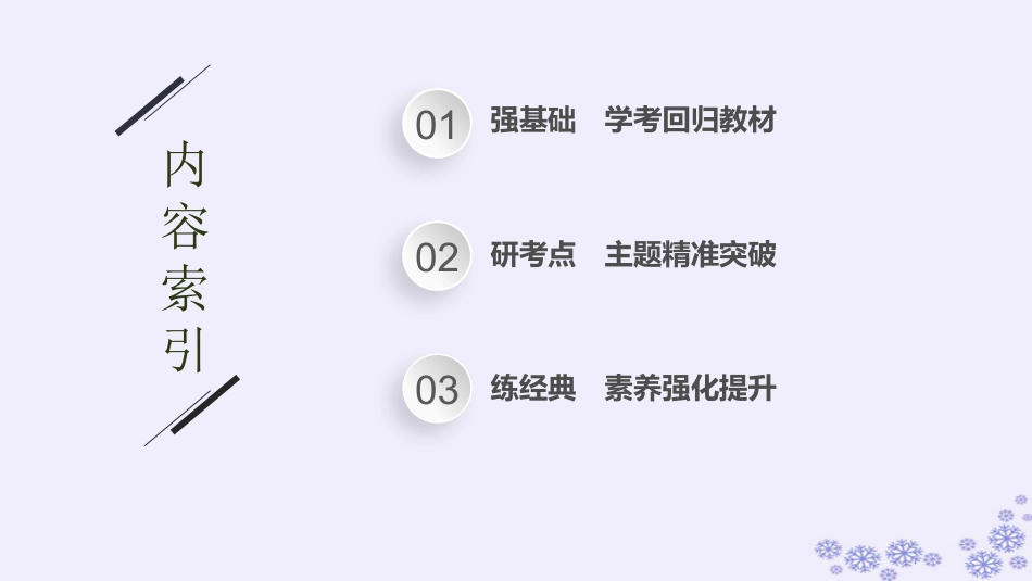 第59讲丰富多样的世界文化内容索引010203强基础学考回归教材研考点主题精准突破练经典素养强化提升课程标准凝练要点1.通过了解世界各主要区域文化,理解世界文化的多样性2.认识世界各国、各地区、各民族对人类文化发展所作出的贡献1强基础学考回归教材一、古代西亚、非洲文化①1.古代西亚文化(1)文字:苏美尔人创造的楔形文字,是迄今所知世界上的文字。(2)文学:《》是目前所知世界上最早的史诗。(3)建筑艺术:苏美尔人的;亚述帝国的人首飞牛雕刻;波斯的王宫,体现了专制帝国统治者的威严。(4)古巴比伦王国的《汉谟拉比法典》①内容:宣扬;规定臣民义务及违背法律的惩罚措施。②意义:是研究古代历史的重要资料。最早吉尔伽美什泥偶雕像君权神授两河流域2.古代埃及文化(1)文字:象形文字,约形成于公元前4千纪末。(2)文学:创作出神话、诗歌、哲理故事和散文故事。(3)建筑艺术:受到宗教较大影响;修建豪华陵墓和众多神庙。(4)科学技术:发明了世界上最早的太阳历。3.阿拉伯文化天方夜谭学考转换回归教•材①链高考——古代西亚、北非文化对古希腊文化的影响(2022北京卷,11)涉考英国学者马丁·贝尔纳在其著作《黑色雅典娜:古典文明的亚非之根》中提出希腊文明的源头在西亚和北非,能印证这一观点的有:、、。②补教材——楔形文字与象形文字苏美尔人用削尖的芦苇秆或木秆将文字书写在泥板上,笔画像楔子,故称“楔形文字”。象形文字是由图画文字演化而来的,是一种古老的字体,属于表意文字。字母文字雕塑艺术冶铁技术③深拓展——阿拉伯帝国文化繁荣的原因(1)阿拉伯帝国文化汇集了东西方文化,有着深厚的文化积淀。(2)广泛吸收各地区的文化成就,加以融合与创造。(3)政治相对稳定,交通发达,经济繁荣。(4)统治者对科学文化的重视。二、欧洲文化的形成1.古希腊文化(1)公元前5世纪至公元前4世纪上半叶被称作古代希腊历史上的“古典时代”,是古代希腊文化高度发展的时期。苏格拉底探讨和社会伦理,用对话形式提出哲学思想柏拉图创建的“学院”将哲学和数学知识融会贯通,为欧几里得的《》奠定了基础是一位“百科全书式的学者”,对欧洲科学知识系统的形成产生了重要影响(2)哲学①研究对象:宇宙起源和人生意义等自然和社会问题。②特点:力图用理性的思维方式①认识世界和解释世界。③表现人生哲理几何原本亚里士多德(3)文学:《荷马史诗》;雅典城邦时期的戏剧。歌精神讴乐观,肯定人生活的价与值(4)雕塑和建筑:米隆的《掷铁饼者》;帕特农神庙②。古代始从罗马时开,被尊“史之父”称为历(5)史学:古希腊是欧洲史学的源头;希罗多德的《》开创了叙事体的撰史体裁,修昔底德的《伯罗奔尼撒战争史》是西方史学的经典之作。历史2.古罗马文化:继承并发展了古希腊文化③法律《十二铜表法》(公元前450年左右颁布)①地位:古罗马第一部②内容:以维护贵族和富人的财产利益为核心,包括债务法、继承法、婚姻法以及诉讼程序等③意义:明文公示,按律量刑,限制了滥用权力,规范了社会契约行为,在一定程度上保障了利益,成为后来一系列公民法的基础文学卢克莱修、西塞罗和维吉尔是最杰出的文学家史学李维的《》和塔西佗的《编年史》代表了古罗马史学的最高成就建筑万神殿、大竞技场等是建筑的代表历法凯撒时期制定的后经修订成为世界通用的公历成文法贵族平民罗马史儒略历3.中古西欧文化(1)基本特征:王权与教权并立的二元政治格局;基督教信仰成为西欧地区普遍的文化符号。(2)基督教文化:载体是《》和神学,对西欧思想文化的传承和发展产生了很大影响。(3)文学艺术:历史传说和神话成为文学艺术创作的素材;骑士文学和反映了封建时代和城市复兴时期的社会生活。(4)意义:虽受到教会控制而少有科学成就,但继承了古代希腊、罗马的哲学、法律和科学知识传统,为后来的文艺复兴、宗教改革和科学革命奠定了必要的基础。圣经市民文学4.拜占庭、俄罗斯文化(1)拜占庭文化特征继承了古代希腊、罗马文化,融汇了文化和来自西亚、北非的文化,独具一格成就①法律:《》是拜占庭文化的标志性成就,标志着罗马法发展到最发达、最完备的阶段①②建筑和雕塑艺术:君士坦丁堡的以其罗马式穹顶而闻名(2)俄罗斯文化①特征:深受拜占庭文化的影响;东正教对俄罗斯产生了深...