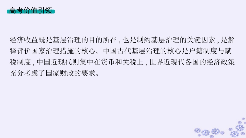 单元培优主题课16基层治理的经济考量高考价值引领经济收益既是基层治理的目的所在,也是制约基层治理的关键因素,是解释评价国家治理措施的核心。中国古代基层治理的核心是户籍制度与赋税制度,中国近现代则集中在货币和关税上,世界近现代各国的经济政策充分考虑了国家财政的要求。主题线索整合一、中国古代基层治理的经济考量1.赋税与户籍制度(1)赋税制度:中国古代的赋税收益是国家财政的主要来源,是基层治理的核心所在。①征收标准:中国古代的税收经历了从人头税为主向土地税为主的演化,适应了人口不断增加、租佃制不断发展的现实。②重农抑商:中国古代基本上奉行重农抑商的政策,对商业课以重税,将更多的人口固着在土地上,稳定农业税收。③税收形式:中国古代赋税的形式存在着从实物向货币演化的趋势,这既是商品经济发展的产物,也体现了减少运输成本的目的。(2)户籍制度:中国古代政府管理户籍的根本目的是掌握人口变动的情况,以便征发赋役。随着人头税的逐渐减少、土地税逐渐增多,户籍制度的重要性也大为降低。2.货币与专卖政策(1)货币发行①货币发行权:中国古代存在着中央与地方争夺货币发行权的斗争,其本质是争夺经济收益。②货币铸造:中国古代大部分朝代发行的货币币值低于其实际价值,在宋元明甚至出现了纸币,铸币权带来的是巨大的经济利益。(2)专卖政策①本质的争夺:中国古代的专卖政策表面上是重农抑商的产物,本质上是国家与私商争夺工商业利益的结果,专卖的商品大都是利润丰厚的垄断性产品。②官私合作:政府垄断商品的经营也加大了运营的成本,国家为了减少成本,一般将专卖商品流通的末端交由私商经营,形成官私合作的模式。3.基层治理(1)基层教化:中国古代的教化主要是通过民间力量完成的,国家参与很少,家教、族规、乡约都发挥了重要作用。(2)社会治安:中国古代,基层乡里制度是政府治理基层的主要力量,同时,民间自我管理的保甲制度也起了重要作用。(3)社会救济:中国古代,政府是社会救济的主体,但是,民间组织也起了很大的作用,尤其是日常生活领域的赈济,宗族、富户、宗教等团体都具有一定的救济功能。二、中国近现代基层治理的经济考量1.关税的丧失与争夺(1)关税的丧失:鸦片战争后,中国开始丧失关税自主权,中国失去了自主调整税率的权力,不仅减少了关税的收入,而且,不利于民族资本主义经济的发展。(2)收回关税自主权:1927年,国民政府宣告关税自主,经过一系列谈判,关税自主取得一定成果,但是,仍不能完全自主地制定税率。(3)中华人民共和国的关税政策:中华人民共和国成立后,真正收回了关税自主权,不断完善关税制度,有力地保障了国民经济的发展。2.货币发行的近代化(1)银元时代:1935年以前,中国政府一直将银元作为法定货币,国际银价的变动严重扰动中国金融市场的稳定。(2)法币时期:1935年,国民政府实行法币改革,但是,由于国民政府滥发纸币,造成严重的通货膨胀。(3)稳定的人民币:中华人民共和国将人民币作为法定货币,解决了长期以来的通货膨胀问题,人民币在国际货币体系中的地位越来越高。三、欧美国家近现代基层治理的经济考量1.地方自治的传统(1)中古时期的地方自治:西欧中古时期的地方自治是分裂割据的产物,庄园和城市都具有一定的自治权力,造成了王权弱小。(2)王权的强化:中古时期后期,西欧王权不断加强,与领主贵族和封建教会争夺税收权是王权加强的重要表现。(3)近代的革命:近代资产阶级革命爆发的重要原因是资产阶级不满国王的征税,国王的征税权受到限制是革命的重要成果。(4)近代地方自治:近代地方的自治是中央与地方相互妥协的产物,体现在税收上,中央与地方分割税收,形成一定程度的制约关系。2.社区管理的经济考量(1)社区的设立:面对工业革命后城市出现的治理难题,西方各国协调民间力量组织社区,减轻政府基层治理的压力。(2)社区的发展:第二次世界大战后,西方各国组织和鼓励当地居民参与社区管理,社区很快发展为基层自治的主要方式。(3)管理的调整:20世纪80年代后,社区承担了更多的政府功能,公众、志愿者和私人部门提供了越来越多的公共服务,提高了基层治理的效率,降低了成本。