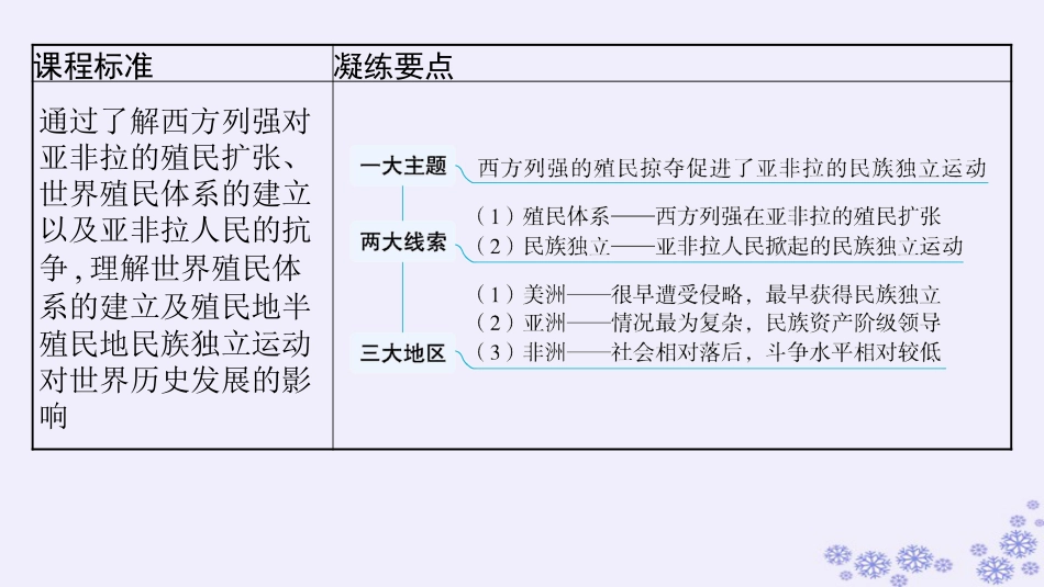 第34讲世界殖民体系与亚非拉民族独立运动内容索引010203强基础学考回归教材研考点主题精准突破练经典素养强化提升课程标准凝练要点通过了解西方列强对亚非拉的殖民扩张、世界殖民体系的建立以及亚非拉人民的抗争,理解世界殖民体系的建立及殖民地半殖民地民族独立运动对世界历史发展的影响1强基础学考回归教材一、资本主义世界殖民体系的形成1.拉丁美洲的殖民地化(1)概况①西班牙:1496年在海地建立了第一个永久性殖民地。到16世纪中叶,除巴西之外的大部分南美洲、整个中美洲和部分北美洲变成了西班牙的殖民地。②葡萄牙:侵入拉丁美洲,建立了殖民地。③英荷法:到18世纪晚期,拉丁美洲绝大部分土地为西班牙和葡萄牙的殖民地,小部分土地被荷兰、英国和法国占据。圣多明各巴西(2)统治①殖民掠夺:实行专制统治,推行农奴制,发展种植园经济,疯狂开采金银矿。相而言对,西葡的殖民治统,封建因素更多;英荷的殖民治本主因统资义素更多②种族灭绝:殖民者奴役和屠杀印第安人,造成后者大量死亡,又发展罪恶的黑人奴隶贸易。③垄断贸易:宗主国禁止或限制殖民地同任何其他国家进行贸易,限制了的发展。殖民地经济2.亚洲沦为殖民地半殖民地商路奥斯曼帝国3.西方列强瓜分非洲(1)阶段特点①第一阶段:15世纪到19世纪中叶以前,列强对非洲的侵略大多局限在地区。②第二阶段:19世纪后期,列强深入非洲腹地,掀起瓜分非洲的狂潮。(2)争夺北非:英法围绕着苏伊士运河展开了激烈的争夺。最终,英国侵占埃及、苏丹,法国侵入阿尔及利亚、突尼斯和摩洛哥。(3)撒哈拉沙漠以南①19世纪后期,列强加快了侵略撒哈拉沙漠以南非洲地区的步伐。②1884年柏林会议后,列强瓜分非洲的速度大大加快①,19世纪末20世纪初,它们侵占了几乎整个非洲。沿海4.世界殖民体系的形成世界殖民体系是本主世界体系的重要成部分资义组(1)背景:19世纪末20世纪初,资本主义发展到帝国主义阶段,资本主义国家掀起了资本输出、瓜分世界的狂潮。(2)影响①联系紧密:世界上几乎所有国家和地区都被卷入当中,世界越来越紧密地连为一体。②深重灾难:给殖民地半殖民地人民带来深重灾难,形成由少数资本主义国家奴役和控制世界上绝大部分土地和人口的极不合理②的状态。资本主义世界市场学考转换回归教•材①链高考——19世纪末20世纪初德国对外扩张的环境(2021重庆卷,13)1888年,一位热衷于殖民主义的访客在德国首相俾斯麦面前摊开一大张非洲地图,指着地图说明当地的资源有多么丰富。俾斯麦表示:“您的非洲地图非常漂亮,然而我的非洲地图位于欧洲。俄国在这里,法国在这里,而我们夹在中间。这是我的非洲地图。”这反映了当时德国的处境是。殖民野心受限于其地缘政治②链高考——西方国家以“白”为“美”的殖民偏见(2021福建卷,14)1884年,美国某公司推出一则主题为“给非洲带去文明”的香皂广告。此后近30年间,该公司的广告经常宣称,使用其香皂可以让非洲人皮肤变白,变得文明。同时期,法国和希腊的老牌香皂公司也声称其产品能“让黑人变白”。这体现的西方人族群认知的特点是。③补教材——西方殖民扩张的不同类型西班牙、葡萄牙的殖民扩张主要是国家组织的,带有很强的封建性;荷兰、英国、法国的殖民扩张主要是殖民公司组织的,以营利为目的,带有很强的资本扩张性质。两者扩张方式的不同深刻影响了殖民地社会的发展趋势。存在着固有的种族偏见④巧归纳——西方殖民侵略方式的演变二、亚非拉民族独立运动1.拉丁美洲的民族独立运动(1)背景根本西葡长期的政治压迫和经济剥削经济18世纪末19世纪初,拉丁美洲的经济有了一定发展思想的传播使殖民地人民的民族民主意识日益增长法国法国大革命动摇了法国在拉丁美洲的殖民统治,也严重削弱了西班牙和葡萄牙对拉丁美洲殖民地的控制美国美国的独立大大鼓舞了拉丁美洲人民启蒙思想(2)独立①序幕:1804年的独立,拉开了拉丁美洲民族独立运动的序幕。②独立:在和圣马丁等人领导下,西属拉丁美洲殖民地于年基本实现了独立。年,巴西获得了独立。海地玻利瓦尔18261822(3)民族民主革命的继续①背景内忧各国大多政局动荡,普遍实行军事独裁统治,政治经济发展停滞不前外患美国推行门罗主义、“金元外交”和“”②概况代表概况巴西1889年,巴西废除...