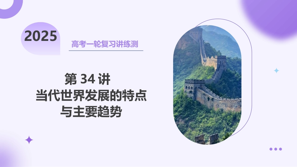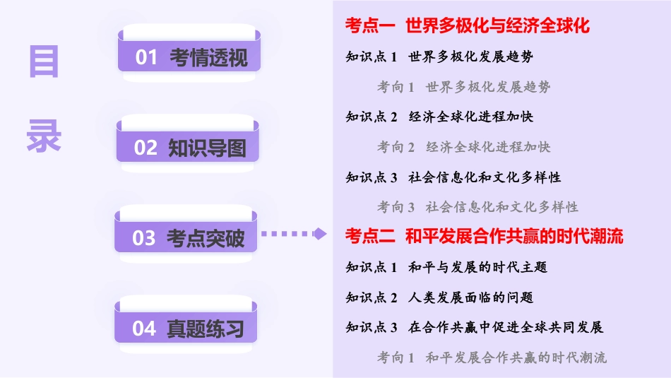 2025高考一轮复习讲练测第34讲当代世界发展的特点与主要趋势教材融合选必二纲要第6课现代科技进步与人类社会发展第9课20世纪以来人类的经济与生活第22课世界多极化与经济全球化第23课和平发展合作共赢的时代潮流选必三第8课现代社会的移民和多元文化第10课近代以来的世界贸易与文化交流的扩展目录01考情透视02知识导图03考点突破04真题练习考点一世界多极化与经济全球化知识点1世界多极化发展趋势考向1世界多极化发展趋势知识点2经济全球化进程加快考向2经济全球化进程加快知识点3社会信息化和文化多样性考向3社会信息化和文化多样性考点二和平发展合作共赢的时代潮流知识点1和平与发展的时代主题知识点2人类发展面临的问题知识点3在合作共赢中促进全球共同发展考向1和平发展合作共赢的时代潮流01考情透视考点要求考题统计备考建议世界多极化与经济全球化(3年9考)2024选择题:山东卷、浙江卷6月本讲为高考命题热点,复习时关注一些命题关键词:经济全球化、劳动力全球流动、欧洲联盟、国际金融格局、世界银行、世界贸易组织、社会信息化、文化多样化、移民社会的多元文化、文化遗产的保护2023选择题:浙江6月、全国新课标卷、全国乙卷非选择题:海南卷、全国新课标卷2022选择题:海南卷非选择题:江苏卷和平发展合作共赢的时代潮流(3年7考)2024非选择题:北京卷2023选择题:浙江卷6月非选择题:天津卷、河北卷、海南卷、浙江卷6月2022非选择题:重庆卷复习目标:1、了解世界多极化趋势的过程及加强的表现,认识世界多极化发展趋势不可逆转。2、了解经济全球化和区域集团化的发展过程,理解经济全球化使各国经济相互依存度剧增。3、理解和平、发展、合作、共赢成为时代潮流,牢固树立构建人类命运共同体意识,共同促进全球的和平与发展。02知识导图考点一世界多极化与经济全球化知识点1世界多极化发展趋势1、国际格局演变的历程2、多极化趋势的发展时期国际格局1815年后维也纳体系一战后凡尔赛-华盛顿体系二战后雅尔塔体系世界主要国家力量基础发展战略美国世界上唯一的超级大国希望建立由美国主导的单极世界欧洲欧洲联盟(欧盟)于1993年在欧洲共同体基础上成立,是一支不可轻视的力量(1)继续向经济和政治一体化迈进(2)到2013年,欧盟包括28个成员国(3)世界上最大的区域性国际组织,主张在国际舞台上发挥欧盟的独特作用俄罗斯取代了苏联在联合国的地位,拥有可以与美国匹敌的军事力量,推行多极化外交,在国际事务中的作用仍然举足轻重。推行多极化外交日本世界经济大国在保持经济大国的同时,将追求政治乃至军事大国作为国家的长远战略目标。中国最大的发展中国家,世界第二大经济体,正在发挥并将继续发挥负责任大国的作用(1)进一步改革开放,坚持和平发展(2)积极开展多边外交,推动建设相互尊重、公平正义、合作共赢的新型国际关系,正在发挥并将继续发挥负责任大国的作用。发展中国家总体实力增强,成为推动世界多极化的重要力量积极推动建立公正、合理、公平的国际政治经济新秩序经济体年份中国印度巴西法国德国日本英国美国20001.210.470.661.361.944.891.6610.2520106.091.682.212.643.405.702.4814.99201914.342.871.842.723.865.082.8321.43考向1世界多极化发展趋势1.(2024·浙江卷6月)阅读下表,据表可知,这一时期()2000-2019年全球主要经济体(部分)的国内生产总值(单位:万亿美元)①中国在所列经济体中经济增速最快②区域经济集团化特征显著③所列金砖国家的经济增量均超过德国④世界经济格局由一超独大向多极化发展A.①②B.①④C.①③④D.②③④B考向·洞察真题回归从2000到2019年,中国的国内生产总值增长速度最快,所以①正确;从整体表格内容可以看出,美国国内生产总值虽然还是第一,但增速在放缓,而中国、印度、巴西增速较快,还有法德日英也在增长,这说明世界经济格局由一超独大向多极化发展,④正确,所以①④正确021.1874年,国际东方学学者会议创立,其研究视角和会议组织长期为西欧国家主导。二战后,该会议中的亚非学者不断增多,举办地也开始更多倾向于非欧洲国家,并于1973年更名为“亚洲和北非人类科学国际大会”。这些...