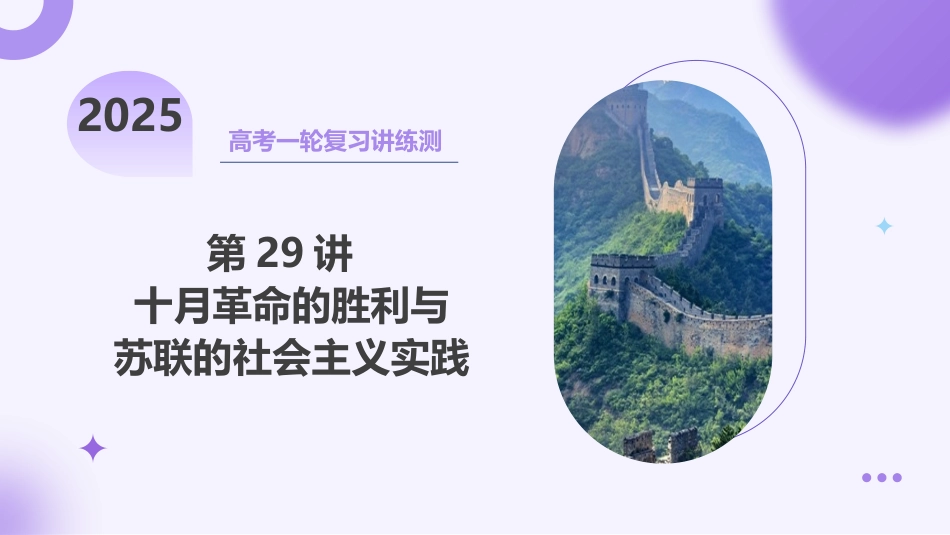 2025高考一轮复习讲练测第29讲十月革命的胜利与苏联的社会主义实践教材融合选必一纲要第14课当代中国的外交第11课马克思主义的诞生和传播第15课十月革命的胜利与苏联的社会主义实践选必二第6课现代科技进步与人类社会发展第9课二十世纪以来人类的经济与生活第13课现代战争与不同文化的碰撞交流目录01考情透视02知识导图03考点突破04真题练习考点一十月革命的胜利知识点1列宁主义的形成考向1列宁主义的形成知识点2十月革命的胜利考向2十月革命的胜利考点二苏联的社会主义实践知识点1战时共产主义政策考向1战时共产主义政策知识点2新经济政策考向2新经济政策知识点3高度集中的政治经济体制考向3斯大林模式01考情透视考点要求考题统计备考建议十月革命的胜利(3年6考)2024选择题:北京卷、全国新课标卷、湖南卷本讲为高考命题热点,复习时关注一些命题关键词:列宁主义、二月革命、十月革命、苏维埃政权、战时共产主义政策、余粮收集制、新经济政策、社会主义工业化、农业集体化苏联模式、计划经济体制。2023无2022选择题:全国乙卷、湖北卷非选择题:河北卷苏联建设社会主义实践(3年9考)2024选择题:浙江卷6月、江苏卷2023选择题:河北卷、辽宁卷、广东卷、浙江卷1月2022选择题:江苏卷、湖南卷、浙江卷6月复习目标:1、了解列宁领导的十月革命爆发的原因、过程,理解十月革命的世界意义。2、了解苏俄社会主义建设的实践过程认识其历史影响。02知识导图考点一十月革命的胜利知识点1列宁主义的形成1.背景(1)经济上:19世纪末20世纪初,俄国资本主义经济不断发展。(2)政治上:沙皇专制统治却持续强化,社会矛盾日益尖锐。(3)阶级上:工业的发展造就了俄国第一代产业工人。(4)组织上:1898年,俄国社会民主工党宣告成立,展开了有组织的工人运动。(5)思想上:1900年,流亡国外的列宁创办《火星报》,宣传马克思主义。2.形成:1903年,俄国社会民主工党举行第二次代表大会,这次代表大会标志着布尔什维克党的建立。党的指导思想是“布尔什维主义”,也就是列宁主义。023.内容(1)列宁认为,帝国主义是资本主义发展的最高阶段,“是无产阶级社会革命的前夜”。(2)由于资本主义发展的不平衡规律,俄国是“帝国主义链条中最薄弱的一环”。(3)“社会主义可能首先在少数甚至单独一个资本主义国家内获得胜利”。(4)工人阶级要以暴力推翻资产阶级政权,建立无产阶级专政。4.意义:(1)列宁深刻洞悉帝国主义时代资本主义发展的新特征,把马克思主义基本原理与俄国革命具体实际结合起来,形成了列宁主义。(2)创造性地提出社会主义可能在一国或数国首先取得胜利等一系列社会主义革命建设理论。(3)为帝国主义时代的无产阶级革命提供了强大思想武器。稿定PPT稿定PPT,海量素材持续更新,上千款模板选择总有一款适合你02核心素养-历史解释列宁主义对马克思主义的新发展史料:十月革命是以马克思主义的名义、口号和理论体系进行的……但其渊源、性质、风格和命运却深深地植根于俄国历史土壤之中。十月革命也许不能称为经典马克思主义和西方资本主义社会基础上的革命,却是俄国历史文化和社会演变的必然产物。一摘编自王康《十月革命90年:救赎、悲剧和启示》探究·拓展(1)关于无产阶级政党建设的理论:在适用于帝国主义时期无产阶级斗争的新条件下,建立了不同于第二国际各国政党的新型无产阶级政党——布尔什维克党。(2)关于帝国主义的理论:指出帝国主义是资本主义的最后阶段,揭露了资本主义的溃疡以及必然灭亡的条件,是对马克思主义划时代的贡献。(3)“一国胜利”理论:在帝国主义条件下,社会主义革命可以首先在一国或数国取得胜利的理论,这是帝国主义的时代特征和资本主义经济政治发展不平衡规律作用的结果。(4)关于民主革命向社会主义革命转变的理论:正确分析了由民主革命转变为社会主义革命的任务和策略,并且提出了无产阶级在民主革命中的领导权、无产阶级革命与资产阶级革命的区别问题。02考向1列宁主义的形成1.(2024·北京卷)马克思主义在俄国社会主义革命时期得到了丰富和发展。下列符合这一论断的是()A.“全世界无产者,联合起来”B.“公社…...