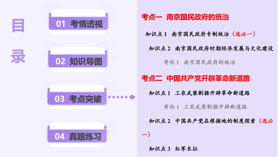 2025高考一轮复习讲练测第15讲南京国民政府的统治和中国共产党开辟革命新道路教材融合选必一纲要第3课中国近代至当代政治制度的演变第21课南京国民政府的统治和中国共产党开辟革命新道路目录01考情透视02知识导图03考点突破04真题练习考点一南京国民政府的统治知识点1南京国民政府专制统治(选必一)知识点2南京国民政府时期经济发展与文化建设考向1南京国民政府的统治考点二中国共产党开辟革命新道路知识点1工农武装割据开辟革命新道路考向1工农武装割据开辟新道路知识点2中国共产党在根据地的制度探索(选必一)知识点3红军长征01考情透视考点要求考题统计备考建议南京国民政府的统治(3年4考)2024选择题:辽宁卷本讲为高考命题热点,题型以选择题为主,复习时关注一些命题关键词:宁汉合流、“改旗易帜”、《训政纲领》、“改订新约”、法币改革、国民经济建设运动、币制改革、关税自主、南京博物院、民族工业的发展,南昌起义、八七会议、秋收起义、土地革命、“工农武装割据”政权建设、反“围剿”斗争、红军长征、长征精神、井冈山革命根据地、古田会议、“左”倾错误、遵义会议等复习时多关注。2023选择题:全国新课标2022选择题:天津卷非选择题:重庆卷工农武装割据与根据地的制度探索(3年5考)2024选择题:湖南卷2023选择题:河北卷、福建卷2022选择题:福建卷非选择题:北京卷红军长征(3年2考)2024非选择题:全国新课标卷2023无2022选择题:浙江卷1月复习目标:1、了解南京国民政府的成立,认识中国共产党开辟革命新道路的意义。2、了解中共在根据地的制度探索内容,认识红军长征的意义。02知识导图考点一南京国民政府的统治知识点1南京国民政府专制统治(选必一)1、“宁汉合流”:1927年秋,武汉国民政府与南京国民政府合并,史称“宁汉合流”。它标志着国民党一党专制统治的确立。2、“东北易帜”:(1)继续北伐、皇姑屯事件:1928年,国民政府继续北伐,讨伐张作霖。日本为阻挠北伐,制造了“济南惨案”。日本见张作霖不能满足他们的侵略要求,在皇姑屯将他炸死。(皇姑屯事件)(2)标志:1928年年底,张学良通电,宣告东北三省服从国民政府,改旗易帜。(3)影响:国民政府在形式上基本统一了全国。一、南京国民政府的专制统治稿定PPT稿定PPT,海量素材持续更新,上千款模板有选择总一款适合你021、国民党的“训政”①开始:1928年中国国民党成为中国新的统治者后,宣告军政时期结束,训政时期开始。②《训政纲领》:在训政时期,由国民党全国代表大会代表国民大会领导国民行使政权,大会闭会期间,把政权托付给国民党中央执行委员会;行政、立法、司法、考试、监察五项治权,托付给国民政府总揽执行;国民党中央执行委员会政治会议则负责指导监督国民政府的重大国务。③评价:“训政”就是剥夺人民权利的一党专制;违背了孙中山“主权在民”的初衷。二、南京国民政府的政治制度稿定PPT稿定PPT,海量素材持续更新,上千款模板有选择总一款适合你022、国民党的“宪政”①背景:国民党以种种借口一再拖延结束“训政”的时间。②过程:1948年,国民党打出“行宪”的招牌,召开“国民大会”,选举蒋介石、李宗仁为总统、副总统,建立总统府,取代国民政府。③评价:国民党政权作为大地主、大资产阶级的代表,企图以此为其独裁统治披上“宪政”的外衣,但最终逃脱不了崩溃的命运。021、背景:以北洋政府时期的文官制度为基础,继承吸收中国传统考试监察制度和西方文官制度的精华。2、标志:1929年《公务员任用条例》,1933年《公务员任用法》,标志着公务员制度建立。3、实施:公务员的选任由最高考试机关考试院负责,1929年,国民政府公布了第一部《考试法》,此后又颁布一系列法规。4、评价:①孙中山关于文官考试的思想主张,几乎全部以法律条文形式得到了确立。②《考试法》允许女子参加考试,具有更强的开放性和平等性。③尽管有制度规定,但实施过程漏洞百出,任用亲信拉帮结派现象始终无法禁绝三、南京国民政府的官员选拔制度02探究·拓展核心素养-历史解释史料:南京国民政府统治初期,随着考试院的成立和《考试法》《公务员任用法》等一系列法规的颁布,...