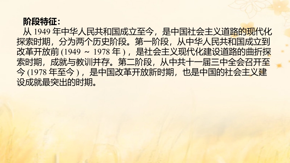 第七单元中华文明的再铸与复兴——现代中国时期阶段特征:从1949年中华人民共和国成立至今,是中国社会主义道路的现代化探索时期,分为两个历史阶段。第一阶段,从中华人民共和国成立到改革开放前(1949~1978年),是社会主义现代化建设道路的曲折探索时期,成就与教训并存。第二阶段,从中共十一届三中全会召开至今(1978年至今),是中国改革开放新时期,也是中国的社会主义建设成就最突出的时期。时空定位:线索主旨:当家作主:中华人民共和国的成立,为现代中国的政治建设与经济发展奠定了基础。中国共产党领导的多党合作和政治协商制度、人民代表大会制度和民族区域自治制度构成了我国民主政治制度的核心内容,使人民真正实现了当家作主。经过土地改革、三大改造和“一五”计划建设等,确立了社会主义制度,为社会主义工业化奠定了初步基础。面对复杂多变的国际局势,中国政府展开了独立自主的和平外交,提高了中国的国际声誉。峥嵘岁月:在全面建设社会主义时期,中国人民走自己的路,探索适合中国国情的社会主义建设道路。在“左”倾错误的影响下,走了不少弯路,如“大跃进”、人民公社化运动,使经济遭到严重的破坏;“文化大革命”严重破坏了民主法制建设。但在广大人民群众的抗争下,社会主义建设在探索中依然前进,取得诸多成就。伟大转折:中共十一届三中全会确立了实事求是的指导思想,作出了党和国家工作中心转移、改革开放的决策,开启了我国社会主义现代化建设的新时期。改革开放:对内全面改革,对外全面开放,实现了从高度集中的计划经济体制向充满活力的社会主义市场经济体制的过渡,中国社会从封闭半封闭走向了全方位开放,以全新的面貌走向世界。理论铸就:在改革开放的实践中,中国共产党人把马克思主义和中国具体国情相结合,铸就了中国特色的社会主义理论,形成中国特色社会主义思想文化,为新时期我国的经济、社会建设做好了理论准备。屹立世界:经过四十多年不懈努力,中国完成了从站起来、富起来到强起来的历史性跨越,更加自信地面向世界、面向未来,继续建设社会主义现代化强国。