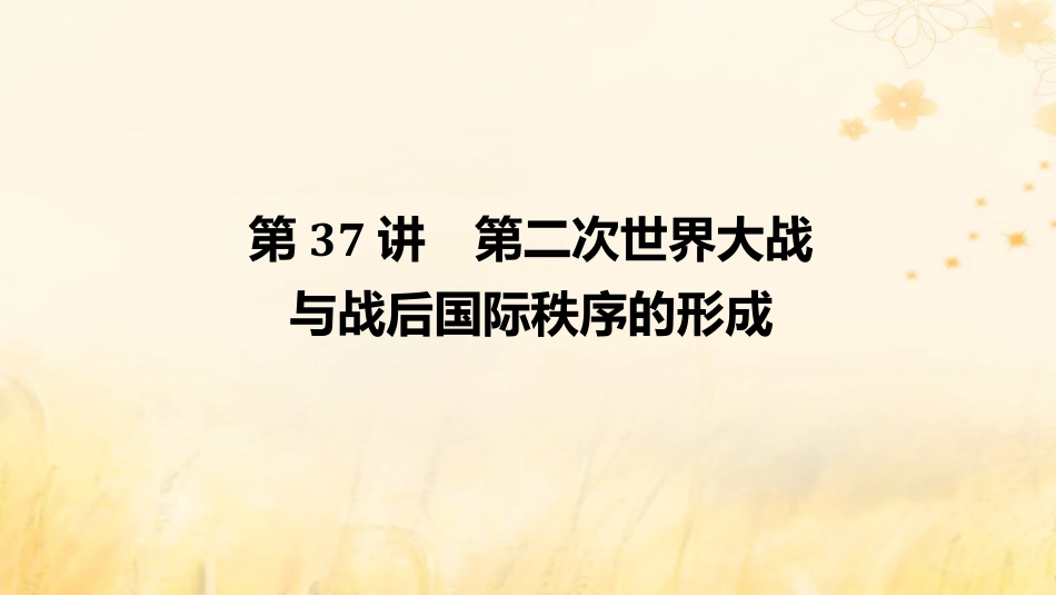 第37讲第二次世界大战与战后国际秩序的形成《中外历史纲要》课标要求《选择性必修》课标要求了解第二次世界大战,理解20世纪上半期国际秩序的变动。了解国际法的发展。自主排查素养提升聚焦高考自主排查知识点一法西斯主义与亚欧战争策源地的形成1.法西斯主义的形成过程意大利1922年,________建立了法西斯政权。德国1919年,希特勒加入德意志工人党,并成为领导人之一;1920年,德意志工人党改名为“________”,是德国法西斯运动的开始日本1921年,冈村宁次、东条英机等日本军人订立密约,是日本军部法西斯运动的开始基本特征法西斯主义以____________为基本特征,反对自由主义和共产主义,主张对内实行恐怖独裁统治,对外侵略扩张,发动战争,争霸世界墨索里尼纳粹党极端民族主义2.经济危机的影响(1)法西斯势力:面对1929年的经济大危机,法西斯分子鼓吹通过战争寻找出路。(2)罗斯福新政:美国走上了罗斯福新政的道路,缓解经济危机。3.亚欧战争策源地的形成(1)亚洲:1936年,日本建立__________专政,以扩大对外侵略为基本国策。第二次世界大战的亚洲战争策源地形成。(2)欧洲:1933年,纳粹党攫取德国政权,建立法西斯独裁统治,积极扩军备战。第二次世界大战的欧洲战争策源地形成。1935年,意大利入侵____________。1936年,意大利和德国结成________。军事法西斯埃塞俄比亚轴心国4.《慕尼黑协定》(1)背景:1938年,德国吞并奥地利,并对捷克斯洛伐克提出领土要求。英法实行________。(2)内容及影响:把________等地区割让给德国,更加助长了法西斯国家的侵略野心。绥靖政策苏台德知识点二第二次世界大战1.法西斯国家的侵略战争亚洲局部战争序幕1931年,日本制造__________,发动了侵华战争,拉开了第二次世界大战的序幕爆发1937年7月7日,日本制造________,发动了全面侵华战争,中国开始全民族抗战,这也成为第二次世界大战在亚洲爆发的标志欧洲战场扩大全面爆发____年9月,德国以“闪击战”突袭波兰,英法被迫对德宣战扩大德国占领欧洲大部分地区,法国败降,英国坚持抵抗1941年6月,德国入侵苏联,苏联战场成为抵抗纳粹德国的主战场太平洋战争1941年12月,日本挑起太平洋战争,美国对日宣战,第二次世界大战发展到________九一八事变七七事变1939全球阶段2.世界人民的反抗(1)中国人民的反抗:中华民族结成抗日民族统一战线,团结抗日,开辟了对日本法西斯持久作战的东方主战场。(2)反法西斯同盟建立:1942年1月,以美、英、苏、中为首的26个国家签署《____________》,建立世界反法西斯同盟。3.法西斯的投降:1943年,意大利投降,法西斯轴心国集团开始瓦解。1945年5月8日,德国投降。9月2日,日本签署无条件投降书,第二次世界大战结束。联合国家宣言4.二战的影响对欧洲欧洲在第二次世界大战中遭受________,各国的国力受到严重消耗对美国美国成为世界____经济、政治和军事强国对苏联苏联虽然经济逊于美国,但________和政治十分强大,特别是由于它在战争中的巨大贡献而赢得很高威望对国际格局第二次世界大战的结束成为国际格局从以欧洲为中心走向美苏对峙的________的真正转折点致命打击第一军事两极格局知识点三战后国际秩序的建立1.雅尔塔体系内涵第二次世界大战中后期,反法西斯同盟国的首脑相继在开罗、德黑兰、雅尔塔和波茨坦等地召开会议,缔结了一系列条约和协定,建立了战后国际秩序,史称“雅尔塔体系”主要内容(1)重新确定欧亚国家的版图(2)日本领土限制在四个岛屿与若干小岛(3)承认朝鲜最终独立(4)审判战犯,肃清__________和军国主义(5)对德、日、意的殖民地及国联的委托统治地实行托管,原则上承认被压迫民族的独立权利(6)美、苏、英划分势力范围(7)成立联合国评价(1)积极性:以建立和维护________为主要目标,提倡不同社会制度国家之间的共处与合作(2)消极性:是大国相互____的产物,带有明显的________色彩,严重损害了一些国家的利益法西斯主义世界和平妥协强权政治2.联合国建立时间1945年10月24日性质由主权国家组成的国际组织宗旨维护国际____与安全,加强国际合作,促进全球经济社会发展原则“大国一致”原则影响有利于世界和平与安全,有利于促...