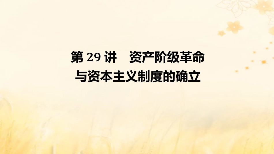 第29讲资产阶级革命与资本主义制度的确立《中外历史纲要》课标要求《选择性必修》课标要求认识资产阶级革命的发生和资本主义制度的确立,是近代西方政治思想理念的初步实现。1.了解近代西方政治体制各主要类型的产生和演变过程。2.了解近代西方法律制度及基本特征。3.通过了解近代史上的著名战争,理解战争对人类文化的破坏,以及造成的文化断裂;认识战争在客观上又为不同文化的碰撞提供了契机。自主排查素养提升聚焦高考自主排查知识点一英、美、法资产阶级革命1.英国资产阶级革命(1)背景:英国资产阶级和________在经济上日益强大,向专制王权发起挑战。(2)过程①爆发:1640年,英国爆发革命;经过两次内战,议会获胜。②曲折:英国经历了共和国、军事独裁和王朝复辟时期的反复斗争。③巩固:1688年,发生“________”,革命成果获得巩固。(3)法律保障①1689年通过《________》,扩大议会权力,限制王权。②1701年又通过《王位继承法》,规定此后国王不得为天主教徒,也不能与天主教徒结婚。(4)意义:“光荣革命后”,君主立宪制逐步形成。新贵族光荣革命权利法案2.美国独立战争(1)背景:18世纪中叶,英国对北美大西洋沿岸13块殖民地的种种限制和剥削,激起了北美人民的强烈不满,独立的呼声高涨。(2)历程①来克星顿枪声:1775年4月,来克星顿的民兵与英军发生冲突,美国独立战争开始。②《独立宣言》发表:________年7月4日,大陆会议发表《独立宣言》,阐述了人民主权思想,宣告北美殖民地脱离英国独立。③承认美国独立:1783年,英国承认美国独立。(3)性质:美国独立战争是一场________运动,也是一场资产阶级革命。1776民族独立3.法国大革命(1)背景:法国专制制度严重阻碍了资本主义发展,资产阶级迫切要求摆脱封建专制统治和等级制度的束缚;启蒙思想的影响。(2)进程①1789年7月14日,法国民众攻占巴士底狱,法国大革命爆发。②1789年8月,议会颁布《________》,提出人权、自由、平等、法治、人民主权和保护私有财产等原则。③1791年,议会颁布宪法,确立了新制度的基本框架。④1799年,拿破仑建立军事独裁统治。1815年,拿破仑帝国覆灭。(3)意义:沉重打击了欧洲其他国家的封建制度,革命的原则随着拿破仑军队传播到欧洲各地。人权宣言4.拿破仑战争后欧洲文化的重构【接链·性必修选择3·第12】课(1)原因①拿破通建立了一大的帝,播了仑过战争个庞国传________。②拿破迫被征服地,洲各地民主意和民族立要求不仑压区欧识独断高。涨(2)容:封建、制成矢之的,民主、立、自由、法治等成内专为众独洲的普遍求。为欧诉(3)代表①俄的国“____________”,推翻沙皇制制度和奴制。试图专农②波沙了取民族立的起。兰华发动争独义③普士行不底的除奴制改革。鲁进彻废农④地利和普士生要求建立一的立家、制定法的革命。奥鲁发统独国宪启蒙思想十二月党人知识点二资本主义制度的确立1.资本主义经济制度的确立(1)背景:资产阶级革命的成功。(2)实质:以资本家占有生产资料和雇佣劳动为基础,实质是资本剥削雇佣劳动的制度。2.西方资本主义政治制度的产生与发展【接链·性必修选择1·第2】课(1)生产英国:君主立宪制①17世纪,通过资产阶级革命,奠定了英国君主立宪制的基础。②18世纪,逐渐形成内阁制度。任命议会多数派领袖出任首相,内阁实际掌握政府权力。美国:联邦共和制①背景:北美独立战争后建立了美利坚合众国,1787年美国制定宪法。②内容:实行三权分立。总统是政府首脑,掌握行政权;国会拥有立法权和批准税收的权力;司法权属于最高法院和国会规定设立的下级法院。法国:议会共和制①1792年,法国首次建立共和国。②1870年,法国建立第三共和国。③1875年,通过新宪法。经过数年动荡,法国确立了共和制。(2)评价①积极性:适应了资本主义发展的需要,部分实现了文艺复兴和________的理想。②局限性:英国妇女长期没有选举权,美国宪法一度承认了黑人奴隶制的合法地位。启蒙运动3.资本主义法律制度【接链·性必修选择1·第9】课(1)英美法系①形成:“光革命荣”后,英确立了君主立制,法律体系更加完国宪善。美等很多家在英法律的基上制定了本法律,国国学习国础国...