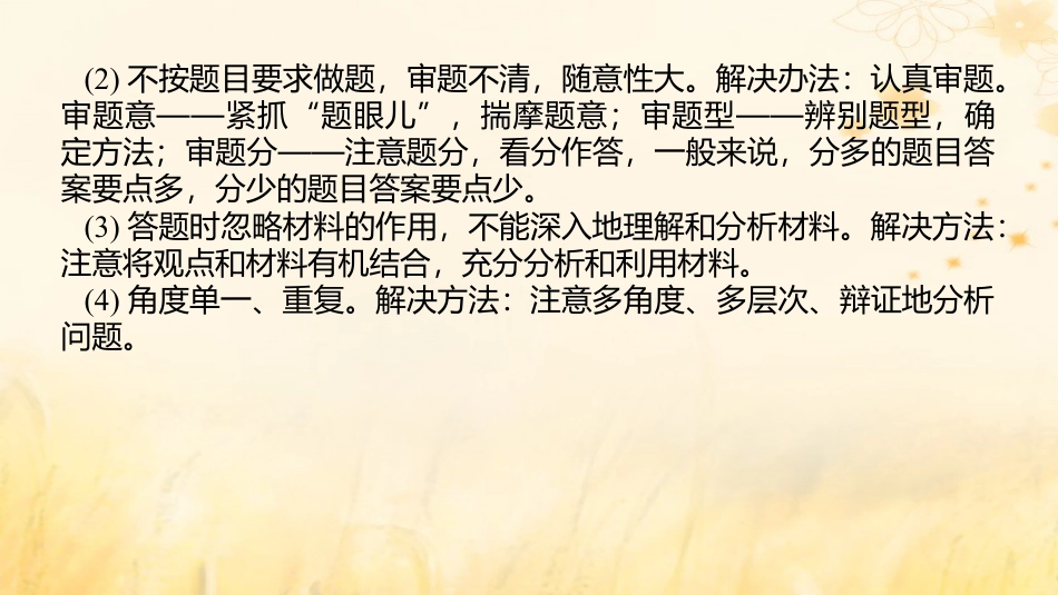 大题突破技法⑦解答非选择题的常见失误及解决办法近几年高考试题大多通过运用“新材料”、设置“新情境”来命制试题,对学生的阅读、理解、运用材料的能力要求越来越高,因此掌握好解题技巧是高考中“水平正(超)常发挥”的关键,应特别注意解答非选择题常见失误及解决办法:(1)答题没有思考的过程,看到题目就写,没有完整的答题思路。解决办法:在初读材料的基础上,注意审题,看清问题的具体要求,然后带着问题细读材料;明确材料的主题,了解材料的层次结构;对应材料内容,思考材料内容与教材知识的结合点。(2)不按题目要求做题,审题不清,随意性大。解决办法:认真审题。审题意——紧抓“题眼儿”,揣摩题意;审题型——辨别题型,确定方法;审题分——注意题分,看分作答,一般来说,分多的题目答案要点多,分少的题目答案要点少。(3)答题时忽略材料的作用,不能深入地理解和分析材料。解决方法:注意将观点和材料有机结合,充分分析和利用材料。(4)角度单一、重复。解决方法:注意多角度、多层次、辩证地分析问题。经典示例——在体验中品悟技法[例][2022·广高考,东17]有同究明代白化,收学研银货币问题集了如下材料。材料合所知,完成下列要求。阅读并结学识(14分)材料一明代政收入财——据《明》实录年份米麦(万石)布(万匹)绢(万匹)宝钞(万锭)银(万两)1430397920.594.17388.932.91552265913.332.02414.4243.31621278012.920.68.1755.2材料二《醒世姻》、缘传“三言”、“二拍”等小中有白的描说关银述不可,大到如捐官、行、房、人口,小到如日常消胜数贿购买卖费和社交,可。的使用只是第二位的,以物易物也不馈赠处处见铜钱频繁。——据《醒世姻》等缘传材料三吾以非金不可。金,其利有七:粟帛之,小为废银废银属民力能自致,家易足,一也。以通有无,者不息,无竭,则铸钱铸货匮二也。不藏金,无甚甚富之家,三也。银贫……——宗羲《明夷待黄》访录(1)分述每材料究明代白化的价。别阐则对研银货币值(6分)(2)合上述材料,述明代白化的影。综简银货币响(6分)(3)除上述材料之外,究明代白化可充些型的史料,研银货币还补哪类至少列出。请两种(2分)[微点拨](1)依据解答非的常失及解法,解答选择题见误决办时注意材料一表格中明朝政收入中白所占比重迅速上升,明应财银说当出白化。《明》是的官修史,史料价高,时现银货币实录当时书值较具有高可信度。材料二出自明代小,于的文作品,较说属当时学记载社各使用白的情,明社流行使用白,文作品会阶层银况说当时会银学于二手史料,有一定的考和使用价。属参值材料三出自宗羲的著作,宗羲不同使用白,一定程度上反黄黄赞银映白化的面影,可以作究明代白使用的重要材银货币带来负响为研银料。(2)在的基上,材料,依据材料一表格可知,白在审清设问础细读银明代政收入中所占比重大幅上升,系所中古代制度可得财联学国赋税出,白化推了明代役制度的革;依据材料二的银货币动赋变“白银……大到如捐官、行、房、人口,小到如日常消和社交,贿购买卖费馈赠可处处见”可得出白化促商品展和社消念化,银货币进经济发会费观变冲了道德念。根据材料三击传统观“不藏金,无甚甚富之家银贫”可得出白化造成富不均等社。银货币贫会问题(3)究明代白化的史料可以充物史料和外文史料,研银货币还补实国献如出土的明代,新航路辟后西班牙或葡萄牙同明行易的相银锭开进贸文。关献记载模拟演练——在训练中创新应用1.[2021·浙江卷1月,28,节选]一多民族家的形成展,统国与发奠定了中民族大的史文化基。材料,回答。华伟复兴历础阅读问题(14分)材料一秦海,兼侯,南面帝,以四海。天下之士斐然并内诸称养。若是者何也?曰:近古之无王者久矣。周室卑微,五霸,乡风既殁令不行于天下,是以侯力政,强侵弱,暴寡,兵革不休,士民诸众罢敝。今秦南面而王天下,是上有天子也。元元之民冀得安其性命,既莫不心而仰上。虚——引自司《史》马迁记材料二(康熙帝)曰:“治天下自有本原,不恃阻。专险……守国之道,惟在修德安民,民心服邦本得,而境自固,所志成悦则边谓众城者是也。”(雍正帝):谕内阁“中之一始于秦氏,塞外之一国统统始于元...