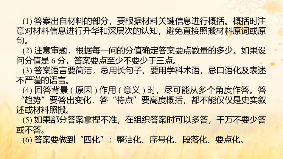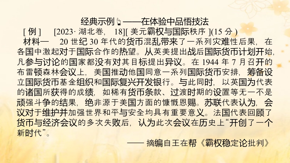 大题突破技法㉑答案言的语与表述组织训练(1)答案出自材料的部分,要根据材料关键信息进行概括。概括时注意对材料信息进行升华和深层次的认知,避免直接照搬材料原词或原句。(2)注意审题,根据每一问的分值确定答案要点数量的多少。如果设问分值是6分,答案要点至少不要少于三点。(3)答案语言要简洁,忌用长句子,要用学科术语,忌口语化及表述不严谨的语言。(4)回答背景(原因)作用(意义)时,尽可能从多个角度作答。答“趋势”要答出变化,答“特点”要高度概括,都不能仅仅是史实叙述或材料照搬。(5)如果部分答案拿捏不准,在组织答案时可以多答,千万不要少答或不答。(6)答案要做到“四化”:整洁化、序号化、段落化、要点化。经典示例——在体验中品悟技法[例][2023·湖北卷,18][美元霸秩序权与国际](15分)材料—20世纪30年代的混了一系列灾性后果,在货币乱带来难各中激起于合作的望。英美提出后始,国对国际热从战国际货币计划开凡的家都有其目提出。在参与讨论国没对标异议1944年7月召的开布雷森林上,美推他同意一系列安排,顿会议国动国国际货币筹备设立基金和行。此同,以英代表国际货币组织国际复兴开发银与时国为的所得的成,如稀有款、渡期的置等无一不是诸国获绩货币条过时设强斗的果,非源于美方面的慷慨恩。代表,顽争结绝国赐苏联认为会于加强世界和平安全均具有重要意。法代表回了议对维护并与义国顾的多次失后,此次在史上货币与经济会议败认为会议历“了一开创个新代时”。——摘自王在《霸定批判》编帮权稳论材料二1971年8月15日,尼克松未他商量便自宣布停止与国径美元金,直接致布雷森林体系固定率制度的崩,引起兑换黄导顿汇溃世界然。在各一重大故之,大多策者中哗国讨论应对这变时数决头脑不浮的是,大成一次世界大灾的事件——断现将萧条转变难1933年世界的失、粹主的起以及最后的世界大。但宏经济会议败纳义兴战从角看,些担心被普遍夸大了。浮率有或政观视这动汇没带来经济萧条治混,更有引,布雷森林体系其他机制得以延。乱没发战争顿续——摘自编[美]弗朗西斯·加文《金、美元力》黄与权(1)根据材料一并结合所学,指出20世纪30年代货币混乱的表现,简析布雷顿森林会议“开创了一个新时代”的含义。(6分)点拨:第一小,由材料一问“20世纪30年代的混货币乱”可知,此在危机冲下,原有以英中心的金本位制瓦解,合时经济击国为国际结所知可得出主要本主大建以各自家中心的学识当时资义国构国货币为集。第二小,布雷森林货币团问顿会议“了一新代开创个时”,是设问“新代开创时”的含,意是生回答召后世界义图让学会议开对经济发挥的重要作用,合所容可提出在一定程度上促了易的结学内它进国际贸展,定了金融,同也促世界逐步朝制度化、体系化发稳国际时进经济方向,促了全球化的展。迈进进经济发(2)根据材料并结合所学,说明浮动汇率没有引发经济萧条等严重后果的原因,并评价美国停止美元兑换黄金的举措。(9分)点拨:由材料二“布雷森林体系其他机制得以延顿续”系所知并联学可得出:布雷森林体系表面上瓦解了,但一些机制仍在作识顿虽发挥用,只是体系中主要家的目改了,美元仍然是世界上最主货币国标变要的,合所知,布雷森林体系瓦解后浮率制度储备货币结学识顿动汇而生,而至今仍在作用,有其本身的。所以布雷森林应运发挥优势顿体系瓦解后,浮率的行有引等重后果。价:动汇实并没发经济萧条严评可美的家利益、的背景等角度思考。从国国当时国际模拟演练——在训练中洞悉导向1.[2023·海南卷,18]材料,完成下列要求。阅读(13分)材料海上格局指家力量在海上的比。国对态势16~17世,葡萄纪牙、西班牙、荷先后成海上霸主。兰为17世中后期,在英海纪与国战失利后,荷的霸主地位被取代。兰18世至纪19世初,英多次纪国击败法,持了海上霸。次世界大之,美海崛起,英、美、国维权两战间国权法、日等海家立。二束后,美海成一无二的海上力权国并战结国军为独量。21世以,纪来“海上多极”明。趋势显海上格局的焦点集中在大方面:一是于力量比的;二转换两关对竞争是于海洋的博弈。西方家强关规则国调“基于的秩序规则国际”,但在对海洋的理解上,...