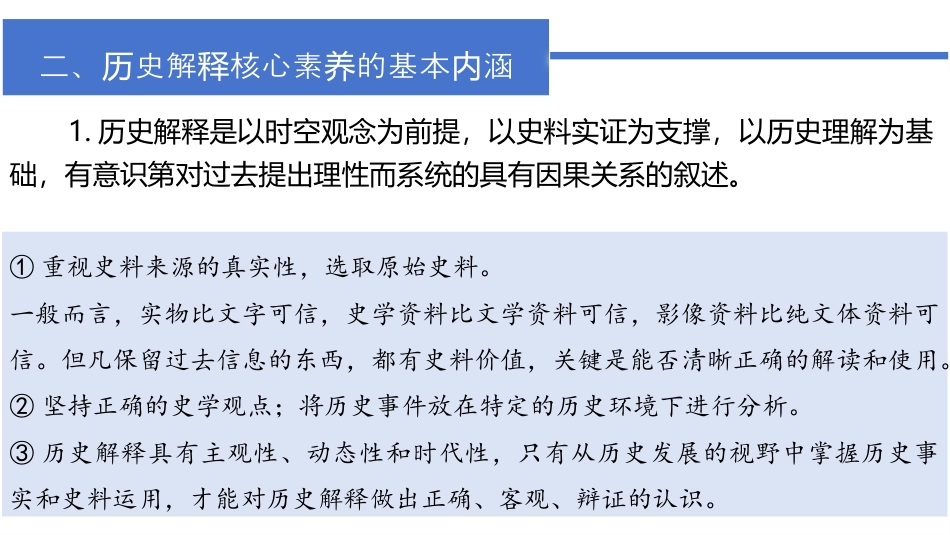 历史学科核心素养历史解释——历史解释是指以史料为依据,对历史事物进行理性分析和客观评判的态度、能力与方法。1.历史解释是以时空观念为前提,以史料实证为支撑,以历史理解为基础,有意识第对过去提出理性而系统的具有因果关系的叙述。①重视史料来源的真实性,选取原始史料。一般而言,实物比文字可信,史学资料比文学资料可信,影像资料比纯文体资料可信。但凡保留过去信息的东西,都有史料价值,关键是能否清晰正确的解读和使用。②坚持正确的史学观点;将历史事件放在特定的历史环境下进行分析。③历史解释具有主观性、动态性和时代性,只有从历史发展的视野中掌握历史事实和史料运用,才能对历史解释做出正确、客观、辩证的认识。二、史解核心素的基本涵历释养内2.所有历史叙述在本质上都是对历史的解释。(人们通过多种不同的方式描述和解释过去,对历史的解释是多样的。)多元史观认识辛亥革命社史会观废除一些陈规陋习,在一定程度上推动近代物质生活和礼仪习俗的变革文明史观促进中国传统文明向现代文明的转变,是中华文明发展史上的里程碑整体史观辛亥革命是世界资产阶级革命的组成部分,推动世界(首先是亚洲)资产阶级革命的发展二、史解核心素的基本涵历释养内3.对同一历史事物的叙述会有不同的解释。(个人所处的历史条件、社会经济地位、立场观点和方法的差异;史料的局限等影响历史认识。)对鸦片战争的认识:侵略战争?通商战争?对太平天国运动的认识:清政府的立场...革命者的立场...二、史解核心素的基本涵历释养内二、史解核心素的意历释养义使学生对史事的记忆提升到历史认识的高度。1.历史历史上的变化与延续、继承与发展、动机与效果、内因与外因、偶然与必然、局部与全局等方面的联系;2.能够实事求是地分析、概况史事的特征、性质、意义及影响;3.能够区分历史叙述中的史实与阐释;4.理解历史学家和他人是如何通过不同的手段及方式对历史进行解释,并评价各种历史解释的意义和价值的;5.在论述历史时,能够把握历史发展的各种联系,从历史发展的多样性和纵向联系的角度对历史进行解释;6.能够运用科学的史观,全面、清晰地表达自己对历史的看法。三、高考中的史解题历释1.事性史解:建史的脉。叙历释构历络叙事性历史解释主要通过对众多史料进行解读、比较和推理等来建构历史,主要叙述清楚历史事件的过程。1.(2022江苏高考)赵国明《中国的立场》一诗写道:“万国(联合国)旗帜欲添丁,孤岛、红旗都有名。山姆(美国)阴谋如获胜,不教公使到西京(纽约)。”该诗佐证了,中华人民共和国()A.与美国的关系趋向紧张B.在联合国行使否决权C.抵制美国构建单极世界D.反对“双重代表权”案【答案】D三、高考中的史解题历释1.事性史解:建史的脉。叙历释构历络叙事性历史解释主要通过对众多史料进行解读、比较和推理等来建构历史,主要叙述清楚历史事件的过程。2.(2024辽宁高考)唐代宗大历初年,国子司业归崇敬上疏提出,明经科考试“不求其文义,及第先取于帖经”,士子为了应试,多死记硬背儒家经典,不从师不问道,遂使“专门业废”“传受义绝”。其所强调的是()A.明经科考试改革的必要性B.复兴儒学的紧迫性C.进士科考试内容的合理性D.官学教育的重要性【答案】A三、高考中的史解题历释2.(2024辽宁高考)1947年,河北景县流传着歌谣:“吃八路,穿八路,住八路,为什么不去当八路。”南宫县的新兵说:“好日子是毛主席给的,不打老蒋是没心肝的,所以我要坚决打老蒋。”肥乡县的农民说:“我得报恩,我老了,我送我儿子参军。”这反映出()A.解放战争进入决战阶段B.减租减息激发了革命热情C.国民政府陷入统治危机D.土地改革取得了显著成效【答案】D2.律性史解:史的因果等。规历释历逻辑马克思主义认为,客观世界是一个普遍联系着的统一整体,它是有因果等规律的,这一类历史解释需在一定的史观、方法的指引下,运用多种史料进行逻辑推理后做出合理的解释。三、高考中的史解题历释2.律性史解:史的因果等。规历释历逻辑马克思主义认为,客观世界是一个普遍联系着的统一整体,它是有因果等规律的,这一类历史解释需在一定的史观、方法的...