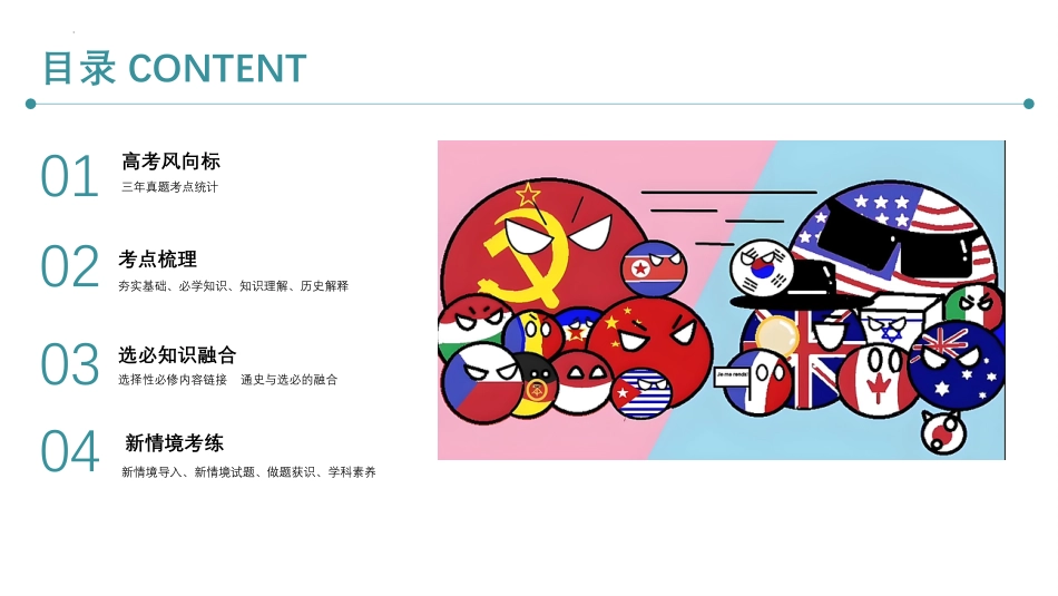 高三历史一轮复习探究专题2020世纪下半叶世界的新变化与当代世界大发展2025目录CONTENT三年真题考点统计高考风向标夯实基础、必学知识、知识理解、历史解释考点梳理选择性必修内容链接通史与选必的融合选必知识融合新情境导入、新情境试题、做题获识、学科素养新情境考练01020304专题2020世纪下半叶世界的新变化与当代世界的大发展第二次世界大战后,国际形势发展的主要态势是持续了近半个世纪的冷战。与此同时,整个世界也发生了深刻变化。资本主义国家形成了一定的自我调节机制,经济在高科技推动下迅速发展,社会矛盾有所缓和,但资本主义制度的基本矛盾依然存在并继续发展。社会主义国家的建设获得巨大成就,也经历了艰难曲折。中国特色社会主义建设取得举世瞩目的成就,证明了社会主义的强大生机与活力。战后世界殖民体系的崩溃,是人类历史的巨大进步。独立后的发展中国家为维护国家主权、促进社会发展、改变不合理的国际政治经济秩序进行着不懈的努力。在冷战形成的两极格局中,孕育着世界多极化的发展趋势。专题概要课程标准素养解读核心概念通过了解第二次世界大战后资本主义、社会主义与第三世界国家的变化,认识其发展中的成就与问题;通过了解冷战时期的典型事件,认识冷战的基本特征,理解冷战的发生、发展与世界格局变化之间的相互影响。1、能够理解分析两极格局形成的原因,从对峙的角度把握美苏两极格局形成的过程。(时空观念、历史解释)2.能够运用相关史料探究分析两极格局的影响,利用唯物史观认识两极格局。(唯物史观)3.了解冷战的发展情况,分析多极力量成长对两极格局的冲击。(历史解释)4.识记两极格局瓦解的过程,探究促使两极格局瓦解的原因。(史料实证、历史解释)冷战两极格局北约与华约福利国家国家宏观调控苏联的改革中国崛起世界殖民体系瓦解【课程标准与素养解读】1949年1956年1962年1964年时间轴---时空坐标专题2020世纪下半叶世界的新变化与当代世界的大发展1955年1960年20世界40年代1947年1961年1993年1991年1985年1979年20世纪70年代科学技术新发展杜鲁门主义马歇尔计划印巴分治北约建立华约建立苏联解体赫鲁晓夫改革非洲年勃列日涅夫上台经济滞胀苏联入侵阿富汗古巴导弹危机戈尔巴乔夫改革巴拿马收回运河古巴成为社会主义国家国际货币基金组织世界银行和平发展成为世界主题APEC成立(1989年)北美自贸区(1994年欧洲联盟1994年1999年2015年亚投行2013年一带一路倡议人类命运共同体20国集团伊拉克战争国际金融危机(2008)真题类型考点素养考察2024山东卷英国经济竞争力下降史料实证2024年新课标卷美元占据国际货币体系主导地位历史解释2024河北卷西方阵营逐渐分化历史解释2023广东卷西方国家适当减少对经济的干预历史解释2023湖南卷农业技术变迁呈现出节约劳动力的倾向历史解释2023全国乙卷发展中国家的经济地位下降历史解释2023浙江6月卷社会福利开支增加的同时贫困状况并没有缓解历史解释2023年山东卷美国政府外交战略的调整历史解释2023天津卷经济全球化程度提高历史解释2023新课标卷推卸发达国家应承担的历史责任历史解释2023重庆卷国际移民对话机制史料实证高考考向盘点考向分析对策:(1)该专题涉及到的知识与国际重大问题密切相关。(2)注意新背景下资本主义的新变化。(3)关注国际时事热点。(4)关注美对华的新冷战。该专题高考真题较多,说明该主要涉及经济、政治和外交等方面;设计问题有:大国的兴衰、国际货币体系、西方阵营的分化、全球化趋势、贫困问题、美国外交战略的调整等。考点一冷战与国际格局的演变考点一冷战与国际格局的演变一、“冷战”的形成1.冷战的含义指20世纪40年代中后期至80年代末90年代初,以美苏为首的两大集团之间逐步形成的既非战争又非和平的长期对峙与竞争状态。2.原因:美国和苏联两个超级大国社会制度完全不同、战时同盟基础不复存在、国家利益严重冲突、意识形态尖锐对立。3.开始标志:1947年3月,杜鲁门发表被称为“杜鲁门主义”的演说。项目以美国为首的资本主义阵营以苏联为首的社会主义阵营政治杜鲁门主义共产党和工人党情报局经济马歇尔计划经济互助委员会军事1949年,成立“北约”1955年,成立...