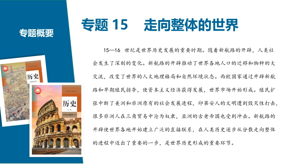 高三历史一轮复习探究专题15走向整体的世界2025迪亚士达伽马麦哲伦哥伦布目录CONTENT三年真题考点统计高考风向标夯实基础、必学知识、知识理解、历史解释考点梳理选择性必修内容链接通史与选必的融合选必知识融合新情境导入、新情境试题、做题获识、学科素养新情境考练01020304专题15走向整体的世界15—16世纪是世界历史发展的重要时期。随着新航路的开辟,人类社会发生了深刻的变化。新航路的开辟推动了世界各地人口的迁移和物种的大交流,改变了世界的人文地理格局和自然环境状态。西欧国家通过开辟新航路和早期殖民掠夺,使资本主义经济获得发展,世界市场开始形成。殖民扩张中断了美洲和非洲原有的社会发展进程,印第安人的文明遭到毁灭性打击,很多非洲人在三角贸易中沦为奴隶,亚洲的古老帝国也受到冲击。新航路的开辟使世界各地开始建立广泛的直接联系,在人类历史逐步从分散走向整体的进程中迈出了重要的一步,是世界历史形成的重要环节。专题概要课程标准素养解读核心概念通过了解新航路开辟所引发的全球性流动、人类认识世界的视野和能力的改变,以及对世界各区域文明的不同影响,理解新航路开辟是人类历史从分散走向整体过程中的重要节点。(1)时空观念:了解迪亚士、达伽马、哥伦布及麦哲伦开辟新航线的时间及空间路线。(2)史料实证:通过相关文物、文献资料了解新航路开辟的壮举。(3)历史解释:理解全球航路开辟的影响;能辩证地看待开辟新航路的两面性(4)唯物史观:了解新航路开辟的必然性和根源。新航路的开辟是在生产力发展到一定水平的必然结果;理解新航路开辟后,全球化成为历史发展的必然趋势(4)家国情怀:了解航海家勇于探索、不怕艰险的精神及为人类做出的重大贡献。马可•波罗迪亚士达伽马哥伦布麦哲伦其他航路的开辟教皇子午线物种交换早期殖民扩张【课程标准与素养解读】1488年到达美洲的航线到达非洲大陆南端航线1492年1498年1519年1522年1571年17世纪到达印度的航线18世纪证实地圆学说迪亚士到达好望角1368年郑和下西洋(1405-1433年)明朝灭亡清军入关明朝中国时间轴---时空坐标世界1497年哥伦布发现美洲卡伯特父子发现纽芬兰岛达˙伽马到达印度麦哲伦环球航行1578年马尼拉大帆船航线奴隶贸易(十五世纪中期至19世纪中叶)1644年清前期德雷克到达好望角荷兰、英国、法国的早期殖民扩张以葡萄牙、西班牙为主的早期殖民扩张1553年葡萄牙人贿赂地方官盘踞澳门1624年荷兰开始占领台湾1662年郑成功收复台湾真题类型考点素养考察2023广东卷全球航路开辟的影响历史解释2023年海南卷巧克力成为大众商品的根本原因历史解释2023年江苏卷教皇子午线历史解释2023年山东卷西、葡殖民优势逐渐被打破历史解释2022福建卷殖民侵略改变了区域人口结构史料实证2021浙江卷麦哲伦深信地圆学说历史解释高考考向盘点考向分析对策:(1)关注与新航路开辟相关的历史知识内容。(2)主要理解新航路开辟的影响。(3)注意适应情境的多样化。这一单元三年试题只有6个,数量较少。涉及新航路开辟的影响、西葡纷争而来的教皇子午线、物种传播、殖民侵略改变区域人口结构等;考察情境呈现多样化。考点一新航路开辟考点一新航路开辟1.新航路开辟的动因和条件(1)原因:经济根源:14-15世纪,西欧国家商品经济发展,出现了资本主义萌芽;黄金、白银的需求量日益增加。社会根源:《马可·波罗行纪》中对中国的描写,使欧洲兴起了寻金热。直接原因:奥斯曼帝国威胁东西方之间陆路贸易通道的安全,西欧人急于从海上开辟通往东方的新航路。精神动力:教会传播基督教的热情;文艺复兴时期人文主义提倡冒险精神(2)条件:主观条件——西班牙和葡萄牙王室支持海外探险活动;客观条件——地理知识的进步:欧洲航海技术和造船技术的发展2.新航路的开辟(1)主要航线的开辟时间航海家支持国家方向开辟的新航线1487年迪亚士葡萄牙从欧洲向东抵达非洲西南端的好望角1497—1498年达·伽马葡萄牙从欧洲向东绕过好望角到达印度1492年哥伦布西班牙从欧洲向西开辟了通往美洲的新航路1519—1522年麦哲伦船队西班牙从欧洲向西完成了环球航行考点一新航路开辟(2)其他航路的开辟①背景:新航路开辟后...