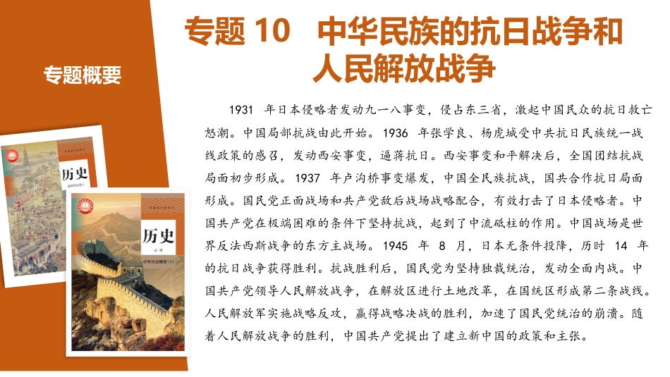 高三历史一轮复习探究专题10中华民族的抗日战争和人民解放战争2025目录CONTENT三年真题考点统计高考风向标夯实基础、必学知识、知识理解、历史解释考点梳理选择性必修内容链接通史与选必的融合选必知识融合新情境导入、新情境试题、做题获识、学科素养新情境考练01020304专题10中华民族的抗日战争和人民解放战争1931年日本侵略者发动九一八事变,侵占东三省,激起中国民众的抗日救亡怒潮。中国局部抗战由此开始。1936年张学良、杨虎城受中共抗日民族统一战线政策的感召,发动西安事变,逼蒋抗日。西安事变和平解决后,全国团结抗战局面初步形成。1937年卢沟桥事变爆发,中国全民族抗战,国共合作抗日局面形成。国民党正面战场和共产党敌后战场战略配合,有效打击了日本侵略者。中国共产党在极端困难的条件下坚持抗战,起到了中流砥柱的作用。中国战场是世界反法西斯战争的东方主战场。1945年8月,日本无条件投降,历时14年的抗日战争获得胜利。抗战胜利后,国民党为坚持独裁统治,发动全面内战。中国共产党领导人民解放战争,在解放区进行土地改革,在国统区形成第二条战线。人民解放军实施战略反攻,赢得战略决战的胜利,加速了国民党统治的崩溃。随着人民解放战争的胜利,中国共产党提出了建立新中国的政策和主张。专题概要课程标准素养解读核心概念了解日本军国主义的侵华罪行;通过了解正面战场和敌后战场的抗战,感悟中华民族英勇不屈的精神,认识中国共产党是全民族团结抗战的中流砥柱;认识中国战场是世界反法西斯战争的东方主战场,理解十四年抗战胜利在中华民族伟大复兴中的历史意义。通过了解全面内战的爆发及人民解放战争的进程,分析国民党政权在大陆统治灭亡的原因。1.唯物史观:人心向背是决定战争胜负的关键。2.时空观念:历史分期和重大战役及重大事件时间。3.史料实证:通过相关文件和史料研究革命斗争的史实及经验教训。3.历史解释:中国为世界反法西斯战争胜利做出重大贡献4.家国情怀:中华民族抗日的血肉长城。九一八事变七七事变西安事变抗日民族统一战线七大日本投降重庆谈判三大战役七届二中全会【课程标准与素养解读】时间轴---时空坐标(1931-1949年)九一八事变重庆谈判抗日义勇军1931年1933年1936年专题10抗日战争和人民解放战争1935年“一二九”运动西安事变1937年第二次国共合作;抗日民族统一战线形成1947年1946年七大全面内战爆发1945年中华民族局部抗战开始全民族抗战开始1937.9年抗战胜利新中国成立日本投降华北事变七七事变战略反攻1949年战略决战七届二中全会局部抗战过渡时期解放战争时期全面抗战真题类型考点素养考察2023北京卷抗战时期根据地建设历史解释2023年海南卷平型关大捷的价值认同历史解释2023年湖南卷根据地减负历史解释2023年江苏卷“七大”对未来的憧憬史料实证;历史解释2023年浙江卷边去政府组织机构史料实证2023山东卷边区民众剧团历史解释2023全国甲卷根据地提高妇女地位历史解释2023年福建卷抗日宣传和动员历史解释2023湖北卷根据地经验史料实证2023重庆卷上海舞女救亡演出历史解释2022天津卷黄河决口原因历史解释高考考向盘点考向分析对策:(1)加强抗战史复习,特别是抗战时期陕甘宁边区及其他根据地的政权建设和经济政策;新趋势是文化方面考察力度加大,如价值认同、抗日宣传。(2)还涉及抗战时期黄河决口事件。考查经济考查政治考查社会观念变化试题数量534占比41%25%33%2023年高考真题考查明清试题统计表(共12题)这一目试题较多,考察热门,而且90%试题考察抗战时期的根据地建设(政治、经济和文建设)。而且考察基本为新情境试题,课本未涉及的情境。解放战争考察较少。考点一从局部抗战到全面抗战抗日义勇军卢沟桥守军一、局部抗战1、日本侵华考点一从局部抗战到全面抗战原因蓄谋已久灭亡中国,称霸西太平洋是日本帝国主义的既定国策转嫁危机日本为摆脱1929年资本主义世界性经济危机造成的困境,企图将经济危机转嫁给中国,急于发动侵华战争有机可乘1931年,中国正处于国共内战时期,给日本侵华造成可乘之机(另:国际绥靖之风也有影响)表现1931年日本关东军制造了九一八事变,标志着中国局部抗战的开始。随后...