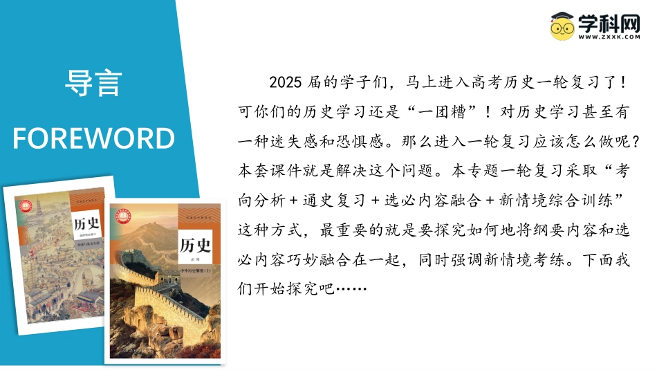 FOREWORD导言2025届的学子们,马上进入高考历史一轮复习了!可你们的历史学习还是“一团糟”!对历史学习甚至有一种迷失感和恐惧感。那么进入一轮复习应该怎么做呢?本套课件就是解决这个问题。本专题一轮复习采取“考向分析+通史复习+选必内容融合+新情境综合训练”这种方式,最重要的就是要探究如何地将纲要内容和选必内容巧妙融合在一起,同时强调新情境考练。下面我们开始探究吧……一轮复习注意事项和复习目标:1、时空定位:通过时间轴解决同学学习中时空混乱,注重将历史事件放在特定的背景下考虑。2、知识体系构建:通过思维导图构建知识框架。3、抓住主干知识复习,对知识理解到位。刷题不在多在精!在有效!5、提升学科素养6、重视考向分析,加强教考衔接。7、中外史纲要与选择性必修内容融合。统一多民族国家发展历程中国史复习线索(中国古代史)形成与发展(中国近代史)救亡图存(中国现代史)伟大复兴中华文明的起源和奠基(先秦)统一多民族国家的建立和巩固(秦汉)三国两晋南北朝时期的民族交融(魏晋南北朝)统一多民族国家的发展与繁荣(隋唐)辽宋夏金多民族政权的并立与元朝的统一(辽宋夏金元)统一多民族国家的疆域奠定和面临的挑战(明清)晚清时期的内忧外患与救亡图存辛亥革命与中华民国的建立中国共产党成立与新民主主义革命兴起中华民族的抗战和人民解放战争中华人民共和国成立和社会主义革命与建设中国特色社会主义根据线索构建专题历史线索是历史学科中的骨架和脉络,它能够帮助学生将基本史实和历史概念串联起来,形成完整的历史认识。世界文明发展史世界史复习线索(世界古代史01)早期文明(世界古代史02)中古文明(世界近现代史)工业文明古代文明的产生和发展中古时期的世界走向整体的世界资本主义制度的确立工业革命和马克思主义的诞生世界殖民体系和亚非拉民族解放运动两次世界大战、十月革命与国际秩序的演变20世纪下半叶世界的新变化中国史按“统一多民族国家发展史”线索复习;世界史按“世界文明发展史”复习高三历史一轮复习探究专题01中华文明的起源和奠基2025目录CONTENT三年真题考点统计高考风向标夯实基础、必学知识、知识理解、历史解释考点梳理选择性必修内容链接通史与选必的融合选必知识融合新情境导入、新情境试题、做题获识、学科素养新情境考练01020304专题01中华文明的起源和奠基【专题概要】本专题主要讲述中华文明的起源和奠基——即中国古代统一多民族国家起源,中华文明具有多元性特征,之后走向一体,是多样性和统一性的结合。在此基础上,中国古代国家经历了从早期国家到大一统国家的转型。1、中华文明起源具有多元性特征,通过各文明的碰撞交流交融,中华文明逐渐走向一体,多元一体是中华文明的重要特征2、夏、商、西周是中华文明和早期国家的形成与发展时期;早期国家对地方的管理日渐严密,为后来秦汉时的多民族国家的形成奠定了基础。3、春秋战国时期是中国从早期国家向统一国家的转型时期,中国经济、政治、社会、思想文化都发生了深刻的变化,这些变化相互联系,典型体现在各诸侯国的变法之中。课程标准核心素养核心概念1.通过了解石器时代中国境内有代表性的文化遗存,认识它们与中华文明起源以及私有制、阶级和国家产生之间的关系。2.通过甲骨文、青铜铭文及其他文献记载,了解私有制、阶级产生的原因和早期国家的特征3.通过了解春秋战国时期的经济发展和政治变动,理解战国时期变法运动的必然性。4.了解老子、孔子学说;通过孟子、荀子、庄子等了解百家争鸣局面形成的原因及其意义。唯物史观:生产力决定生产关系;经济基础决定上层建筑;文化是经济、政治的表现时空观念:了解石器时代的文化遗存、理清夏商周的政权更替,了解春秋战国的诸侯国位置。史料实证:通过考古材料(遗址、甲骨文、青铜铭文)和传世文献,认识奴隶制社会经济的发展状况;了解商鞅变法和百家争鸣内容历史解释:理解中华文明起源的特点和早期国家的特征;理解百家争鸣家国情怀:感悟中华文明源远流长和中华先民的智慧和创造力;理解华夏认同、应时而变。多元一体禅让制世袭制分封制宗法制井田制家国同构春秋五霸战国七雄华夏认同商鞅变法百家争...