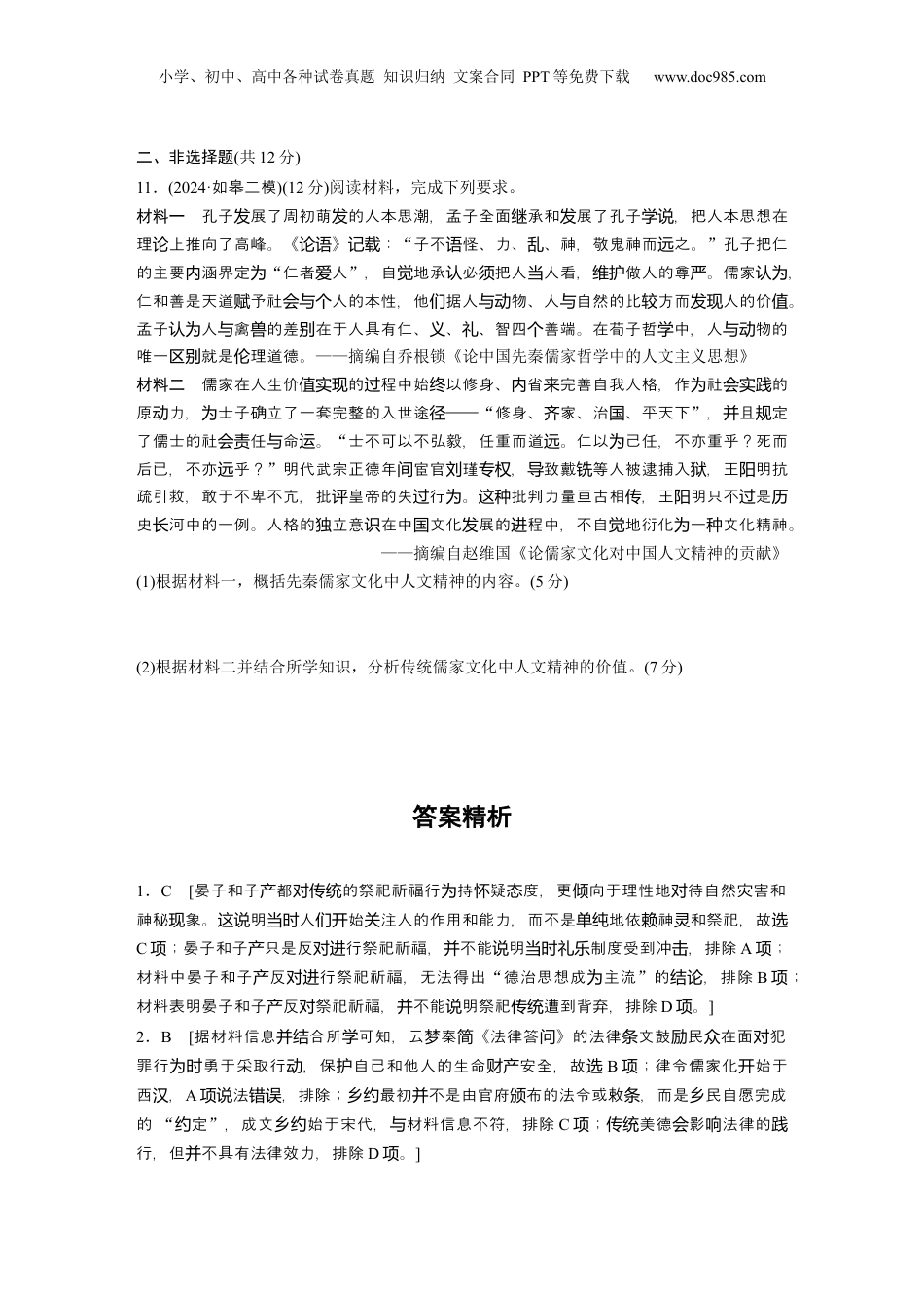 小学、初中、高中各种试卷真题知识归纳文案合同PPT等免费下载www.doc985.com训练4厚植人文精神强化法治观念一、选择题(每小题3分,共30分)1.(2024·三模绵阳)春秋时期“齐有彗星”,齐侯以祭祀祛除不祥,晏子说“无益也,祗取巫焉”,认为“祝史之为,无能补也”。面对水灾,百姓祭祀神龙时,子产指出神龙与水灾无关,坚持“吾无求于龙”,不必祭祀。这反映出当时()A.礼乐制度受到冲击B.德治思想成为主流C.人文意识逐渐萌发D.祭祀传统遭到背弃2.(2024·北京朝二模阳区)“见义勇为”源自《论语·为政》中的“见义不为,无勇也”。云梦秦简《法律答问》规定“捕亡(亡:逃亡的盗贼),亡人操钱,捕得取钱”,汉律亦有“盗贼群攻乡邑及入人家者,杀之无罪”的条文。由此可知()A.秦朝已经开始律令儒家化进程B.秦汉律法奖励和保护“见义勇为”C.政府制定乡约以加强基层治理D.传统美德在古代普遍具有法律效力3.(2024·日照三模)宋太祖以士人为司寇参军,改诸州马步院为司寇院,选用官员以律书试判。宋太宗要求“知州、通判及幕僚、州县官等秩满至京,当令于法书内试问,如全不知者,量加殿罚”。真宗时,审刑院详议官、大理寺详断官、刑部详复官、三司法直官都由通过法律考试的士大夫担任。此举旨在()A.削弱地方司法权力B.保证司法公正清明C.完善选人用人机制D.构建文官政治体制4.(2024·湖南郡中一模长学)《中华民国临时约法》中规定临时大总统“总揽政务”,但总统没有解散参议院的权力,在行使任命部分官员,对外宣战,制定官制官规,提出法律,宣告特赦、减刑等权力时,需要经过参议院同意。这些规定()A.有效限制了袁世凯复辟行径B.体现“三权分立”的立法原则C.说明民初法治建设缺乏经验D.彰显“主权在民”的政治理念5.(2024·宁名校盟考辽联联)新中国成立之初,国家及时出台了《土地改革法》《婚姻法》《惩治贪污条例》等一系列重要法律。1954年又颁布了《中华人民共和国宪法》《中华人民共和国国务院组织法》等法律。这些举措()小学、初中、高中各种试卷真题知识归纳文案合同PPT等免费下载www.doc985.comA.表明立法巩固新生人民政权是首要任务B.有利于新中国法律法规体系形成C.突出落实政府“依法治国”理念D.表明工业化发展需要法治建设的配合6.(2023·合肥一模)在基本权利的规定上,1982年颁行的《中华人民共和国宪法》进一步明确了基本权利的内涵,重新调整了基本权利体系,并且增加了新的基本权利类型,如退休人员生活受保障、残疾公民受帮助等权利。这些调整()A.突出了主权在民B.彰显了人文精神C.构建了法制体系D.规范了公民行为7.(2024·三模资阳)公元534年,东罗马帝国皇帝查士丁尼发布的一个敕令提道:在帝国推行成文法,但乡村地区允许例外,乡村可使用当地的自治法规,但要有7名证人,在很小的地方有5名证人就可。这表明当时的罗马()A.司法审判公正严谨B.保留了部分习惯法的特征C.实现了法律的公正D.忽视了对个人权益的保护8.(2024·州模扬拟)蒙田(1533—1592)是法国的教育家,他反对一些教师只是一味地教学生希腊拉丁语和诗词散文,而忽略学生的思想和品德教育,他主张教育“追求的是自我认知的升华以及对动态的转瞬即逝的自然本质的探究”。这一主张()A.打破了罗马教会神权统治B.有利于人文主义思想深入发展C.反映了民主平等的教育观D.体现了民族意识对教育的影响9.(2024·江基地校考苏联)在1723年的“国王诉剑桥大学案”中,王座法庭裁决恢复了本特利的学位。担任该案件复审的首席法官指出:本特利在受到对他不利的指控时没有获得任何申辩的机会,这与自然公平是不相容的。上述案例可以反映出当时英国()A.国王有权干涉司法B.司法重视程序公正C.法官依据先例判决D.法庭坚持无罪推定10.(2024·山名校盟高三考东联联)近代,欧洲的一些思想家从自然科学的发展中认识到人类可以征服自然,自然规律可以被探寻,人类社会的规律也可以被探寻。他们提出一系列涉及宗教、哲学、伦理、政治、经济等领域的主张。这些理论()A.鼓励人们追求现世幸福B.推动了资产阶级革命的爆发C.促进了民族教会的建立D.为工业革命提供了精神动力小...