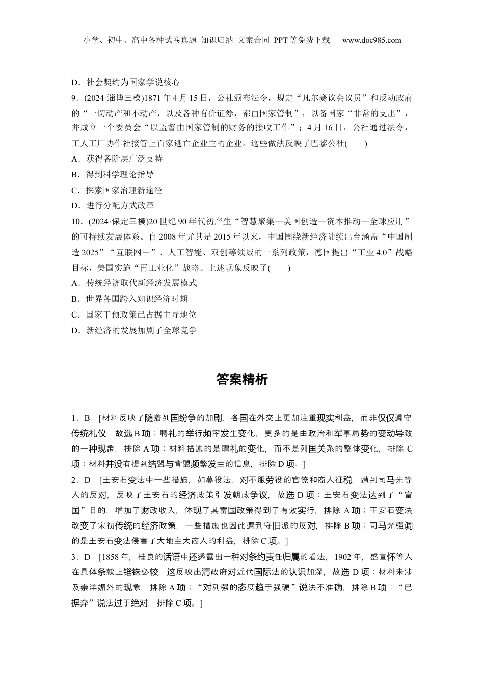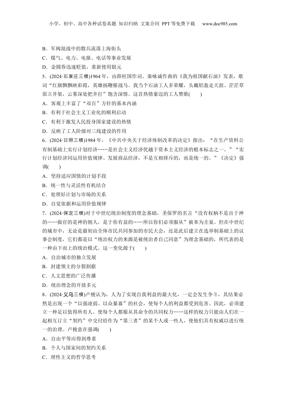 小学、初中、高中各种试卷真题知识归纳文案合同PPT等免费下载www.doc985.com高考题型练训练1选择题之挖掘材料关键信息要素(每小题3分,共30分)1.(2024·日照三模)聘礼是王、诸侯国之间结好关系之礼。西周时期,聘礼主要是天子聘诸侯,诸侯觐见天子,诸侯间的互聘并不显著;春秋时期,天子与诸侯间的聘礼十分稀疏,诸侯间的聘礼日益频繁;至战国,聘礼已不再经常举行,七国间由辩士任使臣的遣使交通却非常频繁。这表明()A.时局变化推动礼仪革新B.外交更加注重现实利益C.实力决定列国关系走向D.诸侯国结盟与背盟频发2.(2024·河北衡水中三模学)针对王安石变法举措,司马光认为人们自身才性、智愚的不同决定了人的贫富,强调“大地主大商人‘蚕食细民’‘侵牟编户’的地租和高利贷利削与致富无关”。这表明王安石变法()A.富国政策没有得到全面贯彻B.承袭了宋初传统的经济政策C.侵害了平民利益而遭到反对D.抑商增税方式引发朝政争议3.(2024·城模盐拟)1858年,中英《天津条约》签订后,议和大臣桂良上奏称:“此时英、佛(法)两国和约,万不可作为真凭实样……将来尚欲背盟弃好,只须将奴才等治以办理不善之罪,即可作为废纸。”1902年中英续议《通商行船条约》时,盛宣怀等人在具体条款上锱铢必较。上述变化反映出清政府()A.力图扭转崇洋媚外现象B.对列强的态度趋于强硬C.已摒弃传统的华夷观念D.对近代国际法认识加深4.(2024·杭州中模学军学拟)茅盾的《子夜》以20世纪30年代初的上海为背景,开篇写道:“吴老太爷从乡下乘轮船来到上海,怀中紧抱着《太上感应篇》,坐进30年代的汽车里,像一具刚从棺材里爬出来的僵尸……南京路上,到处是光怪陆离的灯光和高耸的摩天大楼。”吴老太爷不可能见到的场景是()A.报纸刊登女子也可以参加公务员考试小学、初中、高中各种试卷真题知识归纳文案合同PPT等免费下载www.doc985.comB.军阀混战中的散兵流落上海街头C.煤气、电力、电报、电话等事业发展D.金圆券迅速贬值,重新使用银元5.(2024·石家庄三模)1964年,由薛柱国作词、秦咏诚作曲的《我为祖国献石油》发表,歌词“红旗飘飘映彩霞,英雄扬鞭催战马。我当个石油工人多荣耀,头戴铝盔走天涯。茫茫草原立井架,云雾深处把井打”饱含深情。这首热情豪迈的工人赞歌()A.客观上丰富了“双百”方针的基本内涵B.有利于社会主义工业化的顺利启动C.有利于激发人民投身国家建设的热情D.反映了工人阶级对三线建设的作用6.(2024·日照三模)1984年,《中共中央关于经济体制改革的决定》指出:“在生产资料公有制基础上实行计划经济……是社会主义经济优越于资本主义经济的根本标志之一。”“实行计划经济同运用价值规律、发展商品经济,不是互相排斥的,而是统一的。”《决定》强调()A.坚持适应国情的计划手段B.统一性与灵活性有机结合C.处理好计划与市场的关系D.自觉依据和运用价值规律7.(2024·保定三模)对于中世纪统治制度的理念基础,圣保罗的名言“没有权柄不是出于神的……做官的是神的佣人,是于你有益的……所以你们必须服从”被奉为圭臬。但在中世纪的城市中,无论是最初由全体市民共同参加的市民大会,还是此后建立在选举制基础上的议事会制度,它们都是以“统治权力的来源是被统治者自己同意”为理念基础的,所代表的是一种由下而上的统治模式。这一变化源于()A.自治城市的独立发展B.封建领主的分裂割据C.人文思想的广泛传播D.统治理念的开放多元8.(2024·三模义乌)卢梭认为,人为了实现自我利益的最大化,一定会发生争斗,其结果必然是出现一个“以强凌弱、以众暴寡”的社会,使每个人的利益都受到危害。因此,必须建立一种足以值得所有人、使每个人都服从其命令的共同权力……这样的权力只能由人们在一起相互订立“契约”中交付给作为“第三者”的某个人或一些人,使他们具有权威以进行统一的治理。卢梭意在强调()A.自由平等应得到尊重B.个人与国家间的契约关系C.理性主义的哲学思考小学、初中、高中各种试卷真题知识归纳文案合同PPT等免费下载www.doc985.comD.社会契约为国家学说核心9.(2024·淄博三模)1871年4月15日,公社颁布法令,规定“凡尔赛...