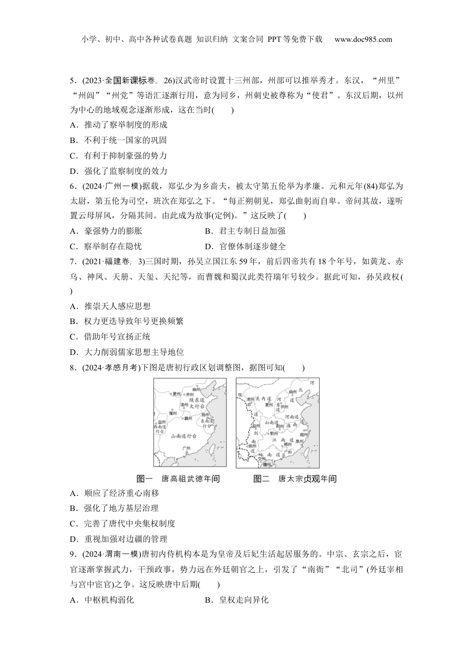 小学、初中、高中各种试卷真题知识归纳文案合同PPT等免费下载www.doc985.com训练1中国古代政治制度的演进一、选择题(每小题3分,共48分)1.(2024·湖北卷,1)湖北襄阳凤凰咀遗址出土的“蛋壳陶杯”(如下图)制作精美,陶胎轻薄,杯壁厚度不超过0.5毫米。一般认为,蛋壳陶杯是显示尊贵身份的礼器。该类器物此前主要发现于龙山文化遗存,在其他地区极为罕见。据此可推断()正俯视图视图A.早期国家认同已广泛形成B.南北地区间贸易往来较为频繁C.史前文明存在远距离交流D.凤凰咀遗存与大汶口文化同期2.(2023·江卷,苏1)春秋时期,晋国在兼并虞国等同姓方国时,也与无终戎等北方诸戎和好,以免于在同楚国争霸过程中腹背受敌。这一现象表明当时()A.北方诸戎已融入华夏族B.政治权力下移至卿大夫C.楚国吴起变法成效显著D.宗法政治体制遭到破坏3.(2023·天津卷,1)有学者把中国古代国家的起源与发展划分为三个阶段,并将第一个阶段形容为“满天星斗”,第二个阶段为“月明星稀”,第三个阶段为“皓月凌空”。与“月明星稀”的形容相类似的是()A.原始群落的分布形态B.部族林立的邦国形态C.早期国家的基本形态D.大一统国家典型形态4.(2024·湛江一模)据秦简记载,秦代君主下“制书”或臣下“受制”问询、议论,都要制作“簿”书,写明制书“初到初受”的部门以及“上”的年月日、官府“别留”的天数、“传留”情况,并与回复的“对”一起呈上。据此可知秦代()A.户籍管理十分严格B.官僚体系效率低下C.基层治理流于形式D.行政运作趋于规范小学、初中、高中各种试卷真题知识归纳文案合同PPT等免费下载www.doc985.com5.(2023·全新卷,国课标26)汉武帝时设置十三州部,州部可以推举秀才。东汉,“州里”“州闾”“州党”等语汇逐渐行用,意为同乡,州刺史被尊称为“使君”。东汉后期,以州为中心的地域观念逐渐形成,这在当时()A.推动了察举制度的形成B.不利于统一国家的巩固C.有利于抑制豪强的势力D.强化了监察制度的效力6.(2024·广州一模)据载,郑弘少为乡啬夫,被太守第五伦举为孝廉。元和元年(84)郑弘为太尉,第五伦为司空,班次在郑弘之下。“每正朔朝见,郑弘曲躬而自卑。帝问其故,遂听置云母屏风,分隔其间。由此成为故事(定例)。”这反映了()A.豪强势力的膨胀B.君主专制日益加强C.察举制存在隐忧D.官僚体制逐步健全7.(2021·福建卷,3)三国时期,孙吴立国江东59年,前后四帝共有18个年号,如黄龙、赤乌、神凤、天册、天玺、天纪等,而曹魏和蜀汉此类符瑞年号较少。据此可知,孙吴政权()A.推崇天人感应思想B.权力更迭导致年号更换频繁C.借助年号宣扬正统D.大力削弱儒家思想主导地位8.(2024·孝感月考)下图是唐初行政区划调整图,据图可知()一唐高祖武德年二唐太宗年图间图贞观间A.顺应了经济重心南移B.强化了地方基层治理C.完善了唐代中央集权制度D.重视加强对边疆的管理9.(2024·渭南一模)唐初内侍机构本是为皇帝及后妃生活起居服务的。中宗、玄宗之后,宦官逐渐掌握武力,干预政事,势力远在外廷朝官之上,引发了“南衙”“北司”(外廷宰相与宫中宦官)之争。这反映唐中后期()A.中枢机构弱化B.皇权走向异化小学、初中、高中各种试卷真题知识归纳文案合同PPT等免费下载www.doc985.comC.政治风气败坏D.中央集权涣散10.(2023·重卷,庆3)唐后期,科举放榜后,新科进士一般会到主考官府邸谢恩,称为“拜主司”。“主司列席缛,东面西向。主事揖状元已下,与主司对拜。”三日后,再次前往谢恩,称“曲谢”。这一现象会导致()A.文官之间易结朋党B.官员施政能力下降C.官场礼仪更加烦琐D.官吏考核制度变革11.(2023·重卷,庆4)武成王庙,又称太公庙,是古代国家祭祀兵家鼻祖吕尚的祠庙。唐玄宗时,曾下令在两京及诸州各置太公庙一所,按文宣王庙的规格进行祭祀。但到宋代,仅在京师及个别地方保留武成王庙,祭祀规格也低于文宣王庙。这一现象反映出宋代()A.漠视兵家思想B.抑制地方势力C.打压民间信仰D.实行抑武方针12.各朝史书对边疆民族的记述,《汉书》有匈奴传、西南夷两粤朝鲜传、西域传,《旧唐书》有突厥传、回纥传、南蛮传、西戎...