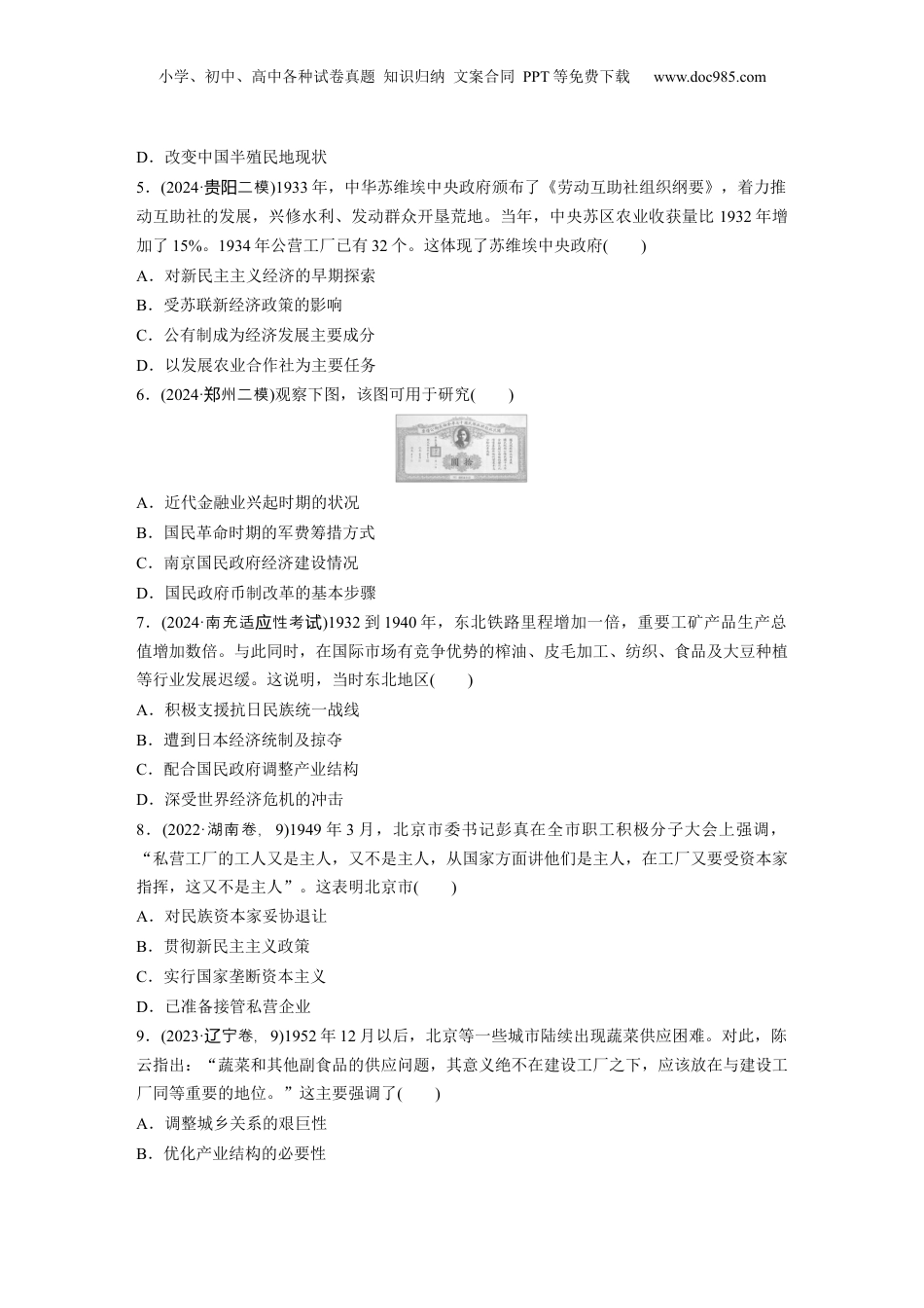 小学、初中、高中各种试卷真题知识归纳文案合同PPT等免费下载www.doc985.com训练7中国近现代经济与社会生活一、选择题(每小题3分,共48分)1.(2023·福建卷,6)19世纪90年代,中国各地的新设民族企业,常到上海、广州、厦门以较高的工资觅雇工人。这一现象可用于说明当时()A.产业工人的待遇丰厚B.资产阶级的救国实践C.通商口岸的产业优势D.晚清政府的政策支持2.(2024·二模菏泽)1904年,山东博山玻璃有限公司成立。公司由山东农工农商总局划拨官银5万两,通过发行股票的方式吸收民间资本参与,由张謇等人负责,生产平板玻璃。这说明当时()A.清末新政推动经济结构转型B.中国工业化原始积累艰辛C.民族资本主义得到较快发展D.股份制成为新型经营方式3.(2024·邢台二模)如图是一张纪念照,留影者在照片背后写道:“壬子秋八月,将欲剪发,故用大镜照后影,以留纪念。八月初三日即新历九月十三日拍于劝业场楼上之丽芙照相馆。”从留影者的做法和心境,可以发现()A.潮流与逆流的反复斗争B.革命与改良的艰难取舍C.变革与传统的复杂联系D.先进与落后的激烈碰撞4.(2024·福州模拟)19世纪末中国科学杂志中较少有化学论文发表,1915年中国科学社的刊物《科学》开始发行,便时常有化学论文发表。1933年,《中国化学会会志》创办,从创刊到解放初期,为便于国际学术交流,论文均用外文发表。这一转变旨在()A.推动思想转型B.提高中国知识分子水平C.发展民族经济小学、初中、高中各种试卷真题知识归纳文案合同PPT等免费下载www.doc985.comD.改变中国半殖民地现状5.(2024·二模贵阳)1933年,中华苏维埃中央政府颁布了《劳动互助社组织纲要》,着力推动互助社的发展,兴修水利、发动群众开垦荒地。当年,中央苏区农业收获量比1932年增加了15%。1934年公营工厂已有32个。这体现了苏维埃中央政府()A.对新民主主义经济的早期探索B.受苏联新经济政策的影响C.公有制成为经济发展主要成分D.以发展农业合作社为主要任务6.(2024·州二模郑)观察下图,该图可用于研究()A.近代金融业兴起时期的状况B.国民革命时期的军费筹措方式C.南京国民政府经济建设情况D.国民政府币制改革的基本步骤7.(2024·南充适性考应试)1932到1940年,东北铁路里程增加一倍,重要工矿产品生产总值增加数倍。与此同时,在国际市场有竞争优势的榨油、皮毛加工、纺织、食品及大豆种植等行业发展迟缓。这说明,当时东北地区()A.积极支援抗日民族统一战线B.遭到日本经济统制及掠夺C.配合国民政府调整产业结构D.深受世界经济危机的冲击8.(2022·湖南卷,9)1949年3月,北京市委书记彭真在全市职工积极分子大会上强调,“私营工厂的工人又是主人,又不是主人,从国家方面讲他们是主人,在工厂又要受资本家指挥,这又不是主人”。这表明北京市()A.对民族资本家妥协退让B.贯彻新民主主义政策C.实行国家垄断资本主义D.已准备接管私营企业9.(2023·宁卷,辽9)1952年12月以后,北京等一些城市陆续出现蔬菜供应困难。对此,陈云指出:“蔬菜和其他副食品的供应问题,其意义绝不在建设工厂之下,应该放在与建设工厂同等重要的地位。”这主要强调了()A.调整城乡关系的艰巨性B.优化产业结构的必要性小学、初中、高中各种试卷真题知识归纳文案合同PPT等免费下载www.doc985.comC.保障人民生活的重要性D.缓解粮食短缺的紧迫性10.(2023·北京卷,8)1954年,政务院发布通知,要求政府机关人员“在每天上午和下午的工作时间中各抽出十分钟做工间操”。随后,国家体委也公布并推行了第一套少年广播体操和儿童广播体操,很快成为中小学生每日必做的早操和课间操。这表明()A.政府意在减少劳动和学习时间B.竞技体育精神深入社会各行业C.民众逐渐接受了休闲娱乐观念D.政府高度重视增强民众的体质11.(2024·田二模莆)到20世纪70年代末,我国建成了西昌卫星发射基地、陕西航空等现代化生产和科研基地,成昆、湘黔等重要铁路,湖北第二汽车制造厂、德阳重型机器厂等工业基地以及攀枝花、十堰等新兴工业城市。这表明我国()A.工业结构发生变化B.国民经济布局得到改善C.经济体制改革启动D.西部大开发战略的实施12...