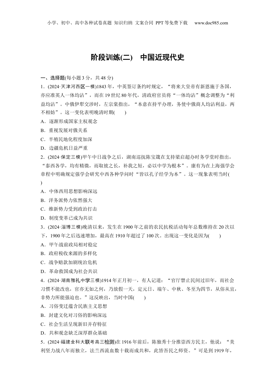 小学、初中、高中各种试卷真题知识归纳文案合同PPT等免费下载www.doc985.com阶段训练(二)中国近现代史一、选择题(每小题3分,共48分)1.(2024·天津河西一模区)1843年,中英签订条约时规定,“将来大皇帝有新恩施于各国,亦应准英人一体均沾”,而在19世纪80年代,清政府官员将“一体均沾”概念调整为“利益均沾”。中俄伊犁交涉时,左宗棠指出,“本意在持平办理,务使中俄商人均沾利益,两不相妨”。这一变化表明晚清时期()A.逐渐形成国家主权观念B.重视发展对俄关系C.半殖民地化程度加深D.边疆危机日益严重2.(2024·保定三模)甲午中日战争之后,湖南巡抚陈宝箴在支持梁启超办时务学堂时指出,“泰西各学,均有精微,而取彼之长,补我之短,必以中学为根本”。康有为在上海强学会章程中明确规定强学会研究中西各种学问时“皆以孔子经学为本”。这一现象表明当时()A.中体西用思想影响深远B.洋务派势力依然强大C.维新势力受到政治打击D.制度变革已成为共识3.(2024·淄博三模)晚清以来,发生在1900年之前的农民抗税活动每年总数维持在20次以下,1900年之后迅速增加,最高在1910年超过了100次。出现这一变化是因为()A.甲午战前政局相对稳定B.政府税收来源的多样化C.战争赔款加剧统治危机D.革命救国成为社会共识4.(2024·湖南雅中三模礼学)1914年正月初一,有人记道:“官厅禁止民间过旧年,而社会习惯不能改也,官亦无如之何,乃放假一天,定元日、端午、中秋、冬至为四节,从俗从宜,非势力所能强迫也。”这反映出,当时中国()A.习俗变迁蕴含民族主义思想B.封建文化对习俗的影响深远C.社会生活呈现新旧并存特征D.共和观念缺乏深厚群众基础5.(2024·福建金科大考高三联检测)在1916年前后,陈独秀十分推崇西方民主,他说:“美利坚力战八年而独立,法兰西流血数十载而成共和,此皆吾民之师资。”可是到1919年,小学、初中、高中各种试卷真题知识归纳文案合同PPT等免费下载www.doc985.com陈独秀却呼喊人们要觉悟起来,抛弃资本主义和帝国主义。导致这一变化的主要原因是()A.北洋政府实行反动统治B.革命统一战线的建立C.西方大国推行强权政治D.列强在华的争夺加剧6.(2024·承德二模)据图可知,中国共产党组织的兴起()中共党起的菱形示意国产组织兴图(1920—1921)A.受地缘综合因素影响B.集中在沿海沿江城市C.呈现“星火燎原”之势D.具有广泛的社会基础7.(2024·保定三模)1925年10月,中共中央在《中国现时的政局与共产党的职任议决案》里提出了“耕地农有”口号,指出应当没收大地主、军阀、官僚、庙宇的田地交给农民。1926年7月,中共中央提出限定地主最高租额,农民所得至少要占收获物的50%,限制利息最高不超过二分五厘。这一变化()A.助长了国民大革命中的右倾错误B.壮大了反抗国民党政府的力量C.顺应了资产阶级民主革命的要求D.适应了社会主义革命形势需要8.(2024·州八校三模苏)1931年,国民政府制定《空军作战防空计划》,明确“拟定空军与陆海军联合作战方针”。1933年,国民政府把空军建设时间由原来的五年缩短为三年,并准备以南京、保定、西安、汉口、广州为根据地把全国划分为五大空军区。国民政府此举的背景是()A.独立的工业体系尚未建立B.中日已进入战略相持阶段C.全国团结抗战的初步形成小学、初中、高中各种试卷真题知识归纳文案合同PPT等免费下载www.doc985.comD.日本侵略者策动华北自治9.(2024·三模青岛)毛泽东指出,“我们过去的政府是工人、农民和城市小资产阶级联盟的政府,从现在起,除了工人、农民和城市小资产阶级以外,还要加上一切其他阶级中愿意参加民族革命的分子……要把‘工农共和国’口号改为‘人民共和国’口号。”这发生在()A.国民革命时期B.抗日战争时期C.解放战争时期D.新中国成立初期10.(2024·邯模郸拟)1949年5月,中共中央《关于成立外文翻译机构的决定》中指出:“中央责成中宣部及外事组,将北平原有之外事学校及华大俄文系,合并成立一个外国语学校,暂归外事处管理,分俄语、英语两部,扩大学员到五百人至七百人。”这一决定()A.是党工作重心转移的标志B.体现新民主主义革命的任务C.缘于中国...