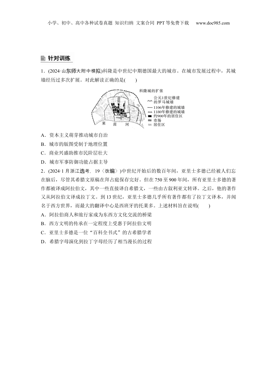 小学、初中、高中各种试卷真题知识归纳文案合同PPT等免费下载www.doc985.com通史贯通(三)世界史微专题一世界古代文明——多元与平衡的时代西欧中世纪中后期(11—14世纪)社会经济的重大变化经济(1)生产力提高,农业对外扩殖:欧洲农业生产水平得到提高,新的农具如重型轮犁出现,极大地提高了耕作效率。同时大型风车的出现提高了农业生产效率,西欧农业向外扩殖,在地域上超越古典时期农业;(2)古典城市复兴,一批新的城市开始兴起:如威尼斯和佛罗伦萨等古典时期的城市得到复兴。伴随着贸易的发展,一批新兴的城市开始出现社会(1)行会的出现与市民阶级的兴起:贸易的发展与经济的恢复,促进了城市市民阶级的兴起以及行会制度的出现。大量西欧城市反对封建教俗贵族的直接统治,并在一定程度上获得了自治;(2)封建王权在各国的加强:西欧各个国家致力于加强王权,消除封建割据。神圣罗马帝国皇帝则致力于与教皇进行斗争,以加强皇权;(3)大学发展与知识阶层的兴起:城市中大学开始普遍建立,政府和教会为大学设置特权或限制,大学的发展标志着知识阶层成为一支重要的社会力量,这也极大地促进了西欧文化的繁荣小学、初中、高中各种试卷真题知识归纳文案合同PPT等免费下载www.doc985.com1.(2024·山大附中模东师拟)科隆是中世纪中期德国最大的城市。在城市发展过程中,其城墙经历过多次扩展。对此解读正确的是()A.资本主义萌芽推动城市自治B.城市的版图受制于地理位置C.商业兴盛助推市民阶层壮大D.城市军事防御功能占据主导2.(2024·1月浙江考,选19〈改〉编)中世纪开始后的数百年间,亚里士多德已经被人们忘在脑后,尽管其希腊文原稿在拜占庭保存完好。但在750至900年间,所有亚里士多德的著作都被译成阿拉伯文,其中一些直接译自希腊文,一些由古叙利亚文转译。之后,他的著作又从阿拉伯文译成拉丁文。到13世纪,亚里士多德几乎所有著作都有了拉丁文译本,并闻名于西方世界,而最大的翻译中心是西班牙的托莱多。上述材料旨在说明()A.阿拉伯商人和旅行家成为东西方文化交流的桥梁B.西方文明的传承在一定程度上受惠于阿拉伯文明C.亚里士多德是一位“百科全书式”的古希腊学者D.希腊字母演化到拉丁字母经历了相当漫长的过程小学、初中、高中各种试卷真题知识归纳文案合同PPT等免费下载www.doc985.com微专题二工场手工业时期——发现与扩张的时代近代东西方大航海之异同项目西方大航海东方大航海不同点目的获取经济利益,掠夺财富政治利益,巩固其统治的合法性规模官方与民间的一致支持,规模越来越大官方与民间的对立,初期郑和下西洋规模较大,但整体而言其规模相对较小影响完成了资本的原始积累,促进了资本主义制度的形成与发展满足统治阶级的需要,没有改变中国封建社会的基本性质性质西欧资本原始积累时期殖民扩张和经济掠夺的前奏是中国专制皇权加强的体现,极大消耗人力、财力相同点(1)促进了人类对地球的认识,开拓了人类的眼界,促使世界历史真正形成;(2)促进了东西方之间政治、经济与思想文化交流,东西方社会在交流中共同进步1.(2024·福州一中月考)苜蓿是古老的世界性牧草。约公元前490年,波斯人在入侵希腊时,为饲养战马、骆驼及家畜,开始在希腊种植苜蓿,并传播至罗马。16世纪中叶,苜蓿被西班牙人和葡萄牙人带入美洲。到1800年,在全球广泛种植。这一传播历程客观上反映了()A.苜蓿的优良品质B.物种交流的全球化小学、初中、高中各种试卷真题知识归纳文案合同PPT等免费下载www.doc985.comC.战争的积极作用D.文明交流的复杂性2.(2024·广州段阶训练)郑和下西洋时,占统治地位的宇宙理论是中国传统的浑天说,浑天说所谓的球形大地,大半个在水中,小半个在水上。大航海时代的西欧航海家则确信地圆说。这使得哥伦布等人的航海()A.经济动因持续且强劲B.更加具有开创性色彩C.目标不明又非常危险D.规模空前和影响深远微专题三两次工业革命时期——发明与改变的时代中外近代化历程的不同之处1.近代化发展过程不同(1)西方近代化的基本过程(思想—制度—器物)①15—16世纪,欧洲的文艺复兴和宗教改革运动,使人们逐渐摆脱了教会的束缚和控制,推动了欧洲...