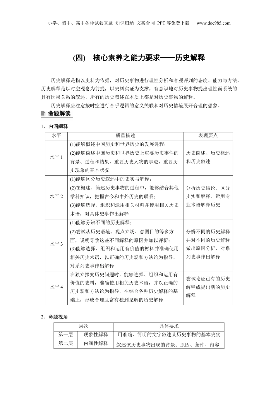 小学、初中、高中各种试卷真题知识归纳文案合同PPT等免费下载www.doc985.com(四)核心素养之能力要求——历史解释历史解释是指以史料为依据,对历史事物进行理性分析和客观评判的态度、能力与方法。历史解释是以时空观念为前提,以史料实证为支撑,有意识地对历史事物提出理性而系统的具有因果关系的叙述。所有的历史叙述在本质上都是对历史事物的解释。历史解释应注意按时空进行合乎逻辑的意义关联和对历史情境展开合理的想象。1.内涵阐释水平质量描述表现要点水平1(1)能够概述中国历史和世界历史的发展进程;(2)能够简述中国历史和世界历史上重要历史事件的背景、过程和结果,重要历史人物的事迹,重要历史现象的基本状况历史简述、历史概述和历史叙述水平2(1)能够区分历史叙述中的史实与解释;(2)在概述、简述历史事物的过程中,能够结合其他学科知识,把握古今和中外历史的联系;(3)能够选择、组织和运用相关材料并使用相关历史术语,对具体史事作出解释分析历史结论、区分史实和解释、运用专业术语解释历史水平3(1)能够分辨不同的历史解释;(2)尝试从历史语境、观点立场、意图目的等多方面,说明导致这些不同解释的原因并加以评析;(3)能够选择、组织和运用有价值的材料并准确使用相关历史术语,以正确的历史观和方法论为指导,对系列史事作出解释分辨不同的历史解释并对不同的历史解释做出原因分析、对系列史事作出解释水平4在独立探究历史问题时,能够选择、组织和运用有价值的史料,准确使用相关历史术语,并以正确的历史观和方法论为指导,在综合各种历史解释的基础上,形成合理且富有独到见解的历史解释尝试论证已有的历史解释或提出新的历史解释2.命题视角层次具体要求第一层现象性解释用准确、简明的文字叙述某历史事物的基本史实第二层内涵性解释叙述该历史事物出现的背景、原因、条件、内容小学、初中、高中各种试卷真题知识归纳文案合同PPT等免费下载www.doc985.com和结果(影响)第三层本质性解释指出该历史事物的表象与其内在属性之间的关系第四层联系性解释找出与该历史事物相关的其他历史事物,并叙述它们之间的关系第五层规律性解释运用唯物史观分析该历史事物的发展演变规律1.考查“现象性解释”(2023·新卷,课标31)公元前18世纪,西亚地区的一部法典规定:“此后千秋万世,国中之王必遵从我在我的石柱上所铭刻的正义言词,不得变更我所决定的司法判决,我所确立的司法裁定,不得破坏我的创制。”这一规定()A.强调波斯君主专制的权力来源B.宣示了古巴比伦国王的至上权威C.标榜亚述帝国君主的军事成就D.规范了埃及对尼罗河流域的统治2.考查“内涵性解释”(2023·全甲卷,国33)西方某一文学思潮挑战和反叛了强调“主观”“创造”“情感”“想象”的文学成规,主张科学理性精神,刻意追求“客观”“写实”。据此可知,该文学思潮属于()A.古典主义B.浪漫主义C.现实主义D.现代主义3.考查“本质性解释”(2023·海南卷,11)原产于美洲的可可豆被西班牙殖民者误称为巧克力豆,因物以稀为贵,在中美洲部分地区一度被当作货币使用。16世纪后传播到欧洲。随着可可树被广泛引种,以及可可豆加工技术和食用方法的不断改进,19世纪后半叶,巧克力成为大众化商品。引起这一变化的根本原因是()A.新航路开辟促进物种交流B.欧洲的商业格局发生变化C.资本主义世界经济的驱动D.世界殖民体系的初步形成4.考查“联系性解释”(2023·广卷,东2)汉初儒家代表人物陆贾的《新语》云:“昔舜治天下也,弹五弦之琴,歌南风之诗,寂若无治国之意,漠若无忧天下之心,然而天下大治……故无为者乃有为也。”陆贾的上述思想()小学、初中、高中各种试卷真题知识归纳文案合同PPT等免费下载www.doc985.comA.适应了休养生息的政治需要B.契合了德法并用的治国理念C.为尊崇儒术提供依据D.有利于加强中央集权5.考查“规律性解释”(2023·海南卷,18)(13分)阅读材料,完成下列要求。材料海上格局指家力量在海上的比。国对态势16—17世,葡萄牙、西班牙、荷先后纪兰成海上霸主。为17世中后期,在英海失利后,荷霸主地位被取代。纪与国战兰18世至纪19世初,英多次法,持了海上霸。...