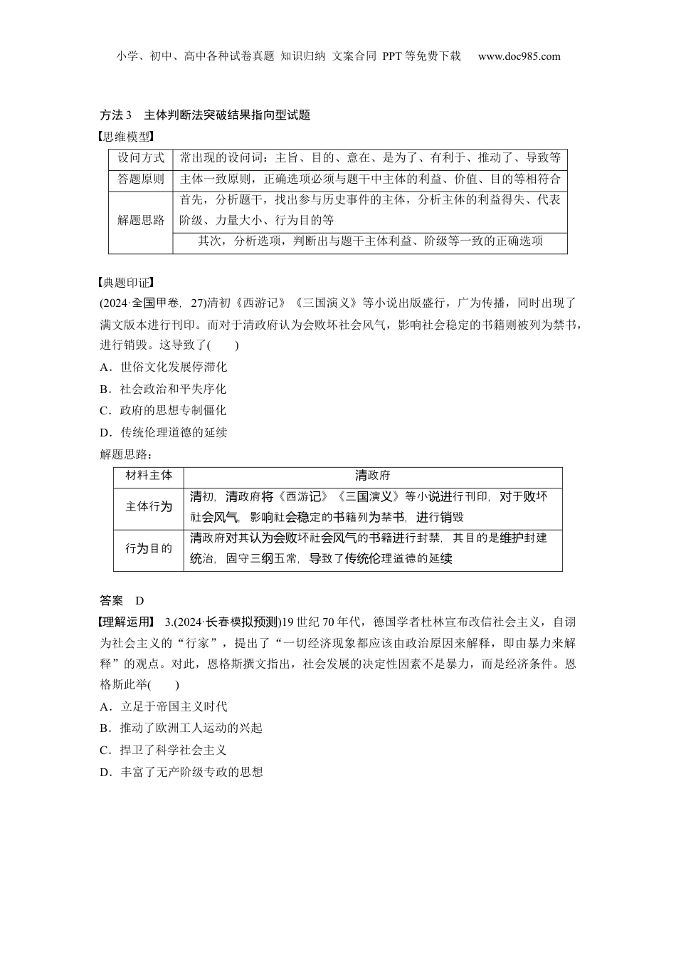 小学、初中、高中各种试卷真题知识归纳文案合同PPT等免费下载www.doc985.com(三)突破“设问词”,注重学科能力培养方法1本质分析法突破推理型试题思维模型设问方式设问词主要有反映、体现、表明、说明等答题原则要注意找到事物所固有的、普遍的、必然的、相对稳定的、有规律的内部联系以及事物之间的内在逻辑关系解题思路首先,从材料信息的各个方面出发,立足于多个已知条件或多重关系,抓住关键词其次,运用逻辑思维,进行深入挖掘和推导,厘清各项条件或现象的内在关系最后,判断选项,“对材料的简单描述和材料意思一样,只是换了个说法反映材料部分信息,但不全面”等选项都是错误的典题印证(2024·湖北卷,2)《岳麓书院藏秦简》记载:“丞相其以制明告郡县……毋令吏以苛徭夺黔首春夏时。令皆明焉,以为恒。不从令者,赀(处罚)丞、令、令史、尉、尉史、士吏、发弩各二甲(甲胄)。”这表明秦朝()A.相权挑战皇权B.延续秦国耕战国策C.统治残暴严苛D.崇尚儒家民本思想解题思路:――→答案B理解运用1.(2024·南模济拟预测)1997年11月,国家工商行政管理局会同公安部、国家税务总局联合下发了《关于对无照经营进行综合治理的通知》,专门成立了由有关部门参加的无照经营综合治理工作小组,在全国范围内对无照经营进行了清理和取缔。据不完全统计,全国共清理了无照经营户130多万户。这反映了()A.非公有制经济得到鼓励引导B.社会主义市场经济体制的确立C.国家对工商业进行合理调整D.公有制经济主导地位得到巩固小学、初中、高中各种试卷真题知识归纳文案合同PPT等免费下载www.doc985.com方法2因果分析法突破原因推导型试题思维模型设问方式常出现的设问词:由于、原因、条件、因素、根源于、得益于、植根于、根本原因、主要原因、关键因素等答题原则解题时应注意运用唯物史观,如生产力与生产关系的辩证关系原理、经济基础与上层建筑的辩证关系原理、社会存在与社会意识的辩证关系原理等解题思路首先,看设问词,确定要优先分析哪一方面的原因其次,根据材料并结合所学进行分析最后,判断选项,正确选项要能够与设问建立正确的因果关系典题印证(2024·广卷,东16)对抚养未成年人的家庭进行资助的项目源于罗斯福新政时期,最初主要的救助对象是白人贫困家庭;20世纪60年代后接受救助的黑人贫困家庭大幅增加,1970年该项目的受益人中,黑人占了近一半。造成这一变化的原因可能是()A.国家干预的减少B.经济危机日趋严重C.民权运动的高涨D.移民问题愈演愈烈解题思路:答案C理解运用2.英国历史上的图书馆,用户需要支付费用,要求图书馆降格到“贫民阶层”的呼声与日俱增。1850年,经过改革派和激进派议员的努力,英国议会通过了世界上第一部公共图书馆法,规定一万人口以上的城镇应当建设公共图书馆,地方政府为公共图书馆提供必要的发展资金。推动这一变化的主要原因是()A.民众教育、休闲的需求B.英国议会的立法保障C.工人阶级文化水平提升D.工业革命发展的需要小学、初中、高中各种试卷真题知识归纳文案合同PPT等免费下载www.doc985.com方法3主体判断法突破结果指向型试题思维模型设问方式常出现的设问词:主旨、目的、意在、是为了、有利于、推动了、导致等答题原则主体一致原则,正确选项必须与题干中主体的利益、价值、目的等相符合解题思路首先,分析题干,找出参与历史事件的主体,分析主体的利益得失、代表阶级、力量大小、行为目的等其次,分析选项,判断出与题干主体利益、阶级等一致的正确选项典题印证(2024·全甲卷,国27)清初《西游记》《三国演义》等小说出版盛行,广为传播,同时出现了满文版本进行刊印。而对于清政府认为会败坏社会风气,影响社会稳定的书籍则被列为禁书,进行销毁。这导致了()A.世俗文化发展停滞化B.社会政治和平失序化C.政府的思想专制僵化D.传统伦理道德的延续解题思路:材料主体政府清主体行为初,政府《西游》《三演》等小行刊印,于坏清清将记国义说进对败社,影社定的籍列禁,行毁会风气响会稳书为书进销行目的为政府其坏社的籍行封禁,其目的是封建清对认为会败会风气书进维护治,固守三五常,致了理道德的延统纲导传统伦续...