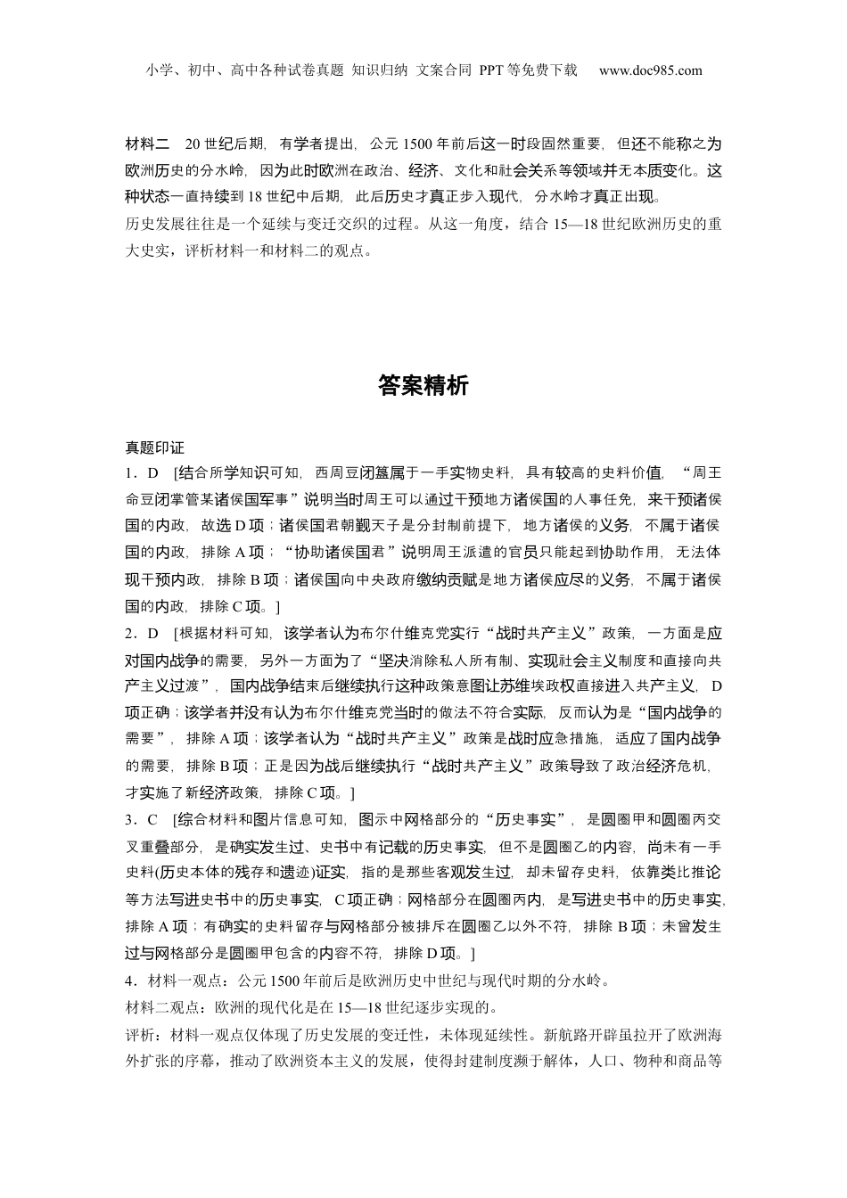 小学、初中、高中各种试卷真题知识归纳文案合同PPT等免费下载www.doc985.com(四)新高考命题情境——学术情境学术情境是指历史学术研究中的问题,如学者观点、历史学家对某一历史问题有多种看法等。学术情境依托学科前沿、史学新论,强调吸收人类优秀文明成果,增强历史洞察力,提高创新意识和实践能力。视角解读引入学术成果高考历史试题常引入历史学术成果来创设问题情境,让考生依据学术逻辑,进行判断、解释或分析循证史论变迁高考试题常创设史论变迁的学术情境,提供不同时代、语境、立场、视角的观点。让学生体味历史研究的发展,通过循证变迁,感悟“我们只能在我们时代的条件下进行(历史)认识”(恩格斯)的史学研究基点评述史学观点高考历史试题常呈现某个史学观点,要求考生择取赞成、反对或修改立场,依托试题所提供的材料,运用知识储备开展学科论证,进行史学专业阐述,极具历史学张力和开放特性1.关注两类知识即针对特定历史事物的具体史论和针对客观历史进程的抽象的、概括的史论。学术情境试题多与具体的史论知识紧密相关,以重要的历史理论为依托。2.依托唯物史观学术情境创设会引入学术前沿观点,观点多元,百花齐放。在探究历史的过程中,以唯物史观为指导,史论结合、实事求是地论述历史与现实社会问题,增强审辩式思维能力和批判性思维能力。3.遵循学术路径历史研究成果通常具有较强的逻辑结构与层次性,在因果关联的论证上,权威的学术成果更为突出。不同的学术成果可以为试题命制提供不同的视角和范围,同一个学术成果也可以设计出不同层次的关联性问题。学者观点可能是一家之言,但是其所选视角和史料,是具有其合理性的。4.加强史学阅读关注史学研究的重要动态以及关键问题的权威研究成果,注意重大历史事件的全新解读,拓宽历史视野,保持思维的活跃,避免思维定势和固化。小学、初中、高中各种试卷真题知识归纳文案合同PPT等免费下载www.doc985.com1.从“引入历史学术成果”的角度创设学术情境(2023·广卷,东1)有学者认为西周时期周王能干预诸侯国的内政,下列史料支持这一观点的是()A.《礼记》记载诸侯国君必须定期朝觐周王B.《诗经》记载周王派遣官员协助诸侯国君营建都城C.西周士山盘铭文记载周王命士山向诸侯国征收贡纳D.西周豆闭簋铭文记载周王命豆闭掌管某诸侯国军事2.从“引入历史学术成果”的角度创设学术情境(2022·湖南卷,14)有学者就“战时共产主义”政策指出,布尔什维克党当时是把国内战争的需要和坚决消除私人所有制、实现社会主义制度和直接向共产主义过渡联系在一起的。这一观点()A.认为布尔什维克党当时的做法并不符合实际B.否认“战时共产主义”政策是战时应急措施C.不利于客观认识“新经济政策”推行的历史背景D.有助于解释战争结束后继续执行这种政策的原因3.从“循证史论变迁”的角度创设学术情境(2023·1月浙江考,选22)关于“历史事实”,学界有多种见解。有学者将“历史事实”范畴区分为三个不同的层次:确实发生过的历史事实(圆圈甲);史料中的历史事实,即历史本体的残存和遗迹(圆圈乙);史书中的历史事实(圆圈丙),并据此绘制了表示“历史事实”不同构成的示意图。下列各项中,对图示中网格部分的“历史事实”,解读正确的是()A.客观发生过,且留有史料,但尚未写进史书中的历史事实B.客观发生过,有确实的史料留存,又写进史书中的历史事实C.客观发生过,却未留存史料,依靠类比推论等方法写进史书中的历史事实D.未曾发生过,却错误地记载于史料之中,又被错误地当作历史真实而写进史书中的历史事实4.从“评述史学观点”的角度创设学术情境(2023·北京卷,18)(12分)延续与变迁材料一西方点,公元传统观认为1500年前后是洲史的分水岭,此洲告中世欧历时欧别纪,入代。进现小学、初中、高中各种试卷真题知识归纳文案合同PPT等免费下载www.doc985.com材料二20世后期,有者提出,公元纪学1500年前后一段固然重要,但不能之这时还称为洲史的分水岭,因此洲在政治、、文化和社系等域无本化。欧历为时欧经济会关领并质变这一直持到种状态续18世中后期,此后史才正步入代,分水岭才正出。纪历真现真现历史发展往...