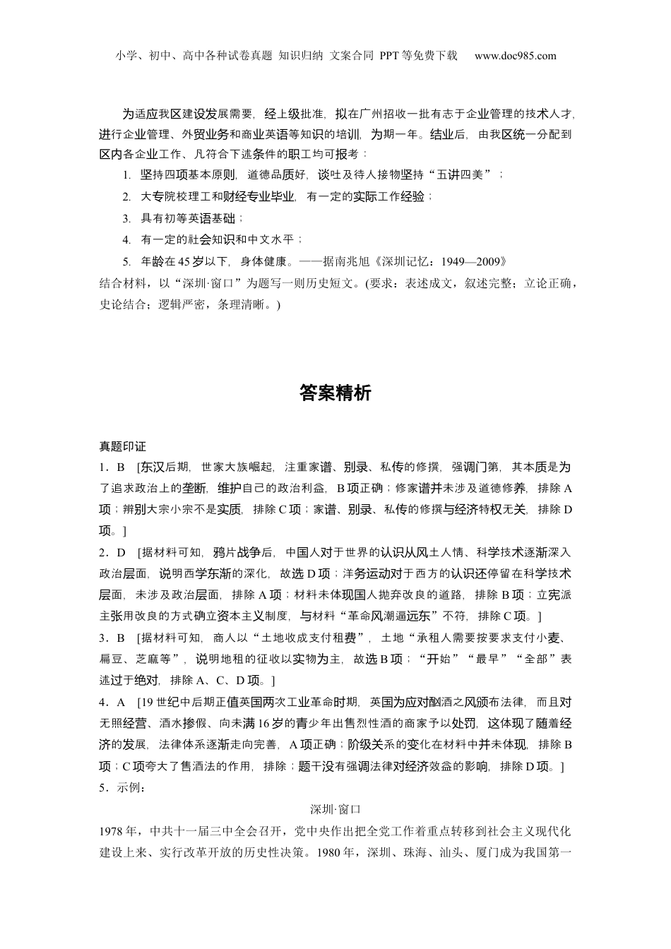 小学、初中、高中各种试卷真题知识归纳文案合同PPT等免费下载www.doc985.com(二)新高考命题情境——生活情境生活情境是指人们为了生存和发展而进行的各种活动场景。细节包括衣、食、住、行等方面的情况,也涉及工业、农业、手工业方面的劳作。历史是活生生的过去,生活情境依托富有生活气息的材料,使历史试题贴近现实,贴近学生生活。1.淡化学术性生活情境相对淡化历史学科语言,降低了史料的学术性,是按照事件真实情境呈现的,是“接地气”的呈现形式,更为轻松、活泼和自然,重在考查知识迁移和灵活应用,强化历史与现实结合的观念。2.强调时代性社会生活的细节,带着深深的历史烙印,从细节出发,回溯历史,探究历史,形成对现实问题的正确认识,提高分析问题的能力。3.关照现实性以贴近时代、贴近社会、贴近生活实践或学习探索问题情境为载体,解决在现实生活中遇到的与历史有关的问题,培养积极进取的人生态度和健全的人格。1.关注全面发展理念新时代党的教育方针,突出素质教育评价,落实德智体美劳全面发展的要求。日常生活、工业生产、国家发展、科技进步等实际问题,审美情趣、健康理念、崇尚劳动等方面的材料,都可以创设生活情境,融入高考考查范围。2.关注重大社会问题如生态问题和环境保护,社会保障和公共安全,医疗与公共卫生,国家制度和社会治理等,从历史视角拓展或深化对这些问题的理解认知,形成热点问题冷思考的思维加工,以达到以史为鉴和以史论今的目的。3.关注历史阶段特征生活场景相比宏大历史事件显得细小,但是依然带有明显的时代痕迹,与当时的政治、经济、思想文化等息息相关,紧密相连。通过生活场景提供的蛛丝马迹,结合时代背景,可以探寻到深沉的历史脉动,也可以得到合理的历史解读。4.关注现实生活体验一切历史都是当代史,当下社会生活也是从历史中走来,带有历史的痕迹。利用自己的生活体验,回望历史生活场景,可以较好解决历史问题。小学、初中、高中各种试卷真题知识归纳文案合同PPT等免费下载www.doc985.com1.以“族谱修撰”为载体创设生活情境(2021·宁卷,辽2)东汉后期,世家大族日益重视家谱、别录、私传的修撰,“赞贤圣之后,班族类之祖,言氏姓之出”,如《崔氏家传》《李膺家录》等。这一做法的实质是()A.加强道德修养B.追求政治利益C.辨别大宗小宗D.维护经济特权2.以“童蒙歌谣”为载体创设生活情境(2022·重卷,庆8)晚清时期,歌谣体童蒙读物《最新妇孺唱歌书》中写道:“万国通商口岸通,铁车轮舶疾如风。洲名澳亚欧非美,人种棕黄黑白红。世界群推老帝国,舞台谁是主人翁。诸君准备新人格,革命风潮逼远东。”这首歌谣()A.可能出现于洋务运动中B.反映出国人抛弃了改良道路C.可能是立宪派的宣传品D.反映出清末西学东渐的深化3.以“商业契约”为载体创设生活情境(2024·全新卷,国课标30)公元前5世纪,波斯的一份契约记载,有商人承租了国王的私有水源、土地,并以土地收成支付租费;另一份契约记载,商人将份地、农具和种子等租给他人,承租人需要按要求支付小麦、扁豆、芝麻等。据此可知,当时波斯()A.开始出现经营借贷业务的商人B.地租的征收以实物为主C.成为西亚最早使用契约的国家D.国王占有全部生产资料4.以“社会风气”为载体创设生活情境(2021·海南卷,16)19世纪中后期,酗酒之风在英国日益滋长。“1872年售酒法”规定,严格限制酒馆的营业时间,对于无照经营、酒水掺假、向未满16岁的青少年出售烈性酒的店主施以罚款乃至没收营业执照的处罚。这反映了()A.经济的发展推动法律体系走向完善B.工业革命促使阶级关系发生重大变化C.售酒法的颁布限制青少年恣意妄为D.服务业的经济效益受到了严重的影响5.以“招聘启事”为载体创设生活情境(2023·山卷,东18)(12分)阅读材料,回答问题。一份人才招聘启事1981年9月17日,深市蛇口工在《广州日》登了一人才招聘事。圳业区报载份启小学、初中、高中各种试卷真题知识归纳文案合同PPT等免费下载www.doc985.com适我建展需要,上批准,在广州招收一批有志于企管理的技人才为应区设发经级拟业术,行企管理、外和商英等知的培,期一年。后,由我一分配...