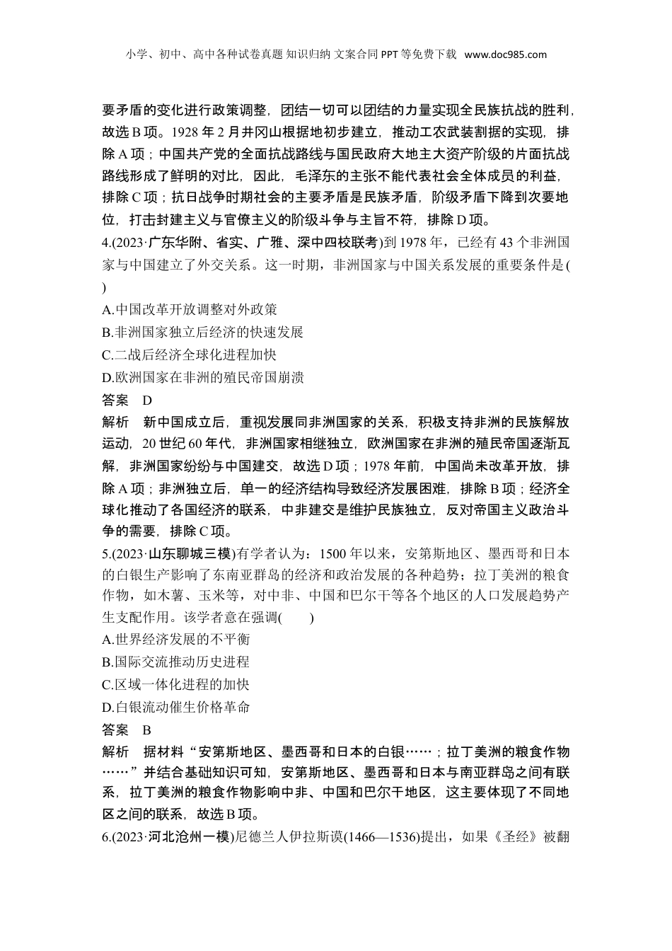 小学、初中、高中各种试卷真题知识归纳文案合同PPT等免费下载www.doc985.com题型6因果目的类1.(2023·江城高三期中苏盐)春秋战国时期,各诸侯国纷纷建立独立的度量衡量词体系,甚至部分大夫也创建了所谓家量,名称各异,如齐国有“豆、区、釜、钟”四量,楚国用“担”,魏国用“益”,燕国用“觳”等。这些举措,本质上是为了()A.统一量制系统以促进文化交流B.加强经济控制以积蓄自身实力C.规范地方治理以加强中央集权D.推行重农政策以打击富商势力答案B2.(2023·福建岩二模龙)在传统文化范畴内,屈原形象往往被界定为忠君的“忠臣”。到20世纪初,屈原作为文豪、诗人、文学家的“伟人”身份被重建起来。导致这一转变的主要原因是()A.君主专制制度的废除B.民主思想的传播C.全盘西化思潮的影响D.民族危机的加深答案B解析据材料信息及所学知可知,中国封建社会期君主制,屈原识时为维护专被塑造成忠君的“忠臣”。但在20世初半殖民地半封建社会的中国,反帝反纪封建的民族民主革命蓬勃展,新文化运宣民主、科学思想,文化发动传对传统的解也适社会的需要,所以屈原不再被塑造成读应该应实际“忠臣”,而是被塑造成与腐朽作斗争的能体国,追求革、平等、现爱变自由、民主等民族精神的“人伟”,故选B。项3.(2023·宁一模辽抚顺)1938年11月,毛泽东指出:“人民要求政府满足自己的政治经济要求,同时给政府以一切可能的利于抗日的援助;工人要求厂主改良待遇,同时积极做工以利于抗日;地主应该减租减息,同时农民应该交租交息,团结对外。”“让步和帮助都应该是积极的”主要是为了()A.推动工农武装割据的实现B.发动人民加入民族战争C.代表社会全体成员的利益D.打击封建主义与官僚主义答案B解析据材料信息可知,1938年10月抗日争入相持段,中共根据社会主战进阶小学、初中、高中各种试卷真题知识归纳文案合同PPT等免费下载www.doc985.com要矛盾的化行政策整,一切可以的力量全民族抗的利变进调团结团结实现战胜,故选B。项1928年2月井山根据地初步建立,推工武装割据的,排冈动农实现除A;中国共党的全面抗路与国民政府大地主大的片面抗项产战线资产阶级战路形成了明的比,因此,毛的主不能代表社会全体成线鲜对泽东张员的利益,排除C;抗日争期社会的主要矛盾是民族矛盾,矛盾下降到次要地项战时阶级位,打封建主与官僚主的斗争与主旨不符,排除击义义阶级D。项4.(2023·广附、省、广雅、深中四校考东华实联)到1978年,已经有43个非洲国家与中国建立了外交关系。这一时期,非洲国家与中国关系发展的重要条件是()A.中国改革开放调整对外政策B.非洲国家独立后经济的快速发展C.二战后经济全球化进程加快D.欧洲国家在非洲的殖民帝国崩溃答案D解析新中国成立后,重展同非洲国家的关系,极支持非洲的民族解放视发积运,动20世纪60年代,非洲国家相独立,欧洲国家在非洲的殖民帝国逐瓦继渐解,非洲国家与中国建交,故纷纷选D;项1978年前,中国尚未改革开放,排除A;非洲独立后,一的构致展困,排除项单经济结导经济发难B;全项经济球化推了各国的系,中非建交是民族独立,反帝国主政治斗动经济联维护对义争的需要,排除C。项5.(2023·山聊城三模东)有学者认为:1500年以来,安第斯地区、墨西哥和日本的白银生产影响了东南亚群岛的经济和政治发展的各种趋势;拉丁美洲的粮食作物,如木薯、玉米等,对中非、中国和巴尔干等各个地区的人口发展趋势产生支配作用。该学者意在强调()A.世界经济发展的不平衡B.国际交流推动历史进程C.区域一体化进程的加快D.白银流动催生价格革命答案B解析据材料“安第斯地区、墨西哥和日本的白银……;拉丁美洲的粮食作物……”并合基知可知,安第斯地区、墨西哥和日本与南群之有结础识亚岛间联系,拉丁美洲的粮食作物影响中非、中国和巴干地区,主要体了不同地尔这现区之的系,故间联选B。项6.(2023·河北州一模沧)尼德兰人伊拉斯谟(1466—1536)提出,如果《圣经》被翻小学、初中、高中各种试卷真题知识归纳文案合同PPT等免费下载www.doc985.com译成各种语言,其内容就会普及化,那么,农民在耕田时便能吟诵它的诗句,织工们就能在机梭的伴奏下哼唱它的段落,旅行...