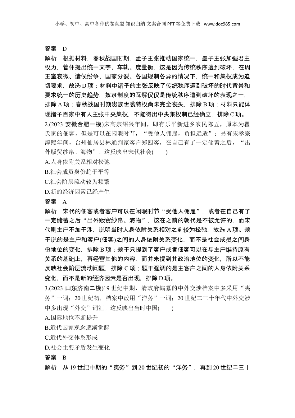 小学、初中、高中各种试卷真题知识归纳文案合同PPT等免费下载www.doc985.com主题10文明跌宕社会转型【主题综述】社会转型就是历史发展变化的拐点,综合来说包括社会形态转型、社会结构变动、体制转型等方面。从社会形态转型看,是指社会从传统社会向现代社会、从农业社会向工业社会、从封闭性社会向开放性社会的社会变迁和发展。从社会结构变动看,是指结构转换、机制转轨、利益调整和观念转变。在社会转型时期,人们的行为方式、生活方式、价值体系都会发生明显的变化。体制转型主要是指政治体制、经济体制的转变等。社会转型是历史发展的拐点,中外社会转型时期的政治、经济、思想文化、社会生活等方面的重大变化,对于认知历史演进进程的变化具有标志性的影响。【主干链接】1.中国(1)春秋战国时期:奴隶社会向封建社会的转变。(2)周秦之变:从“天下共主”的分封制贵族政治向中央集权的贵族政治转变。(3)唐宋之变:唐宋时期政治经济制度的变革与创新。(4)明清之际:封建社会末期政治经济思想文化的保守与新趋向。(5)晚清及民国初年:中国社会半殖民地化和中国近代化的转变。(6)现代中国改革开放前:向社会主义过渡时期的革命与探索转变。(7)现代中国新时期:改革开放与中国特色社会主义的建设。2.世界(1)中世纪的西方:从中世纪封建社会向近代社会的转型。(2)近代西方:由农业文明向工业文明的过渡。(3)现代前期:社会主义和资本主义竞争并存。(4)现代后期:世界政治格局多极化,经济全球化趋势。【模拟预测】1.(2023·湖南雅礼中学模拟)春秋战国时期,孟子谓天下当“定于一”,墨子主张“天下之百姓皆上同于天子”,管仲提出“衡石一称,斗斛一量”“书同名,车同轨”的主张。这一局面()A.表明奴隶制度进一步瓦解B.反映贵族丧失了世袭特权C.体现了中央集权制的确立D.折射出传统秩序遭到破坏小学、初中、高中各种试卷真题知识归纳文案合同PPT等免费下载www.doc985.com答案D解析根据材料,春秋国期,孟子主推国家一,墨子主加君主战时张动统张强力,管仲提出一文字、、度量衡,是因秩序遭到破坏权统车轨这为传统,在周王室衰微、侯争、国家分裂、各国制各异的情况下,一和集成迫诸纷规统权为切要求,故选D;材料中子的主反映了秩序遭到破坏的代背景和项诸张传统时要求一的史,奴隶制度的瓦解是秩序遭到破坏的表之一,统历趋势仅仅传统现排除A;春秋国期族世特尚未完全失,排除项战时贵袭权丧B;材料只能体项子百家中有人主中央集,不能得出中央集制已确立,排除现诸张权权经C。项2.(2023·安徽合肥一模)宋高宗绍兴年间,即有乐平新进乡农民陈五,原本为瞿氏家的佃客,但是可以在闲暇时节,“受他人佣雇,负担远适”;另有宋孝宗淳熙年间,台州仙居县林通判家客户郑四客,在自己有了一定储蓄之后,“出外贩贸纱帛、海物”。这反映出宋代社会()A.人身依附关系相对松弛B.社会成员身份趋于平等C.社会阶层流动较为频繁D.新的经济因素已经产生答案A解析宋代的佃客或者客可以在暇户闲时节“受他人佣雇”,或者在自己有了一定蓄之后储“出外帛、海物贩贸纱”,在之前的朝代这是不被允的,而宋许代主不加干涉,明当人身依附关系相之前松弛,故则户说时对较为选A。项题干的是主和客说户户(佃客)之的人身依附关系化,而不是社会成之身间变员间份地位的化,排除变B;干只提到了客或者佃客可以在与主持原有项题户户维关系的基上,再其他的内容,而并未提到其政治地位的化,所以不能础经营变反映社会流,排除阶层动问题C;干的是主客之的人身依附关系项题强调户间化,而不是新的因素是否出,排除变经济现D。项3.(2023·山南二模东济)19世纪中期,清政府编纂的中外交涉档案中多采用“夷务”一词;20世纪初,档案中改用“洋务”一词;20世纪二三十年代中外交涉中多出现“外交”词汇。这反映出当时中国()A.国际地位不断提升B.近代国家观念逐渐觉醒C.近代外交体系形成D.社会主要矛盾发生变化答案B解析从19世中期的纪“夷务”到20世初的纪“洋务”,再到20世二三十纪小学、初中、高中各种试卷真题知识归纳文案合同PPT等免费下载www.doc985.com年代的“外交”,反映出随着清政府外交理念的不断步,其...