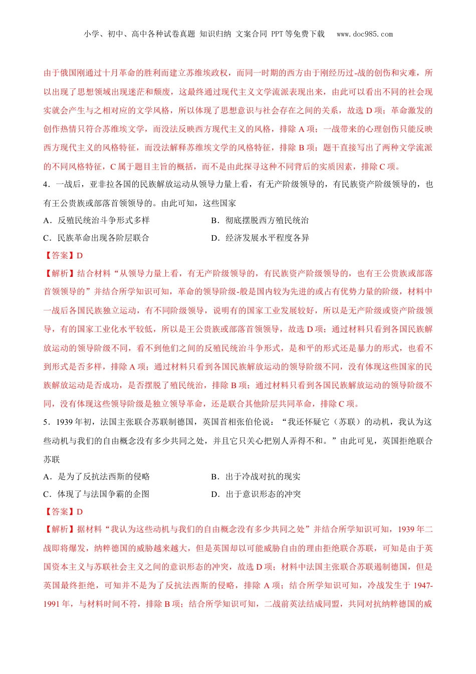 小学、初中、高中各种试卷真题知识归纳文案合同PPT等免费下载www.doc985.com专题19两次世界大战、十月革命和国际秩序的演变1.一战爆发后,法国总理和参众两院主席号召法国人民为“拯救文明、自由、法国和欧洲”而战。该号召A.延缓了战争的进程B.反映了人民的心声C.阐明了参战的目的D.掩盖了战争的性质【答案】D【解析】据所学可知,一战爆发的根本原因是西方资本主义国家政治、经济发展的不平衡性,而题干却认为是“拯救文明、自由、法国和欧洲”,据此可知,该号召掩盖了帝国主义争霸的性质,故选D项;据所学可知,法国的该号召加速了战争的进程,而不是“延缓”,排除A项;据题干中“法国总理和参众两院主席号召法国人民……”,可知该号召并没有反映人民的心声,排除B项;据所学可知,该号召仅是法国参加一战的借口,而不是其目的,排除C项。2.1926年9月25日,《国际联盟禁奴公约》将“完全消灭一切形式的奴役”作为固定目标,这也适用于《当代奴役问题委员会报告》中所列的其他奴役形式。1931年,国联设立了几个专家委员会,审议关于奴役的资料。国联的做法A.推动了战后世界和平B.彰显了人道主义精神C.使人权问题得以解决D.加强了国际间的合作【答案】B【解析】由材料“完全消灭一切形式的奴役”“国联设立了几个专家委员会,审议关于奴役的资料”可知国联对人权的尊重,体现出人道主义的精神,故选B项;由材料“这也适用于《当代奴役问题委员会报告》中所列的其他奴役形式”推动人权的解放,不等于推动了世界和平,排除A项;“得以解决”表述过于绝对,排除C项;材料中国联的做法不能体现出加强国际间的合作,逻辑推理错误,排除D项。3.十月革命之后不久,苏俄出现了“苏维埃文学”,其作品着重描写苏维埃政权在血与火中顽强诞生的过程及新政权建立后在各个方面的开创性业绩,表现无产阶级的战斗豪情,歌颂革命领袖和斗争英雄,揭露和鞭挞阶级敌人。这种浪漫主义的潮流与同一时期西方现代主义的迷茫和颓废形成鲜明对比。这体现出了A.革命激发的创作热情B.一战带来的心理创伤C.两种文学流派间的风格区别D.思想意识与社会存在的关系【答案】D【解析】“苏维埃文学”的特征是讴歌和弘扬无产阶级革命领袖和斗争英雄,揭露和鞭挞阶级敌人,这是小学、初中、高中各种试卷真题知识归纳文案合同PPT等免费下载www.doc985.com由于俄国刚通过十月革命的胜利而建立苏维埃政权,而同一时期的西方由于刚经历过-战的创伤和灾难,所以出现了思想领域出现迷茫和颓废,这最终通过现代主义文学流派表现出来,由此可以看出不同的社会现实就会产生与之相对应的文学风格,所以体现了思想意识与社会存在之间的关系,故选D项;革命激发的创作热情只符合苏维埃文学,而没法反映西方现代主义的风格,排除A项;一战带来的心理创伤只能反映西方现代主义的风格特征,而没法解释苏维埃文学的风格特征,排除B项;题干直接写出了两种文学流派的不同风格特征,C属于题目主旨的概括,而不是由此探寻这种不同背后的实质因素,排除C项。4.一战后,亚非拉各国的民族解放运动从领导力量上看,有无产阶级领导的,有民族资产阶级领导的,也有王公贵族或部落首领领导的。由此可知,这些国家A.反殖民统治斗争形式多样B.彻底摆脱西方殖民统治C.民族革命出现各阶层联合D.经济发展水平程度各异【答案】D【解析】结合材料“从领导力量上看,有无产阶级领导的,有民族资产阶级领导的,也有王公贵族或部落首领领导的”并结合所学知识可知,革命的领导阶级-般是国内较为先进的或占有优势力量的阶级,材料中一战后各国民族独立运动,有不同阶级领导,说明有的国家工业发展较好,所以是无产阶级或资产阶级领导,有的国家工业化水平较低,所以是王公贵族或部落首领领导,故选D项;通过材料只看到各国民族解放运动的领导阶级不同,看不到他们之间的反殖民统治斗争形式,是和平的形式还是暴力的形式,也看不到形式是否多样,排除A项;通过材料只看到各国民族解放运动的领导阶级不同,没有体现这些国家的民族解放运动是否成功,是否摆脱了殖民统治,排除B项;通过材料只看到各国民族解放运动的领导阶级不同,没有...