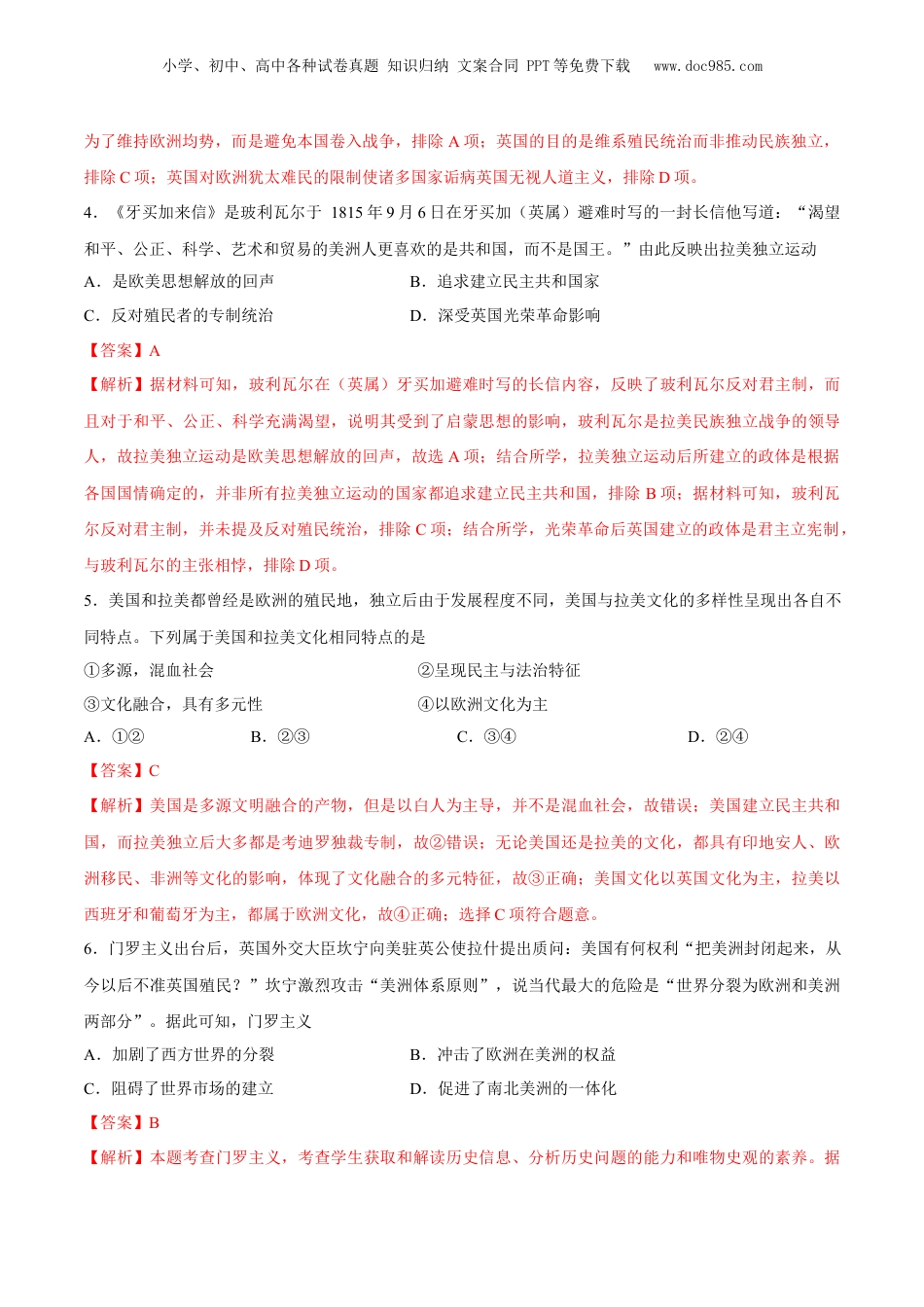 小学、初中、高中各种试卷真题知识归纳文案合同PPT等免费下载www.doc985.com专题18世界殖民体系和亚非拉民族解放运动1.18世纪前,西班牙帝国曾长期对美洲殖民地实行特有的“纵向主义”行政管理,规定每个殖民地的省份直接与西班牙联系,禁止殖民地之间任何的横向交往。这导致了A.价格革命的产生B.西属拉丁美洲的分裂C.重商主义的兴起D.世界殖民体系的形成【答案】B【解析】据材料可知,西班牙的“纵向主义”行政管理使西属拉美殖民地的经济联系较少,易导致西属拉丁美洲的矛盾、分裂,故选B项;“价格革命”是大量贵金属源源不断地流入欧洲,导致货币贬值、物价上涨、投机活跃,与题意关系不大,排除A项;“兴起”不合时空,重商主义兴起于15世纪,排除C项;世界殖民体系的形成在19世纪末20世纪初,与材料不符,排除D项。2.16世纪中期以后,在西属拉丁美洲,矿业经济快速发展起来,西班牙移民涌入,同时印第安人因疫病、殖民奴役而大量死亡。上述现象导致西属拉丁美洲A.资本原始积累加速B.种植园的发展空间增大C.经济的独立性增强D.逐渐退出黑人奴隶贸易【答案】B【解析】据材料可知,西班牙殖民者入侵拉丁美洲,印第安人大量死亡,为了解决劳动力不足问题,殖民者从非洲贩运大量黑人奴隶到美洲,这使得西属拉丁美洲种植园的发展空间增大,B项正确;早期殖民国家西班牙未进行资本的原始积累,排除A项;拉丁美洲沦为了殖民地,没有获得经济独立,排除C项;材料导致黑人奴隶贸易,而不是退出黑人奴隶贸易,排除D项,故诜B项。3.1939年5月,英国发表了关于巴勒斯坦地区问题的白皮书,规定未来5年到巴勒斯坦的犹太移民数量不能超过7.5万人,超过这一数字必须经过阿拉伯人的同意,并承诺10年后在巴勒斯坦成立一个以阿拉伯人为主体的独立国家。英国的表态意在A.示好德国以维持欧洲均势B.巩固在阿拉伯的殖民利益C.顺应民族独立的历史大势D.塑造积极正义的大国形象【答案】B【解析】本题考查列强的殖民统治。根据所学,一战后阿拉伯地区归属英国委任统治属于英国的半殖民地,英国为了笼终阿拉伯人,维系自己的殖民利益,限制犹太人前往阿拉伯,故选B项;英国对德绥靖并不是小学、初中、高中各种试卷真题知识归纳文案合同PPT等免费下载www.doc985.com为了维持欧洲均势,而是避免本国卷入战争,排除A项;英国的目的是维系殖民统治而非推动民族独立,排除C项;英国对欧洲犹太难民的限制使诸多国家诟病英国无视人道主义,排除D项。4.《牙买加来信》是玻利瓦尔于1815年9月6日在牙买加(英属)避难时写的一封长信他写道:“渴望和平、公正、科学、艺术和贸易的美洲人更喜欢的是共和国,而不是国王。”由此反映出拉美独立运动A.是欧美思想解放的回声B.追求建立民主共和国家C.反对殖民者的专制统治D.深受英国光荣革命影响【答案】A【解析】据材料可知,玻利瓦尔在(英属)牙买加避难时写的长信内容,反映了玻利瓦尔反对君主制,而且对于和平、公正、科学充满渴望,说明其受到了启蒙思想的影响,玻利瓦尔是拉美民族独立战争的领导人,故拉美独立运动是欧美思想解放的回声,故选A项;结合所学,拉美独立运动后所建立的政体是根据各国国情确定的,并非所有拉美独立运动的国家都追求建立民主共和国,排除B项;据材料可知,玻利瓦尔反对君主制,并未提及反对殖民统治,排除C项;结合所学,光荣革命后英国建立的政体是君主立宪制,与玻利瓦尔的主张相悖,排除D项。5.美国和拉美都曾经是欧洲的殖民地,独立后由于发展程度不同,美国与拉美文化的多样性呈现出各自不同特点。下列属于美国和拉美文化相同特点的是①多源,混血社会②呈现民主与法治特征③文化融合,具有多元性④以欧洲文化为主A.①②B.②③C.③④D.②④【答案】C【解析】美国是多源文明融合的产物,但是以白人为主导,并不是混血社会,故错误;美国建立民主共和国,而拉美独立后大多都是考迪罗独裁专制,故②错误;无论美国还是拉美的文化,都具有印地安人、欧洲移民、非洲等文化的影响,体现了文化融合的多元特征,故③正确;美国文化以英国文化为主,拉美以西班牙和葡萄牙为主,都属于欧洲文化,故④正确;选择C项...