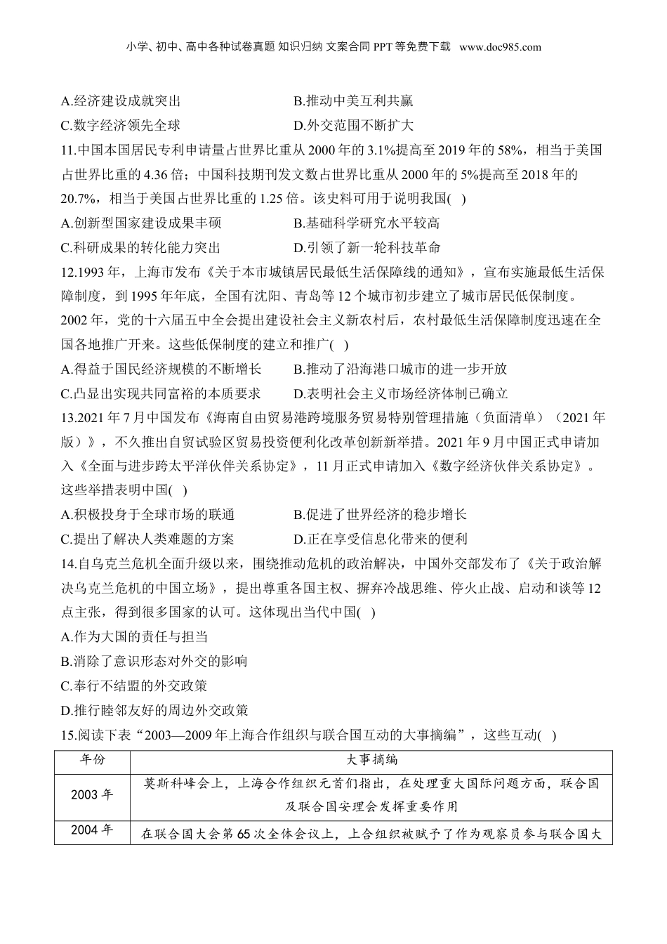 小学、初中、高中各种卷真知文案合同试题识归纳PPT等免下费载www.doc985.com(11)中国特色社会主义新时代【易混易错】▲中共十八大是在全面建成小康社会决定性阶段召开的重要大会,不久习近平提出中华民族伟大复兴的中国梦。▲中共十九大是在全面建成小康社会决胜阶段、中国特色社会主义进入新时代关键时期召开的重要大会。此思想是当代中国和21世纪的马克思主义,是中华文化和中国精神的时代精华,实现了马克思主义中国化时代化的新飞跃。▲中共二十大是全党全国各族人民迈上全面建设社会主义现代化国家新征程、向第二个百年奋斗目标进军的关键时刻召开的重要大会。【习题跟踪】1.党的十八大以来,注重建设相互尊重、公平正义、合作共赢的新型国际关系。通过加强“一带一路”的国际合作、建立亚洲基础设施投资银行等措施,构建人类命运共同体。习近平新时代外交思想的本质特征是()A.参与引领与改革完善全球治理体系B.构建全方位多层次立体化的外交布局C.注重建立大国间伙伴关系稳定世界D.坚持“亲诚惠容”理念深化周边合作2.中共十八大以来,中国与俄罗斯、法国、德国、英国等世界主要国家的关系稳步发展;推出多种新机制和新举措,深化同日本、韩国、东盟各国等周边国家的关系;提出“真实亲诚”理念,加强与非洲国家之间的团结合作。这表明中国()A.推动和平与发展成为当代世界主题B.开启建立国际政治经济新秩序步伐C.走出了一条中国特色大国外交新路D.注重巩固与发展和周边国家的关系3.中国共产党的十九大报告强调,赋予自由贸易试验区更大改革自主权,探索建设自由贸易港;创新对外投资方式,促进国际产能合作,形成面向全球的贸易、投融资、生产、服务网络。据此可知,十九大的这一报告()A.体现出中国作为大国的责任与担当B.表明世界经济区域集团化向纵深方向发展C.意在加强中国与发达国家间的团结D.旨在加快培育国际经济合作和竞争新优势4.《中华人民共和国民法典》之合同编针对电子商务和数字经济快速发展的情形,对电子合同的订立和履行等作了详细规定,明确新型交易规则。人格权编规定不得利用信息技术手段伪造等方式侵害他人的肖像权,确保新的生物技术、信息技术服务于人类发展的需要。这表明《中华人民共和国民法典》()A.构建了全新法制体系B.初步奠定了中国法治建设的基础小学、初中、高中各种卷真知文案合同试题识归纳PPT等免下费载www.doc985.comC.具有鲜明的时代特色D.全方位回应人民群众的民生关切5.2014年7月,在国际关系中践行正确的义利观问题上,习近平强调,“国不以利为利,以义为利也,要讲信义、重情义、扬正义、树道义。在国际合作中,要注重利,更要注重义。中国外交要做好对外援助工作,真正做到义融利”。由材料可知,习近平总书记的外交思想()A.始终把正确的义利观放在第一位B.彰显出中华优秀传统文化的魅力C.继续坚持独立自主的和平外交D.开始重视人类命运共同体的构建6.1982年党的十二大提出“计划经济为主,市场经济为辅”,1992年党的十四大提出建立社会主义市场经济体制的目标,2022年党的二十大报告作出构建“高水平的社会主义市场经济体制”的战略部署。这体现了()A.中国特色社会主义理论的发展B.发展经济的手段具有灵活性C.国家工作重心与时俱进地转移D.中华民族实现了伟大复兴7.我国坚持精准扶贫、尽锐出战,打赢了人类历史上规模最大的脱贫攻坚战,全国832个贫困县全部摘帽,近1亿农村贫困人口实现脱贫。脱贫群众不愁吃、不愁穿,义务教育、基本医疗、住房安全有保障。绝对贫困问题得到历史性的解决。这体现了()A.中国进入全面建设社会主义时期B.农村经济体制改革取得了突破C.中国特色社会主义新时代的成就D.中国国际影响力的不断扩大8.2023年9月7日,习近平总书记在新时代推动东北全面振兴座谈会上强调,要以科技创新推动产业创新,加快构建具有东北特色优势的现代化产业体系。推动东北全面振兴,根基在实体经济,关键在科技创新,方向是产业升级。要牢牢扭住自主创新这个“牛鼻子”,在巩固存量、拓展增量、延伸产业链、提高附加值上下功夫。这说明新时代的东北()A.已经成为引领全国科技创新的地区B.率先实现中华民族伟大复兴的中国梦C...