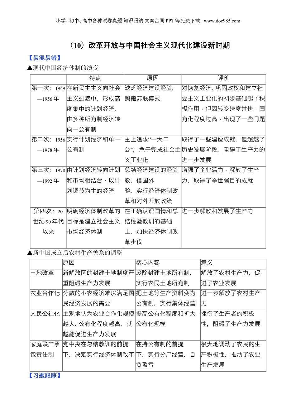 小学、初中、高中各种卷真知文案合同试题识归纳PPT等免下费载www.doc985.com(10)改革开放与中国社会主代化建新期义现设时【易混易错】▲现代中国经济体制的演变特点原因价评第一次:1949—1956年在新民主主向社会义主渡中,形成高义过度集中的划,计经济由多种所有制经济转向一公有制缺乏建,经济设经验照搬模式苏联恢复、巩固政权和建立社对经济会主义工业化的初步基础起了积极作用,但因转变速度过快,国有化程度过高,出现了一些问题第二次:1956—1978年行划和一实计经济单公有制“主上追求一大二”公,急于完成社会主义工业化取得了一些建成就,但超越了设史展段,阻碍了生力的历发阶产一步展进发第三次:1978—1992年由划向划计经济转计和市场相结合、以计划主的调节为经济总结经济建设的经验教,借国外,行体制改验实经济革和外开放政策对增强了企业活力,解放了生产力,取得了世瞩目的成就举第四次:20世纪90年代以来明确体制改革的经济目是建立社会主标义市体制场经济在正确国情和认识总教的基结经验训础上,加快体制改经济革步伐进一步解放和发展了生产力▲新中国成立后农村生产关系的调整原因核心内容意义土地改革新解放区的封建土地制度严重阻碍生力展产发除封建土地所有制,废实行农民土地所有制解放了村生力,促农产了展进农业发农业合作化分散的小以足国农经济难满民展的需要经济发把土地等生产资料变为公有制,行集体实经营进一步解放了农村生产力人民公社化主地合作化模观认为农业规越大、公有化程度越高,就越能促生力展进产发提高公有化程度和大扩公有化模规挫了生者的极伤产积性,阻碍了生力展产发家庭联产承包责任制党中央在教的前提总结训下,决定行体制改革实经济在持公有制的前提下,行分,自实户经营盈负亏极大地了民的生调动农极性,推了产积动农业生展产发【习题跟踪】小学、初中、高中各种卷真知文案合同试题识归纳PPT等免下费载www.doc985.com1.据统计,1979年至1982年,全国共制定、颁布355件地方性法规,其中经济领域占37.2%。依据地方立法的运行实践,八二宪法在肯定1979年《地方组织法》的基础上,对中央和地方立法权限进行了重新配置。就国家立法而言,全国人大及其常委会行使国家立法权,但不是唯一立法机关。这表明我国()A.依法治国原则得到有效落实B.民主法制建设顺应时代发展需求C.国家资源配置形式出现转型D.基层民主建设范围得以不断扩展2.1982年宪法在总纲中提出“在法律规定范围内的城乡劳动者个体经济,是社会主义公有制经济的补充”并起到“市场调节的辅助作用”,规定“实行各种形式的社会主义责任制,改进劳动组织,以不断提高劳动生产率和经济效益”。由此可见,1982年宪法()A.确立了经济体制改革的目标B.承认了市场机制的存在C.明确了国有企业改革的方向D.否定了计划经济的作用3.1978年9月,邓小平在视察东北三省时强调,“我们关起门来不行,不动脑筋永远陷于落后不行。一定要根据现在的有利条件加速发展生产力,使人民的生活好一些。”这表明他()A.开辟了社会主义建设的新道路B.推动中国社会发展进入新阶段C.发展了社会主义本质的新观点D.初步形成了加快发展的新思路4.1979年以前,广东蕉岭县各公社有社队企业,但规模不大,一般为本社队需要而经营。改革开放之后,这些企业广泛推行经营承包责任制,自找市场、自负盈亏,逐步发展为多成分、多层次和多形式的乡镇企业群体。这反映了()A.城市经济体制改革取得了突破B.经济体制改革激发了企业活力C.企业所有制性质发生根本改变D.外向型经济发展模式趋于成熟5.20世纪80年代初,洛阳轴承厂在北京、上海等地设立了经销处。各经销处按季度向洛阳轴承厂提供市场动态、行情和用户对产品的意见,推动轴承销售数量大大增加。由此可知,当时我国()A.市场经济体制初步确立B.对外开放领域逐步扩大C.现代企业制度已经建立D.传统经济模式已被突破6.20世纪80年代后期,承包制在国有企业中广泛推行。下图所示是1988-1990年中国国有企业亏损额和亏损面(亏损企业数占企业总数的比重)情况。这反映出当时()小学、初中、高中各种卷真知文案合同试题识归纳PPT等免下费载www.doc985.comA.国民经济结...