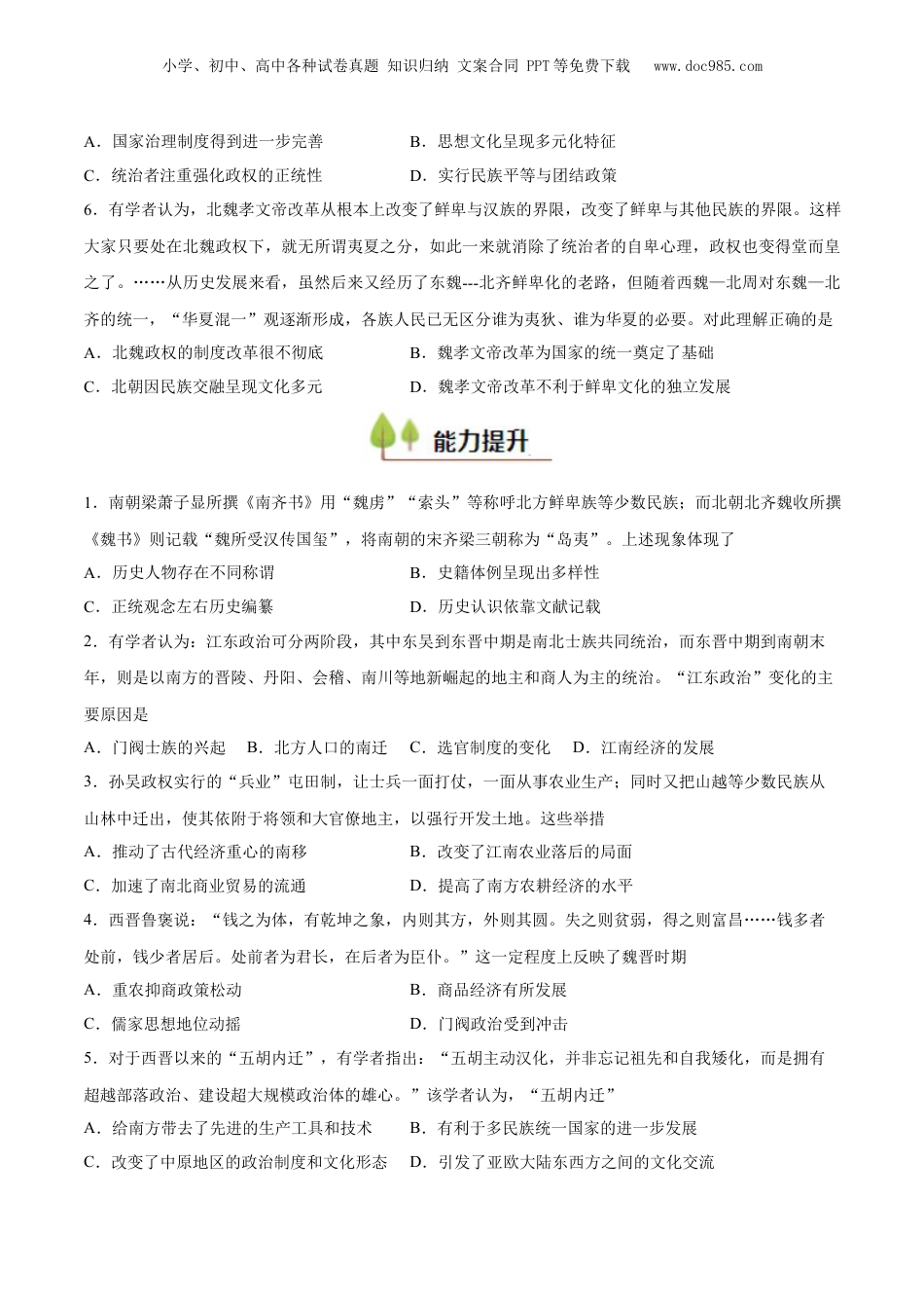 小学、初中、高中各种试卷真题知识归纳文案合同PPT等免费下载www.doc985.com专题03三国两晋南北朝的民族交融1.下面是从一部《魏晋南北朝史》的“大事年表”中摘录的几条,按时间先后顺序排列正确的是①……正月,魏定族姓,清流品。改拓跋氏为元,其余鲜卑复姓均改。②……三月,王濬自武昌顺流直下建业。吴主孙皓投降,吴亡。中国再度统一。③……四月,刘备即帝位,改元,是为汉昭烈帝,史称蜀汉。④……八月,秦诏分道南征,图谋灭晋。十一月,晋谢石等于淝水大破秦军。A.①②③④B.①③②④C.③②④①D.③④①②2.魏晋南北朝时期土地国有制形式大行其道,比如曹魏的大规模屯田,但这是战时体制的产物。在社会相对安定后,西晋占田制的推行逐渐回归到土地私有。北魏推行的均田制,也不得不加入一些土地私有的内容。由此可知,这一时期的土地私有A.加速了土地兼并的蔓延B.调动了农民的生产积极性C.更符合当时的社会需求D.是生产力发展的必然趋势3.三国两晋南北朝包括三国、西晋、东晋十六国、南北朝几个阶段,下列选项符合三国两晋南北朝时期历史特征的是①战火连绵,政局动荡,社会经济在曲折中仍有发展②数百年分裂局面是由于中央对地方的控制严重削弱③汉族与内迁边疆民族在冲突与交往中逐步走向交融④南方的开发初见成效,文化领域也有不少重要成果A.①②③B.①②④C.①③④D.②③④4.东晋时期,政府为了照顾因战乱南渡士民,在长江南北和梁益通路设置侨州郡县安置侨人,并将“侨户”与当地土著户籍分列,“不以黄籍籍之,而以白籍,谓以白纸为籍,以别于江左旧来土著也”,并且不向国家纳租服役。这一政策A.影响了政府的赋税收入B.有利于江南农业生产恢复C.激化了南北方民族矛盾D.促进区域间经济文化交流5.北魏太武帝太平真君七年(446年)四月戊子,于“邺城毁五层佛图,于泥像中得玉玺二,其文皆曰:‘受命于天,既寿永昌’,‘魏所受汉传国玺’。”另据考古发现,北魏迁都洛阳后其主要建筑的规模、位置和名称等与魏晋一致。这反映出当时小学、初中、高中各种试卷真题知识归纳文案合同PPT等免费下载www.doc985.comA.国家治理制度得到进一步完善B.思想文化呈现多元化特征C.统治者注重强化政权的正统性D.实行民族平等与团结政策6.有学者认为,北魏孝文帝改革从根本上改变了鲜卑与汉族的界限,改变了鲜卑与其他民族的界限。这样大家只要处在北魏政权下,就无所谓夷夏之分,如此一来就消除了统治者的自卑心理,政权也变得堂而皇之了。……从历史发展来看,虽然后来又经历了东魏---北齐鲜卑化的老路,但随着西魏—北周对东魏—北齐的统一,“华夏混一”观逐渐形成,各族人民已无区分谁为夷狄、谁为华夏的必要。对此理解正确的是A.北魏政权的制度改革很不彻底B.魏孝文帝改革为国家的统一奠定了基础C.北朝因民族交融呈现文化多元D.魏孝文帝改革不利于鲜卑文化的独立发展1.南朝梁萧子显所撰《南齐书》用“魏虏”“索头”等称呼北方鲜卑族等少数民族;而北朝北齐魏收所撰《魏书》则记载“魏所受汉传国玺”,将南朝的宋齐梁三朝称为“岛夷”。上述现象体现了A.历史人物存在不同称谓B.史籍体例呈现出多样性C.正统观念左右历史编纂D.历史认识依靠文献记载2.有学者认为:江东政治可分两阶段,其中东吴到东晋中期是南北士族共同统治,而东晋中期到南朝末年,则是以南方的晋陵、丹阳、会稽、南川等地新崛起的地主和商人为主的统治。“江东政治”变化的主要原因是A.门阀士族的兴起B.北方人口的南迁C.选官制度的变化D.江南经济的发展3.孙吴政权实行的“兵业”屯田制,让士兵一面打仗,一面从事农业生产;同时又把山越等少数民族从山林中迁出,使其依附于将领和大官僚地主,以强行开发土地。这些举措A.推动了古代经济重心的南移B.改变了江南农业落后的局面C.加速了南北商业贸易的流通D.提高了南方农耕经济的水平4.西晋鲁褒说:“钱之为体,有乾坤之象,内则其方,外则其圆。失之则贫弱,得之则富昌……钱多者处前,钱少者居后。处前者为君长,在后者为臣仆。”这一定程度上反映了魏晋时期A.重农抑商政策松动B.商品经济有所发展C.儒家思想...