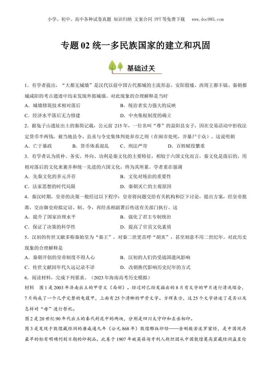 小学、初中、高中各种试卷真题知识归纳文案合同PPT等免费下载www.doc985.com专题02统一多民族国家的建立和巩固1.有学者提出,“大都无城墙”是汉代以前中国古代都城的主流形态。安阳殷墟、西周王都丰镐、秦朝都城咸阳的考古遗迹中均未发现外郭城墙。对此现象的合理解释是当时A.城墙修筑技术相对落后B.统治者实力强大的反映C.经济水平落后无力修建D.中央集权制度的确立2.据兔子山遗址出土的秦简记载,公元前215年,一位名叫“尊”的益阳县女子,因在交易活动中拒收法定货币半两钱,被当地县令、县丞与令史集体判处弃市之刑(在闹市处死,并暴尸于众)。这说明朝A.亡于暴政B.货币体系混乱C.刑法严苛D.百姓赋役繁重3.有学者认为质朴、务实、外向、功利是秦文化的主要特征,相较于六国文化而言,秦文化是落后的,用相对落后的文化来兼并和统一先进的六国文化,终为其所累。学者重在强调A.先秦文化的多元并存B.文化对统治的重要性C.法家思想的时代局限D.秦朝灭亡的主观原因4.秦汉时期,皇帝的决策一般经过以下程序:皇帝将问题交给有关机构和臣下讨论,提出方案,经皇帝批准,交由御史府拟定诏、制、令,再经丞相副署后传送有关部门执行。这A.提升了国家治理水平B.强化了君主专制统治C.保证了决策的科学性D.提高了官员文化素质5.汉初的传世文献多称秦始皇为“秦王”,对秦二世更直呼“胡亥”,甚至刻意不用二世纪年。对此历史现象的合理解释是A.秦朝开创的皇帝制度不得人心B.汉初的人们仍受战国遗风影响C.传世文献因年代久远记录不详D.改朝换代影响历史纪年的方式6.阅读材料,完成下列要求。(2023年海南高考历史模拟)材料图1是2003年济南出土的甲骨文(局部)。经过对已经发掘出的8片有文字的甲片进行清洗缀合,7片构成了一个几乎完整的龟腹甲,上面有25个清晰的甲骨文字。方辉表示,这25个文字讲述了是否以及怎样对“母”进行祭祀。图2是20世纪90年代出土的秦代封泥中的两块,分别是四川太守印和左丞相印。图3是发现于敦煌藏经洞的唐咸通九年(公元868年)敦煌雕版印经——金刚般若波罗蜜经,是中国现存最早的标有明确刊刻日期的印刷品。此卷于1907年被英籍匈牙利人斯坦因从中国敦煌莫高窟藏经洞盗至伦小学、初中、高中各种试卷真题知识归纳文案合同PPT等免费下载www.doc985.com敦,现藏大英图书馆。出土文物大都蕴含着丰富的历史信息。选取上述材料中的一个或多个图片.就其蕴含的历史信息,提出一个论题,并予以阐述。(要求:论题明确,持论有据,逻辑合理,论证充分,表达清晰。)1.据秦简记载,秦代君主下“制书”或臣下“受制”问询、议论,都要制作“簿”书,写明制书“初到初受”的部门以及“上”的年月日、官府“别留”的天数、“传留”情况,并与回复的“对”一起呈上。据此可知秦代()A.户籍管理十分严格B.官僚体系效率低下C.基层治理流于形式D.行政运作趋于规范2.据《后汉书·南蛮传》记载,秦昭王对巴蜀地区的板楯蛮夷实行过“顷田不租,十妻不算”的优待政策。汉朝历代皇帝和郡县长官也大多强调重农,特别是在农耕不发达的边疆地区。这些措施A.实现了对少数民族地区的有效治理B.促进了边疆地区与内地的友好交流交融C.表明秦汉时期重视边疆地区的治理D.推动了统一多民族封建国家疆域的开拓3.读图:小学、初中、高中各种试卷真题知识归纳文案合同PPT等免费下载www.doc985.com秦郡形势图据图2可推知当时A.南北方人口与经济水平存在差距B.黄河流域社会动荡及战争频繁C.南方地区郡县势力逐渐超过北方D.郡县制的实施引发了新的矛盾4.表秦朝道路的种类及用途种类用途道驰咸通向全各主要方向的交通干阳国线直道直通抗匈奴前九原郡的道路击线新道通向岭南的道路五尺道在西南山修筑的道路区这些道路的修建A.旨在加强中央对地方的控制B.维护了秦朝的长期统一C.保证了秦代经济的高度发展D.有利于消除地区间差异5.据《后汉书·南蛮传》记载,秦昭王对巴蜀地区的板楯蛮夷实行过“顷田不租,十妻不算”的优待政策。汉朝历代皇帝和郡县长官也大多强调重农,特别是在农耕不发达的边疆地区。这些措施A.实现了对少数民族地区的有效治理B...