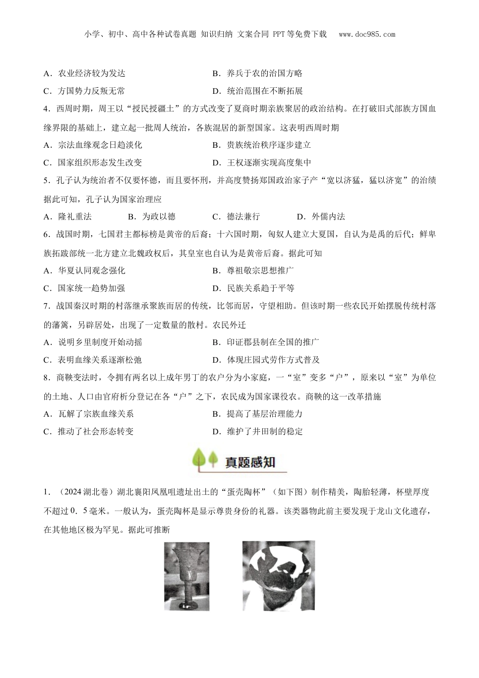 小学、初中、高中各种试卷真题知识归纳文案合同PPT等免费下载www.doc985.com专题01中华文明的起源和奠基1.下图为《2006—2013年良渚古城考古的主要收获》一书中的良渚古城考古平面示意图。据此可知,下列说法最为准确的是A.体现了中华文明多元一体的特征B.反映了母系氏族社会的村落景象C.可以佐证新石器晚期阶级分化日益明显D.表明早期中国已具备较完善的国家形态2.央视热播的《舌尖上的中国2·时节》展现了不少中国传统美食的生产、加工工艺。假设该剧组想拍摄有关我国最早种植水稻的专题片,你认为最符合拍摄要求的外景地是A.元谋人遗址B.北京人遗址C.河姆渡遗址D.大汶口遗址3.如图为浙江杭州严家桥良渚文化遗址出土的距今约4000年的双钱结藤编残件图。它体现了A.历史传承与民族认同的统一B.社会组织的复杂C.劳动技能与艺术审美的结合D.等级秩序的确立4.春秋战国时期,诸子百家“蜂出并作,各引一端”,促成这一时期文化繁荣的最重要原因是()小学、初中、高中各种试卷真题知识归纳文案合同PPT等免费下载www.doc985.comA.社会大变革B.经济的发展C.政治剧变D.统治阶级的提倡5.西周建立后,“封建亲戚”,将亲族、功臣等分封到全国各地建立诸侯国。据此可知A.儒学文化被广泛传播B.多民族统一国家建立C.分封制旨在以藩屏周D.中原是周文化发源地6.“华夏”本义指衣冠华美又重礼仪。华夏作为文化、政治实体,被周边民族认同、各族同源共祖的观念得到发展是在()A.西周时期B.春秋战国时期C.秦汉时期D.五代十国时期1.在浙江浦江发现的距今11000-9000年的文化遗址,面积达2万平方米,发现有深70厘米的储藏窖穴、干栏式建筑柱洞、许多陶器、磨制石器等;陶器中夹杂大量驯化水稻颖壳;还出土碳化稻米、稻壳、小穗轴等,样品总量达5万余个。以上考古发现①说明长期定居的聚落出现②反映农业和畜牧业的分工③证实中国稻作农业的起源④体现社会的等级礼仪制度A.①②B.③④C.①③D.②④2.在1979年发表的论文《广汉出土的玉石器》中将三星堆遗址视为“古代蜀国一个重要的政治中心”。下列考古成果最能支持这一观点的是A.三星堆发现大量的高品级的器物带有明显礼仪或礼制特征B.研究发现三星堆可能在成都平原的对外交流中处于枢纽地位C.三星堆发掘出土的人像、金杖、金面星等造型前所未见D.三星堆遗址处在川西平原北部商周遗存的分布中心上3.田猎是商王及贵族的经常性活动,具有保护农业生产、逸乐、祭祀及军事训练等多重功利性质。如图是学者把卜辞地名出现频率较高的田猎地联系在一起,构建的商代田猎地分布网络图。它反映出商代小学、初中、高中各种试卷真题知识归纳文案合同PPT等免费下载www.doc985.comA.农业经济较为发达B.养兵于农的治国方略C.方国势力反叛无常D.统治范围在不断拓展4.西周时期,周王以“授民授疆土”的方式改变了夏商时期亲族聚居的政治结构。在打破旧式部族方国血缘界限的基础上,建立起一批周人统治,各族混居的新型国家。这表明西周时期A.宗法血缘观念日趋淡化B.贵族统治秩序逐步建立C.国家组织形态发生改变D.王权逐渐实现高度集中5.孔子认为统治者不仅要怀德,而且要怀刑,并高度赞扬郑国政治家子产“宽以济猛,猛以济宽”的治绩据此可知,孔子认为国家治理应A.隆礼重法B.为政以德C.德法兼行D.外儒内法6.战国时期,七国君主都标榜是黄帝的后裔;十六国时期,匈奴人建立大夏国,自认为是禹的后代;鲜卑族拓跋部统一北方建立北魏政权后,其皇室也自认为是黄帝后裔。据此可知A.华夏认同观念强化B.尊祖敬宗思想推广C.国家统一趋势加强D.民族关系趋于平等7.战国秦汉时期的村落继承聚族而居的传统,比邻而居,守望相助。但该时期一些农民开始摆脱传统村落的藩篱,另辟居处,出现了一定数量的散村。农民外迁A.说明乡里制度开始动摇B.印证郡县制在全国的推广C.表明血缘关系逐渐松弛D.体现庄园式劳作方式普及8.商鞅变法时,令拥有两名以上成年男丁的农户分为小家庭,一“室”变多“户”,原来以“室”为单位的土地、人口由官府析分登记在各“户”之下,农民成为国家课役农。商鞅的这一改革措施A.瓦解了宗...