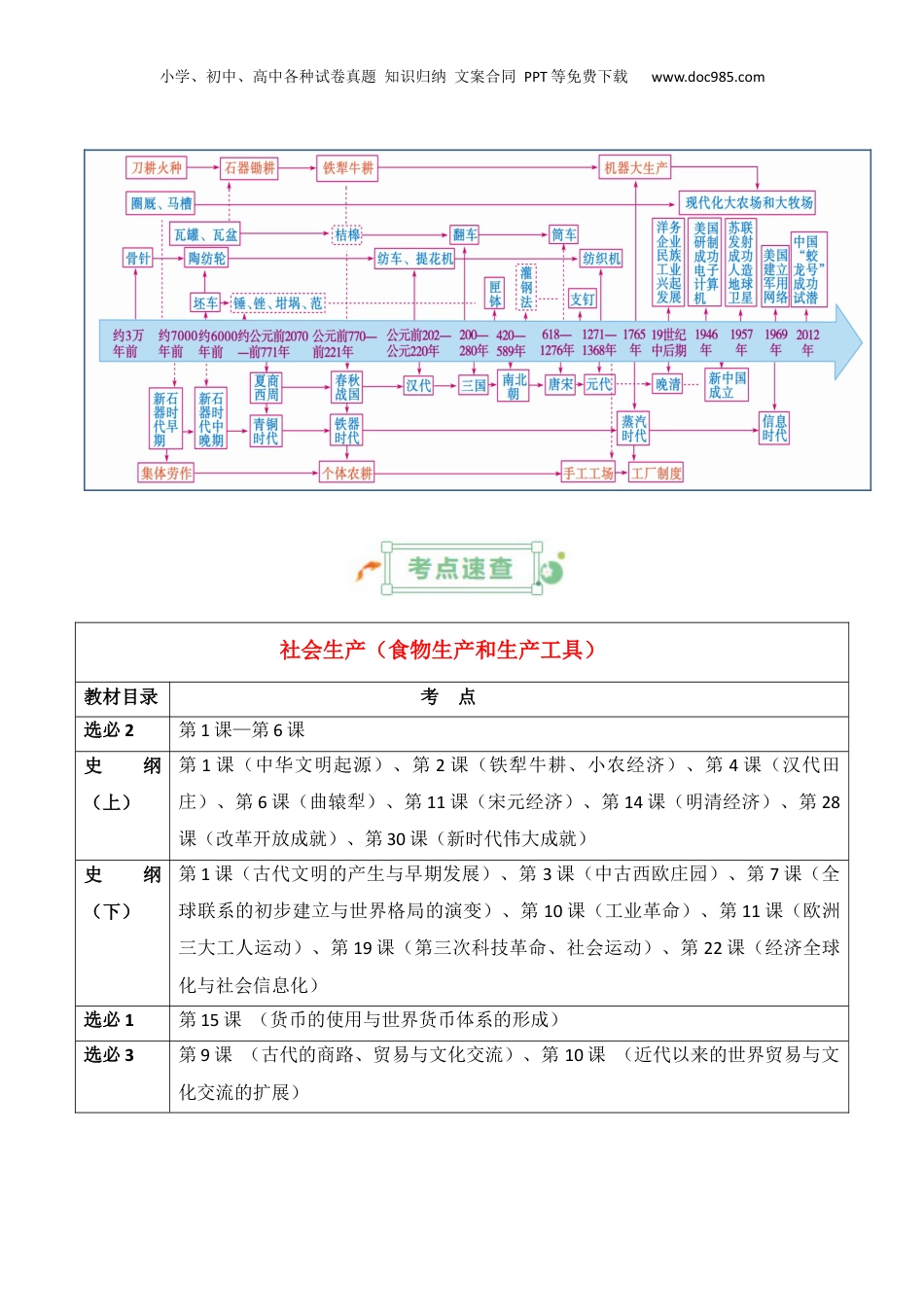 小学、初中、高中各种试卷真题知识归纳文案合同PPT等免费下载www.doc985.com专题16社会生产(食物生产和生产工具)(时空观念+考点速查+考点梳理+易错点拨+重难考点辨析)小学、初中、高中各种试卷真题知识归纳文案合同PPT等免费下载www.doc985.com社会生产(食物生产和生产工具)教材目录考点选必2第1课—第6课史纲(上)第1课(中华文明起源)、第2课(铁犁牛耕、小农经济)、第4课(汉代田庄)、第6课(曲辕犁)、第11课(宋元经济)、第14课(明清经济)、第28课(改革开放成就)、第30课(新时代伟大成就)史纲(下)第1课(古代文明的产生与早期发展)、第3课(中古西欧庄园)、第7课(全球联系的初步建立与世界格局的演变)、第10课(工业革命)、第11课(欧洲三大工人运动)、第19课(第三次科技革命、社会运动)、第22课(经济全球化与社会信息化)选必1第15课(货币的使用与世界货币体系的形成)选必3第9课(古代的商路、贸易与文化交流)、第10课(近代以来的世界贸易与文化交流的扩展)小学、初中、高中各种试卷真题知识归纳文案合同PPT等免费下载www.doc985.com知识点1从食物采集到食物生产人类早期的生产与生活1.采集渔猎(1)时间:远古时期。(2)表现:人们使用木、骨和石等材料制作的工具从事采集和渔猎,在一定的地域范围内过着迁徙的生活。2.原始农业(1)时间:大约1万年前,原始的农耕和畜牧出现。(2)表现原始农业原始畜牧业东亚黄河中上游是粟的发源地;长江中下游最早种植水稻8500年前贾湖居民已经饲养猪,7000年前河姆渡居民已经饲养猪和狗西亚小亚细亚半岛南部是小麦、大麦的原产地9000年前,饲养绵羊和山羊美洲玉米、甘薯的原产地6000年前,南美印第安人驯化了骆马3.农业出现的意义(1)是人类经济和社会生活上第一次革命,人类开始从食物采集者转变为食物生产者。(2)促进了生活和生产方式的变化。人类从迁徒过渡到定居,从临时窝棚到长期住所,并逐渐形成聚落。开始出现手工业劳动,文化艺术获得发展。(3)推动了科学技术的发展。天文历法、数学和其他学科逐渐发展。不同地区的食物生地区农作物和牲畜社会生活古巴比伦小麦、大麦;绵羊、山羊、牛①王室和神庙拥有很多土地,政府官员、贵族、商人等也拥有土地,他们合伙经营或将土地出租给佃户。小学、初中、高中各种试卷真题知识归纳文案合同PPT等免费下载www.doc985.com产与社会生活②颁布《汉谟拉比法典》古埃及①土地主要由王室和神庙占有。②以尼罗河为中心的农业体系决定了整个古埃及的命运。古代中国水稻、粟、猪、狗①古代中国主要分为北方粟麦农业区和南方稻作农业区②小农经济;精耕细作;重农抑商;兴修水利古希腊小麦、大麦、葡萄、橄榄谷物与蔬菜轮作公民:拥有土地、奴隶劳动斯巴达:将征服的希洛人全部变为奴隶,让他们承担所有的农业劳动。古罗马谷物、橄榄、葡萄土地国有,人们以家庭为单位进行生产。随着征服扩张,贵族或富人获得了越来越多的土地,而小农却逐渐破产。中美洲(阿兹特克文明)玉米、甘薯、马铃薯、骆马(南美洲印第安人)阿斯特克人的土地除了贵族私有的部分外村社的公有土地,每个家庭的主人可以获得一块份地并终身使用。为了充分利用资源,两年不耕作的土地将被村社收回。“浮动园地”认识:中外各地区物质文明的发展不是同步和统一的,由于地理条件、历史因素、社会环境等方面的差异,经济和社会活动各具特色。生产关系的变化1.男女地位的变化:农业产生以后,男子开始在生产中占据主导地位;妇女主要从事家务劳动和家庭副业,女子在农业生产中逐渐退居从属地位。2.私有财产的出现(1)根本原因:生产力发展,人类生产的产品有了剩余。(2)表现:氏族部落的首领利用自己的权力,把一些集体财物据为己有,变成私有财产。(3)影响:氏族内部出现了贫富分化。3.产生阶级差别:在氏族社会中,因战争而出现了自由民和奴隶的差别。小学、初中、高中各种试卷真题知识归纳文案合同PPT等免费下载www.doc985.com4.国家的产生:调节阶级之间的利益冲突。【易错点拨01】文明的产生(1)文明的标志:阶级、国家、文字、城市(2)文明产生前提:最初的农业和畜牧业逐渐发展并传播开来(3)文明产生...