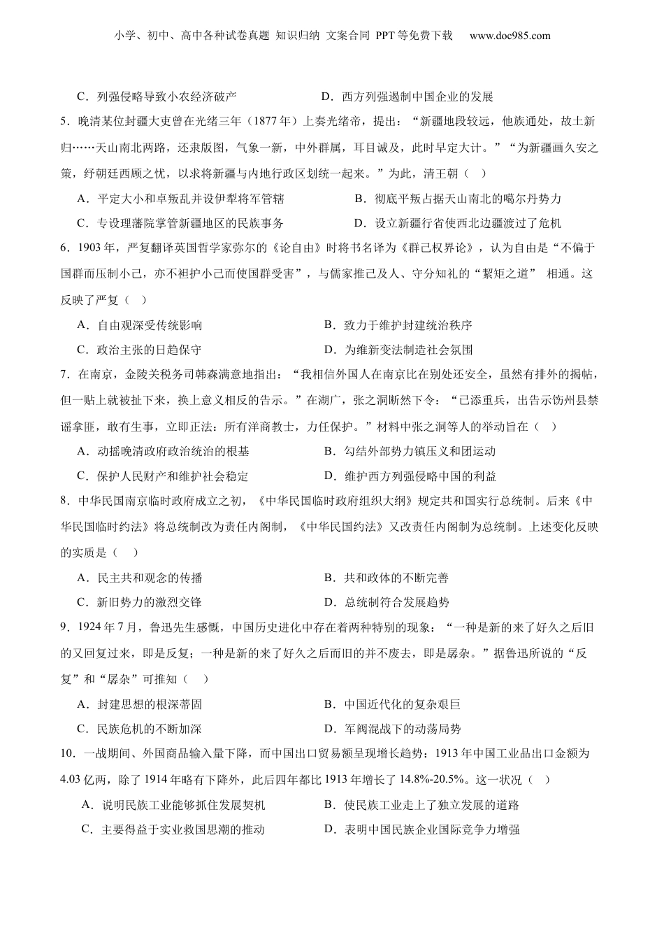 小学、初中、高中各种试卷真题知识归纳文案合同PPT等免费下载www.doc985.com中国近代史阶段性检测01(考试时间:75分钟试卷满分:100分)一、选择题:共16小题,每小题3分,共48分,在每小题给出的四个选项中,只有一个最符合题目要求。1.1843年,英国下院议员托马斯·斯当东说道:“在1840年那时候,‘在中国沿岸的船只或个人可能犯有走私行为,但这不能使中国当局对在该口岸的整个英国社团施行强暴成为正当,甚至不能减轻其罪行,所以,为了维护我们在中国的荣誉和利益,以适当的武力作为支持,要求充分的赔偿,是绝对有必要的。但我从没有否认事实,即如果没有鸦片走私,就不会有战争’。”这说明()A.鸦片走私只是个别行为B.没有鸦片走私就不会有侵华战争C.英国维护自身利益正当D.英国以炮舰政策支持其市场扩张2.徐继畬所著的《瀛寰志略》除了对世界各国风土人情的介绍,对于西方民主制度也进行了介绍,而这在中国历史上是前所未有的,如介绍英国的国会制度时,指出“公会所(议会),分为爵房(上院)、乡绅房(下院),国有大事,王谕相,相告爵房,聚众公议,参以条例,决其可否;复转告乡绅房,必乡绅大众允诺而后行。否则,勿论。”材料说明徐继畬()A.主张摒弃传统的华夷观念B.学习西方长技进入实践阶段C.倡导效仿西方的制度变革D.站在时代前沿反思君主专制3.太平天国战争结束后,消廷和江宁将军都急欲恢复江南驻防旗营旧制。但地方督抚不愿以地方财政来供养驻防八旗,常以资金匮乏为由拖延执行清廷的谕令,敷衍江宁将军的重建要求,直到光绪二十四年江南驻防旗营旧制也未能完全恢复。地方督抚的行为反映出()A.清末中央财政权力的下移B.清廷失去了对地方的控制C.官办军事工业资本积累不足D.江南旗营驻防地区经济萧条4.下面是1873—1874年上海轮船招商局至汉口等地航线运费降幅表。对此认识正确的是()目的地汉口宁波天津汕头广东1873年4两2.5元6钱2钱3钱或2钱1874年2两1元或0.5元4钱或3钱1.2钱或1钱1.5钱或1.5角降幅50%60%—80%33.3%—50%40%—50%25%—50%A.轮船招商局的经营方式滞后B.社会的动荡影响长途贩运贸易小学、初中、高中各种试卷真题知识归纳文案合同PPT等免费下载www.doc985.comC.列强侵略导致小农经济破产D.西方列强遏制中国企业的发展5.晚清某位封疆大吏曾在光绪三年(1877年)上奏光绪帝,提出:“新疆地段较远,他族通处,故土新归……天山南北两路,还隶版图,气象一新,中外群属,耳目诚及,此时早定大计。”“为新疆画久安之策,纾朝廷西顾之忧,以求将新疆与内地行政区划统一起来。”为此,清王朝()A.平定大小和卓叛乱并设伊犁将军管辖B.彻底平叛占据天山南北的噶尔丹势力C.专设理藩院掌管新疆地区的民族事务D.设立新疆行省使西北边疆渡过了危机6.1903年,严复翻译英国哲学家弥尔的《论自由》时将书名译为《群己权界论》,认为自由是“不偏于国群而压制小己,亦不袒护小己而使国群受害”,与儒家推己及人、守分知礼的“絜矩之道”相通。这反映了严复()A.自由观深受传统影响B.致力于维护封建统治秩序C.政治主张的日趋保守D.为维新变法制造社会氛围7.在南京,金陵关税务司韩森满意地指出:“我相信外国人在南京比在别处还安全,虽然有排外的揭帖,但一贴上就被扯下来,换上意义相反的告示。”在湖广,张之洞断然下令:“已添重兵,出告示饬州县禁谣拿匪,敢有生事,立即正法:所有洋商教士,力任保护。”材料中张之洞等人的举动旨在()A.动摇晚清政府政治统治的根基B.勾结外部势力镇压义和团运动C.保护人民财产和维护社会稳定D.维护西方列强侵略中国的利益8.中华民国南京临时政府成立之初,《中华民国临时政府组织大纲》规定共和国实行总统制。后来《中华民国临时约法》将总统制改为责任内阁制,《中华民国约法》又改责任内阁制为总统制。上述变化反映的实质是()A.民主共和观念的传播B.共和政体的不断完善C.新旧势力的激烈交锋D.总统制符合发展趋势9.1924年7月,鲁迅先生感慨,中国历史进化中存在着两种特别的现象:“一种是新的来了好久之后旧的又回复过来,即是反复;一种是新的来了好久之后而旧的并...